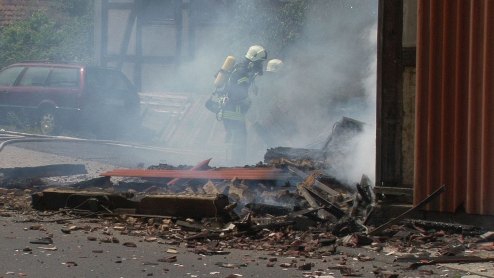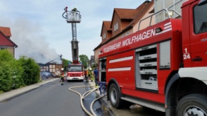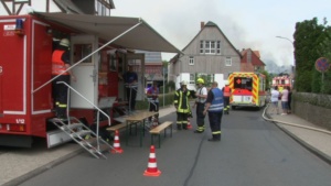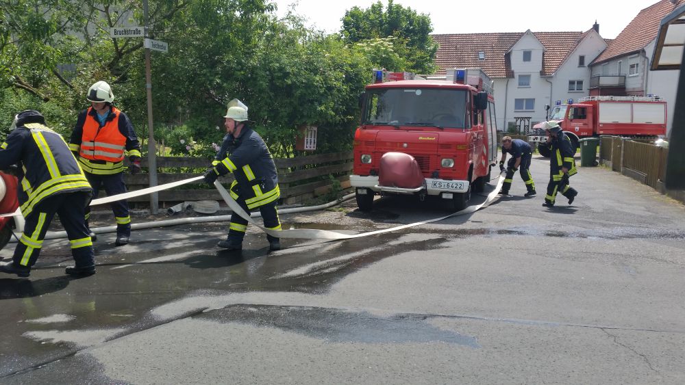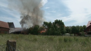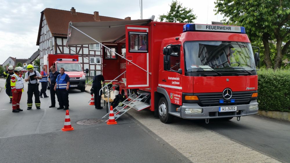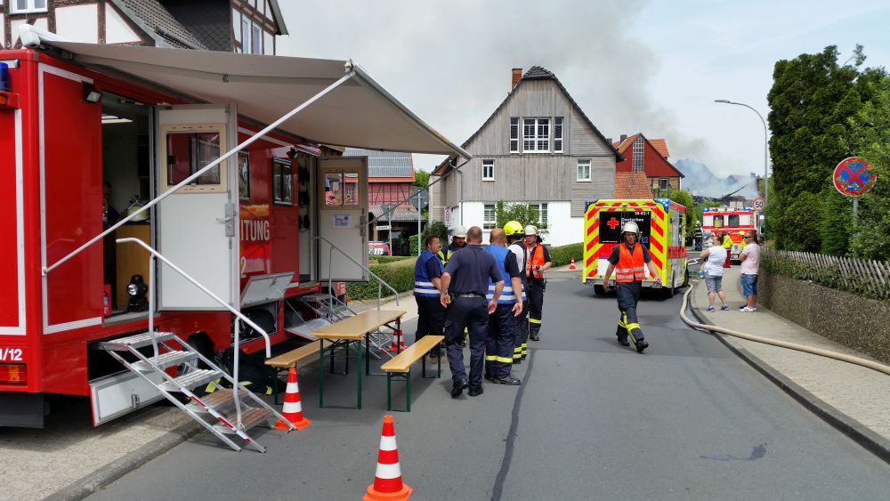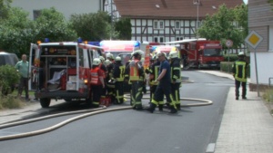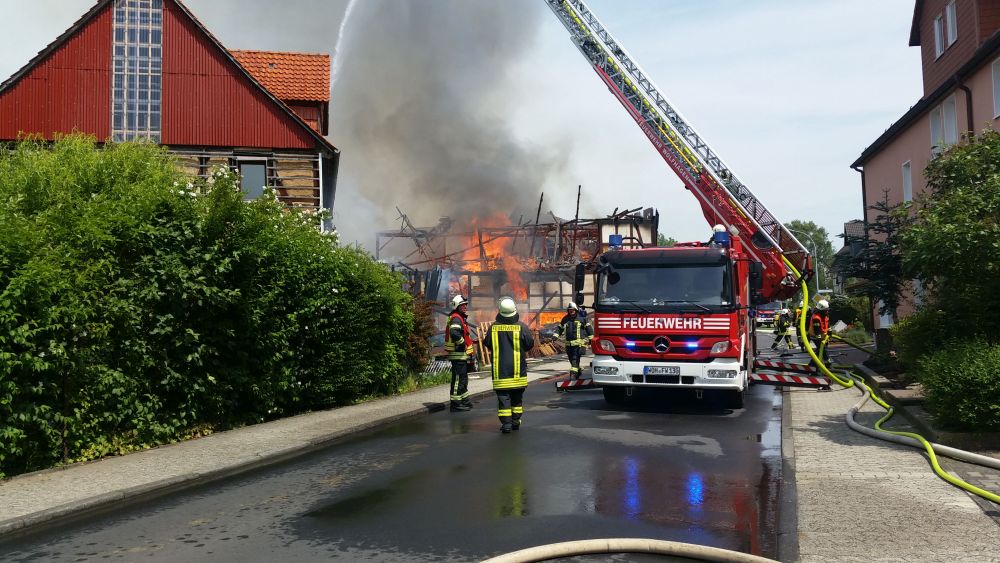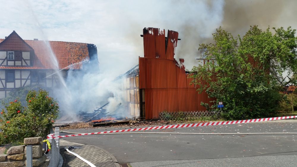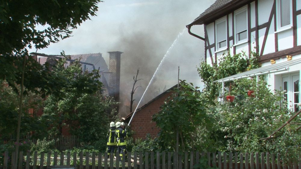 Nun galt es das Feuer von zwei Seiten so weit unter Kontrolle zu bekommen, das weder das angrenzende Wohnhaus noch umliegende Häuser in Brand geraten. Ein Wohnhaus wurde durch eine ständige Wasserzufuhr gekühlt und überstand den Brand nach letzten Informationen unbeschädigt. Das direkt an die Scheune grenzende Haus wurde stark in Mitleidenschaft gezogen. Im Haus befand sich nach Angaben der Polizei sehr viel Unrat, die Scheune soll leer gewesen sein. Auf Grund der enormen Rauchentwicklung wurde eine Rundfunkwarnung heraus gegeben, die Fenster und Türen geschlossen zu halten. Feuerwehren aus dem gesamten Landkreis waren mit rund 200 Einsatzkräften an der Brandbekämpfung beteiligt. Auch die Drehleiter aus Baunatal und Wolfhagen waren im Einsatz. Wie uns Bürgermeister Ralf Pfeiffer mitteilte, wurde auch das Schwimmbad zur Wasserentnahme genutzt. Hier standen rund 630 m³ zur Verfügung. Nachdem der Brand unter Kontrolle war, kam Schaum zum Einsatz, um die Glutnester zu ersticken. Im Haus befanden sich beim Brandausbruch weder Mensch noch Tier. Bei den Löscharbeiten wurde ein Feuerwehrmann leicht verletzt. Nach Angaben der Polizei wird der Sachschaden nach vorsichtigen Schätzungen mit rund 120.000.- Euro beziffert.