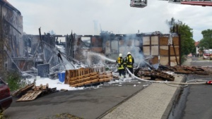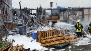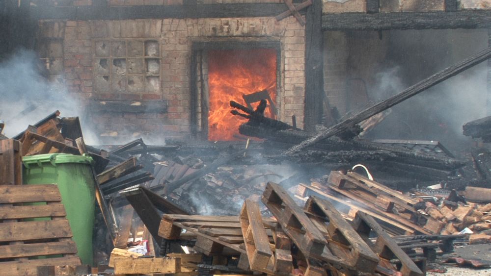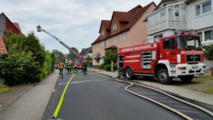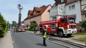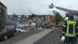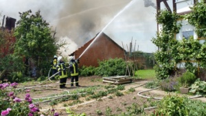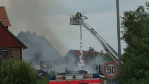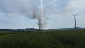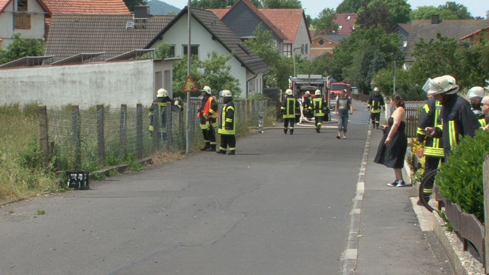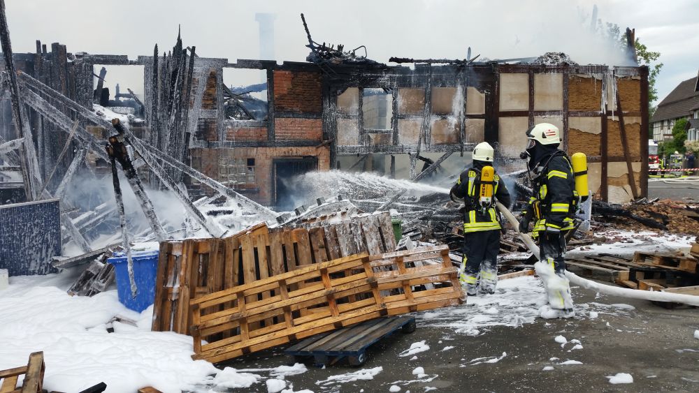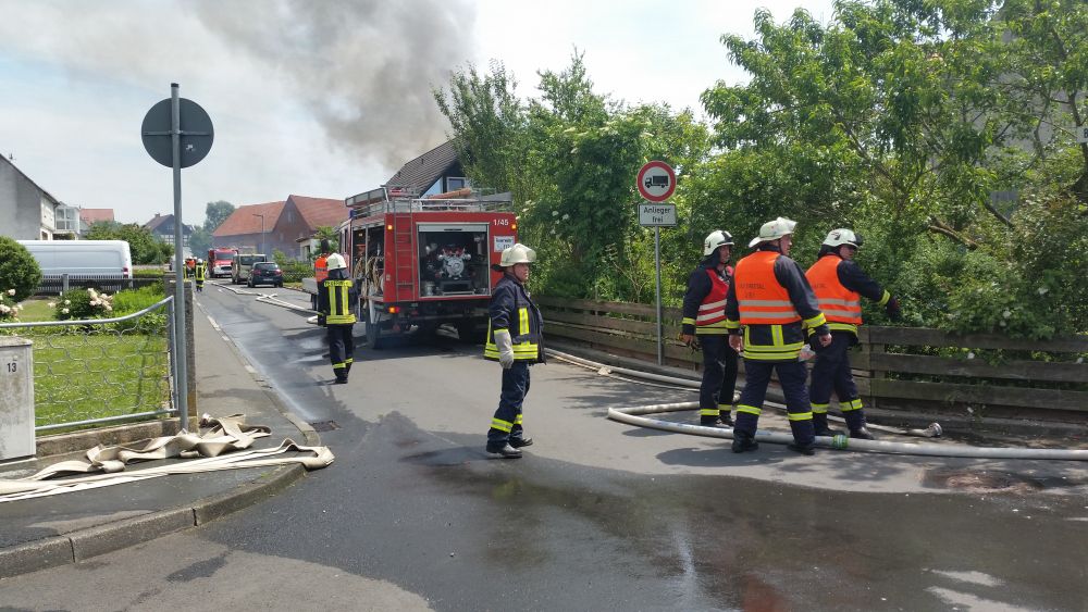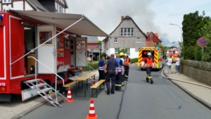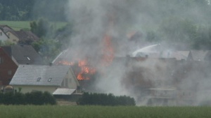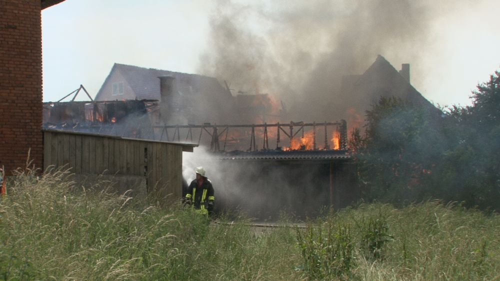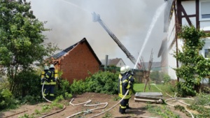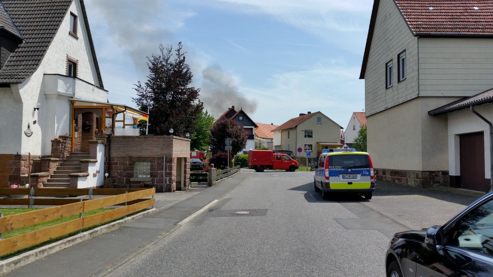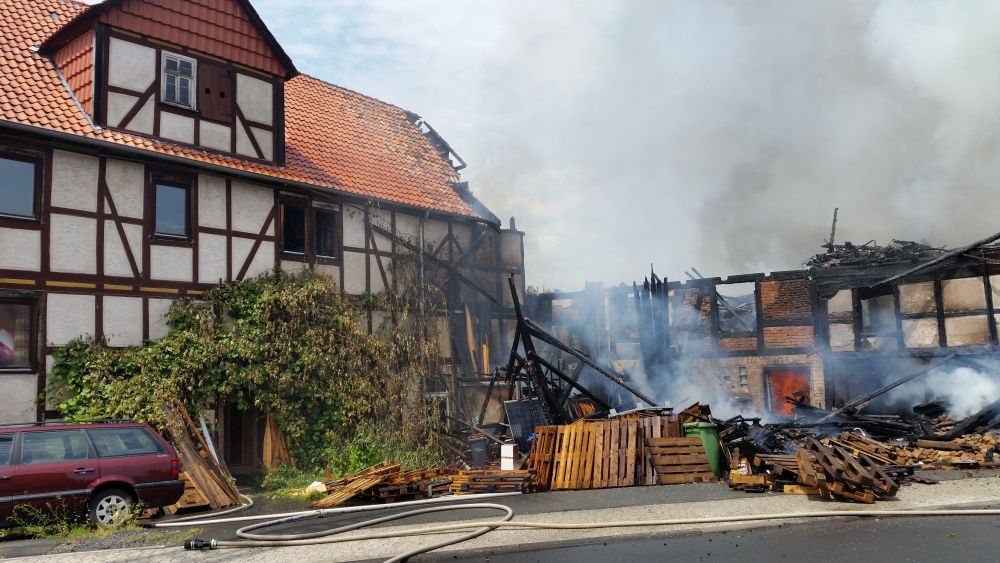 Nun galt es das Feuer von zwei Seiten so weit unter Kontrolle zu bekommen, das weder das angrenzende Wohnhaus noch umliegende Häuser in Brand geraten. Ein Wohnhaus wurde durch eine ständige Wasserzufuhr gekühlt und überstand den Brand nach letzten Informationen unbeschädigt. Das direkt an die Scheune grenzende Haus wurde stark in Mitleidenschaft gezogen. Im Haus befand sich nach Angaben der Polizei sehr viel Unrat, die Scheune soll leer gewesen sein. Auf Grund der enormen Rauchentwicklung wurde eine Rundfunkwarnung heraus gegeben, die Fenster und Türen geschlossen zu halten. Feuerwehren aus dem gesamten Landkreis waren mit rund 200 Einsatzkräften an der Brandbekämpfung beteiligt. Auch die Drehleiter aus Baunatal und Wolfhagen waren im Einsatz. Wie uns Bürgermeister Ralf Pfeiffer mitteilte, wurde auch das Schwimmbad zur Wasserentnahme genutzt. Hier standen rund 630 m³ zur Verfügung. Nachdem der Brand unter Kontrolle war, kam Schaum zum Einsatz, um die Glutnester zu ersticken. Im Haus befanden sich beim Brandausbruch weder Mensch noch Tier. Bei den Löscharbeiten wurde ein Feuerwehrmann leicht verletzt. Nach Angaben der Polizei wird der Sachschaden nach vorsichtigen Schätzungen mit rund 120.000.- Euro beziffert.