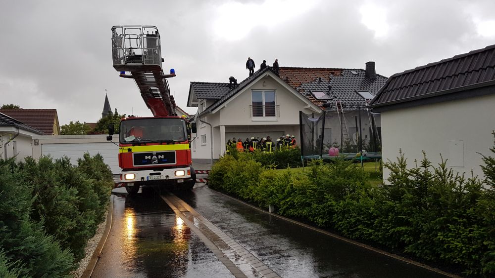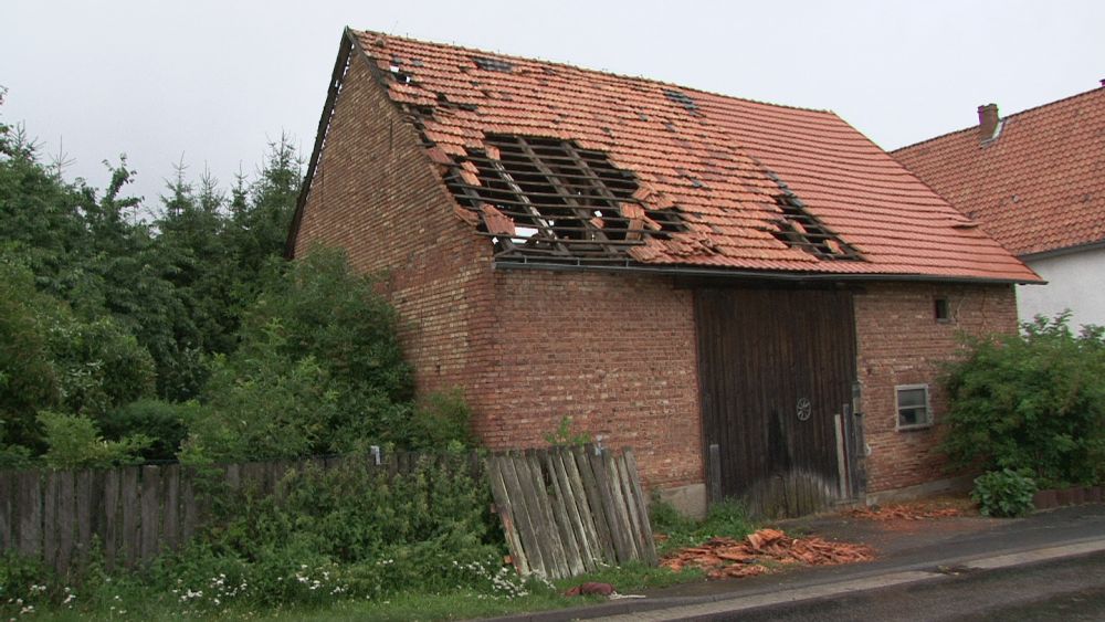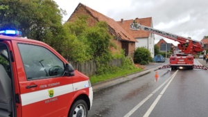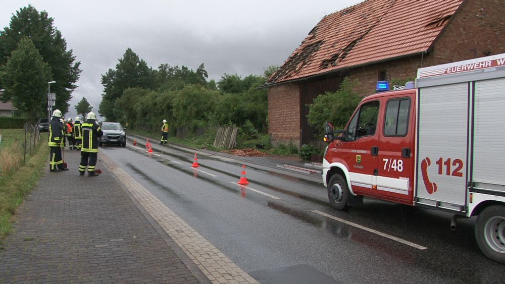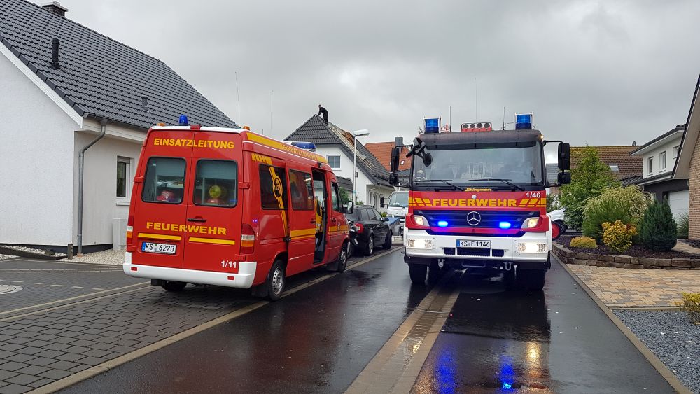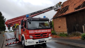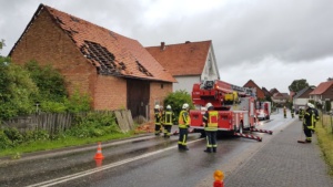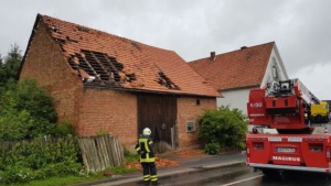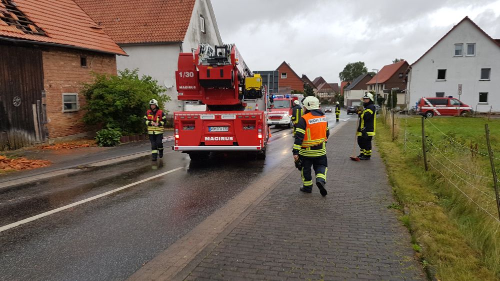 Wolfhagen / Espenau – Ein schweres Unwetter tobte sich am Mittwochnachmittag gegen 17.00 Uhr über dem Wolfhager Land und Espenau aus. Bäume wurden entwurzelt, Dächer abgedeckt und Strassen mit herab fallenden Ziegeln übersät. In Wolfhagen wurde eine Partyzelt von einer Windböe erfasst und auf das Dach eines Kindergartens geweht. In Nothfelden deckte der Sturm das Dach einer Scheune ab. Die Feuerwehr musste mit der Drehleiter die losen Ziegel entfernen. In Espenau kam es nach Angaben von Zeugen zu einer Windhose die durch den Ort zog.