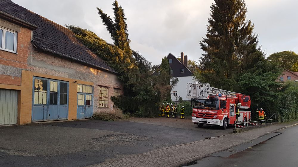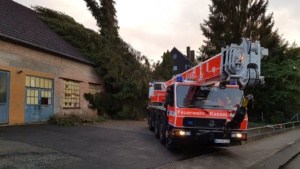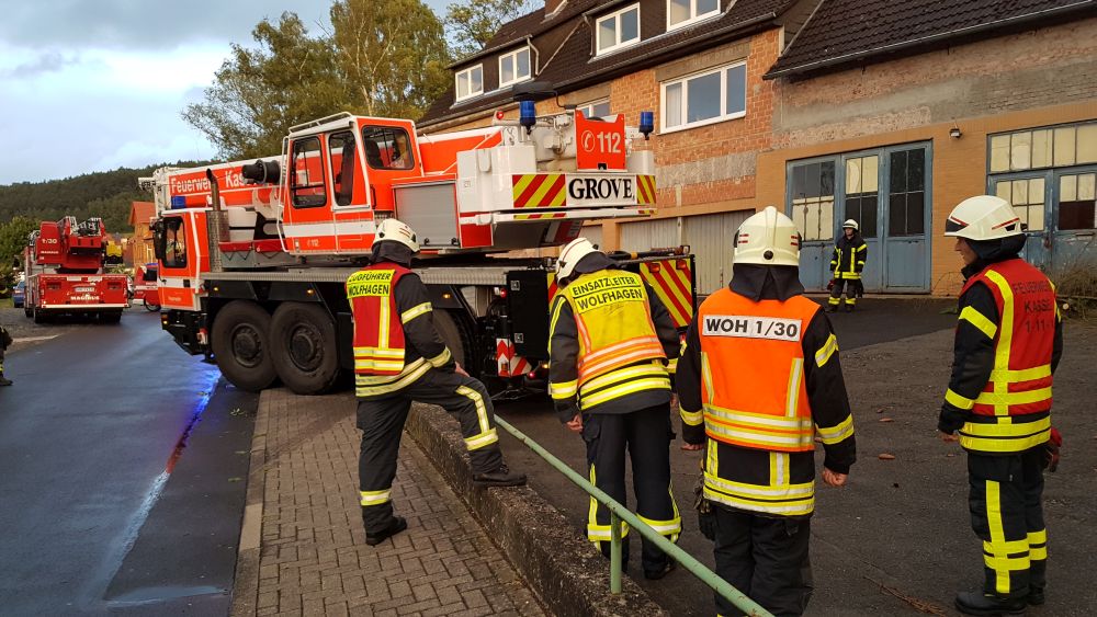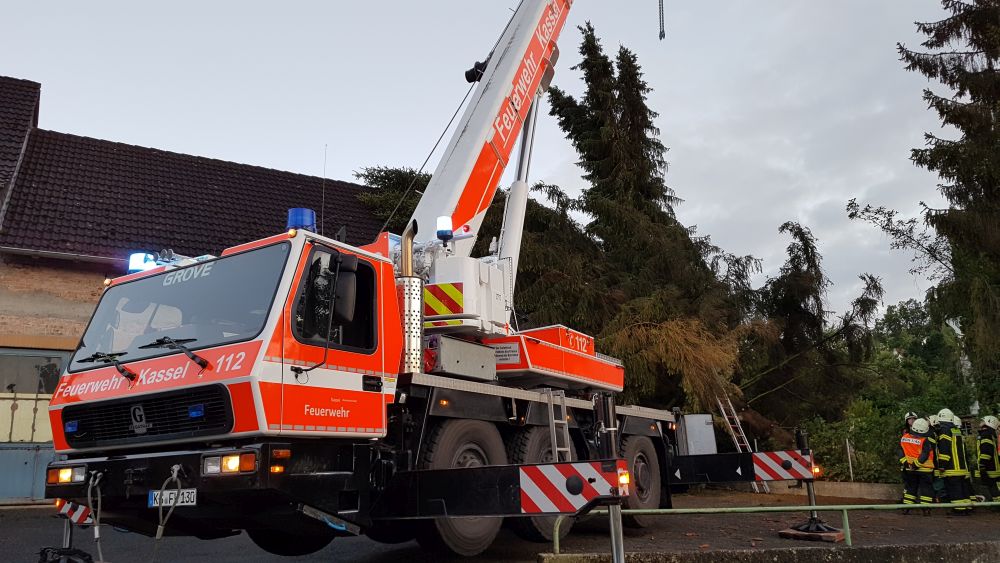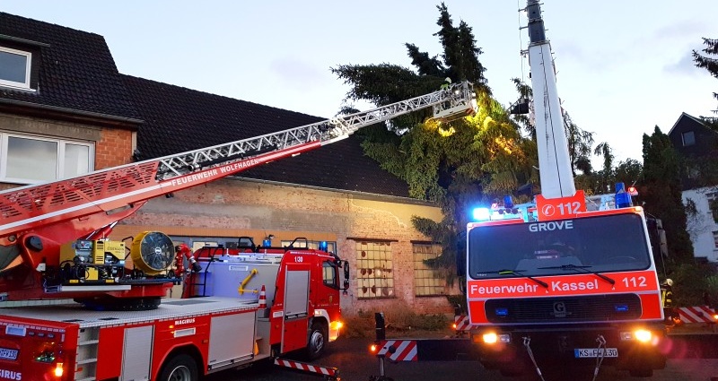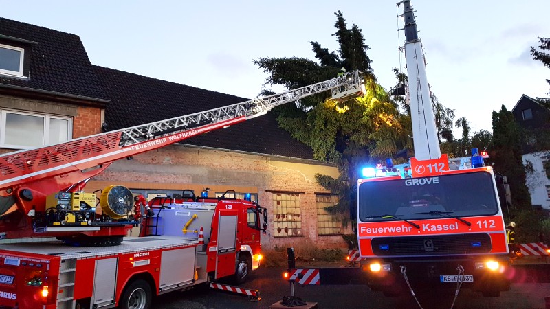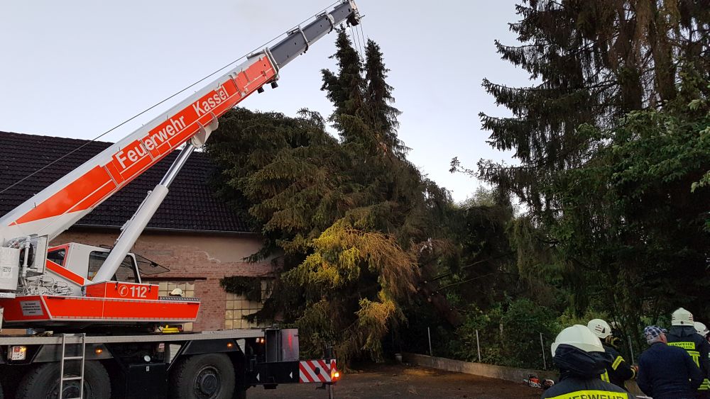 Bei vier Häusern und der Kirche wurden die Dächer stark beschädigt. Kurz nach 20.00 Uhr wurde die Feuerwehr Wolfhagen erneut alarmiert, diesmal in die Bahnhofstrasse. Über drei Stunden waren die Einsatzkräfte hier damit beschäftigt eine rund vier Tonnen schwere Fichte die auf ein Wohnhaus gestürzt war mittels Kran und Drehleiter vom Dach zu entfernen. Die Schwierigkeit lag darin, die schweren Stämme, die teilweise unter Spannung standen, ohne das Dach noch weiter zu beschädigen zu entfernen. Gegen 23.30 Uhr war dann auch dieser Einsatz beendet. Über eine Schadenshöhe kann derzeit noch nichts gesagt werden.
