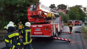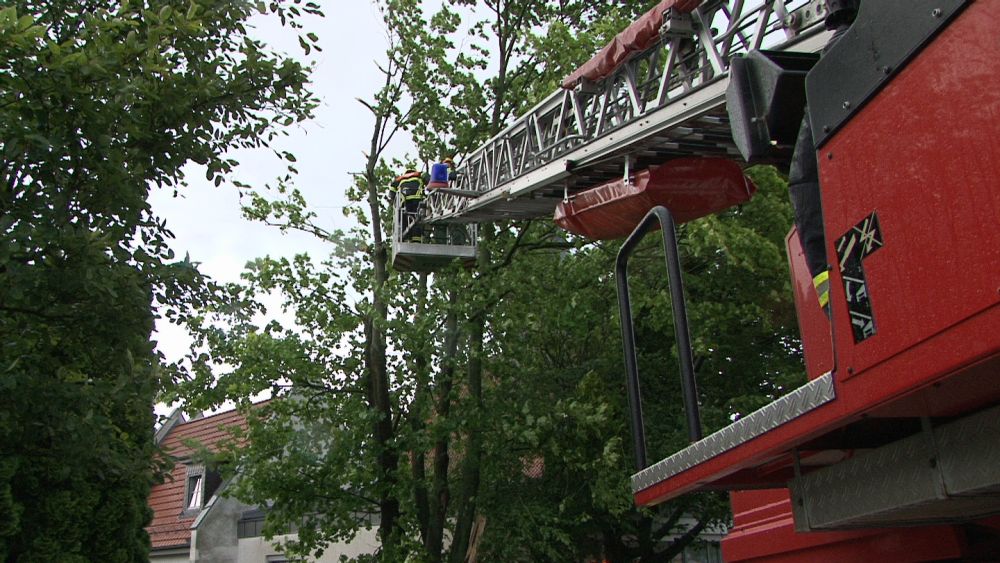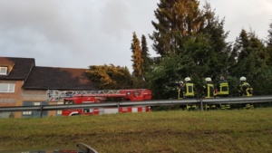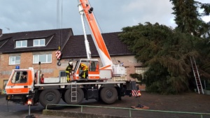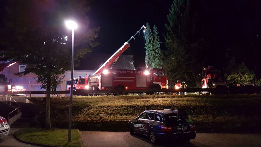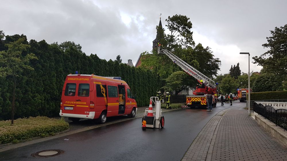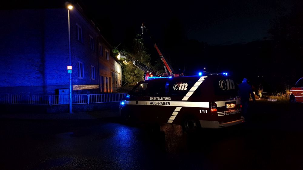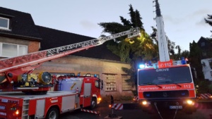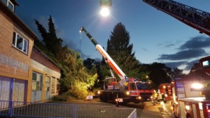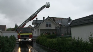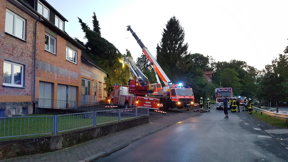 Bei vier Häusern und der Kirche wurden die Dächer stark beschädigt. Kurz nach 20.00 Uhr wurde die Feuerwehr Wolfhagen erneut alarmiert, diesmal in die Bahnhofstrasse. Über drei Stunden waren die Einsatzkräfte hier damit beschäftigt eine rund vier Tonnen schwere Fichte die auf ein Wohnhaus gestürzt war mittels Kran und Drehleiter vom Dach zu entfernen. Die Schwierigkeit lag darin, die schweren Stämme, die teilweise unter Spannung standen, ohne das Dach noch weiter zu beschädigen zu entfernen. Gegen 23.30 Uhr war dann auch dieser Einsatz beendet. Über eine Schadenshöhe kann derzeit noch nichts gesagt werden.