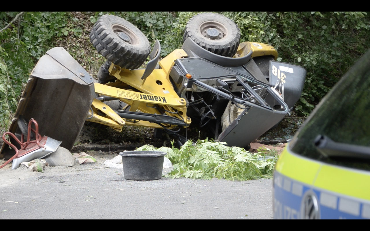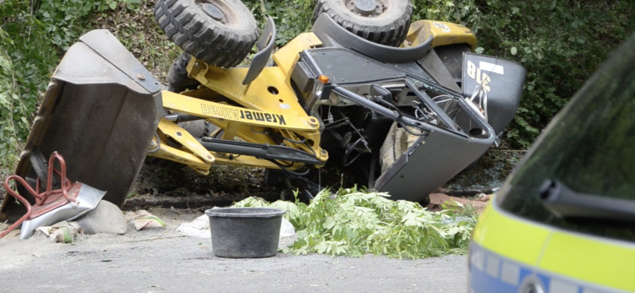 Nach Erkenntnissen von der Unfallstelle wollte der Eschweger Fahrer des Radladers einem entgegenkommenden LKW Platz machen und hielt am Fahrbahnrand an. Beim Wiederanfahren rutschte plötzlich das Gefährt weg und stürzte eine etwa 20 Meter tiefe Böschung hinab und kam am Rande eines Parkplatzes auf der Seite liegend zum stehen. Der 55 Jährige zog sich dabei schwere, aber keine lebensbedrohlichen Verletzungen zu und wurde mit einem Rettungshubschrauber in eine Klinik geflogen. Tragisch: Nur wenige Meter weiter wäre eine Ausweichmöglichkeit gewesen.