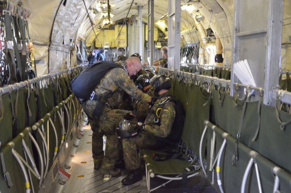 Die Verletzungsgefahr war einfach zu hoch. Somit wurden die See-Sprünge Dienstagvormittag kurzerhand vollständig abgesagt und das eigentliche Training der schwierigen Wasserlandung auf unbestimmte Zeit verschoben. Hintergrund der Ederseeübung ist das Üben des Notverfahrens bei Wasserlandungen, erzählte uns Soldatin Jennifer. „Man muss sich aus seinem Gurtzeug befreien und sich sehr konzentriert auf die Landung vorbereiten“. Während man im Wasser noch weich landet, muss man sich bei einer Landung an Land hingegen zur Seite abrollen und den sogenannten „Landefall“ machen. Und diesen konnte man am Dienstag und Mittwoch westlich von Bottendorf (Waldeck-Frankenberg) beobachten. Denn hier wurden die eigens anvisierten Sprünge durchgeführt. Aus rund 450 Meter Höhe stürzten sich die Soldaten mit ihren Automatikschirmen aus der mit zwei mal 5000 PS starken Maschine, welche eigens aus dem Schleswig-Hollsteinischen Fliegerhorst Hohn (LTG63) angereist war. Einige wagten sich sogar aus einer Höhe von 4000 Meter zu springen, was einem Fallschirmspringer, schaute man in die Gesichter der Soldaten, nicht einmal den Ruhepuls in die Höhe schnellen ließ. Gestartet und gelandet ist die Transall an allen drei Tagen am Flugplatz in Allendorf/Eder.