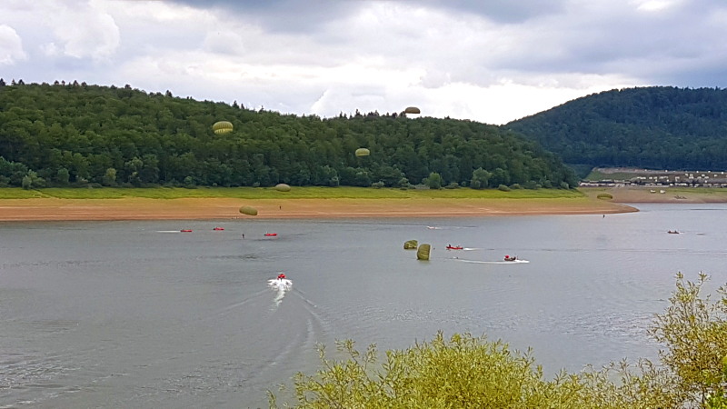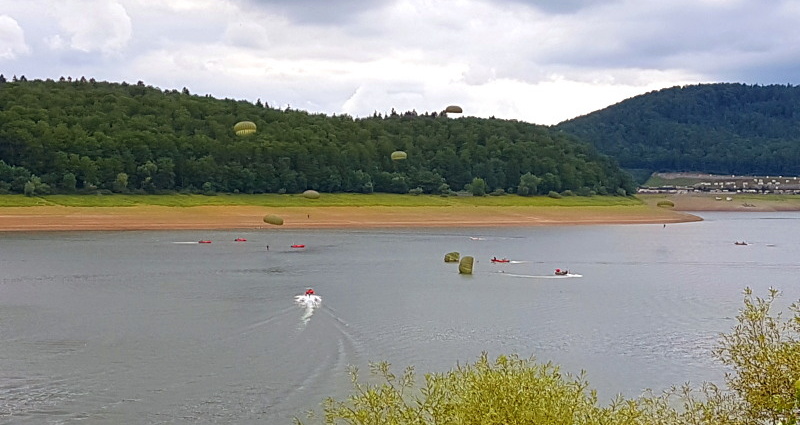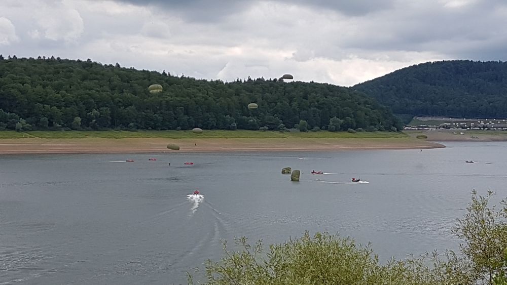 Allendorf/Eder – Zunächst war nur ein lautes Brummen und Grollen über dem Edersee zu hören. Und kaum hörte man es, da sah man auch schon den Grund dafür. In nur 400 Meter Höhe gleitete am vergangenem Montag eine Transall C160 der Bundeswehr sanft über den See und setzte Fallschirmspringer der Division Schnelle Kräfte (DSK) ab.