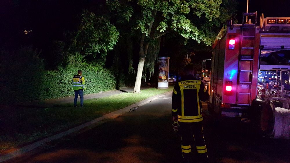 Der Beifahrer wurde bei dem Unfall aus dem Wagen geschleudert und befand sich beim Eintreffen der Streifen auf dem Bürgersteig. Sowohl Fahrer als auch Beifahrer wurden bei dem Unfall verletzt und wurden zur ärztlichen Versorgung in die umliegenden Krankenhäuser verbracht. Derzeit besteht keine Lebensgefahr. Nach bisherigen Ermittlungen befuhr der 22 jährige männliche Unfallverursacher aus Kassel mit einem weißen Mazda die Kohlenstraße in Richtung Innenstadt. Aus bislang ungeklärten Gründen verlor er die Kontrolle über das Fahrzeug und streifte höchstwahrscheinlich mit überhöhter Geschwindigkeit die Verkehrsinsel in Höhe des dortigen Lidl Marktes und kam auf die Gegenfahrbahn. Dort beschädigte er noch den Zaun eines angrenzenden Grundstücks und streifte einen Baum, bis er sich überschlug und auf der Gegenfahrbahn zum Stillstand kam. Der Beifahrer, ein 40 jähriger Mann aus Baunatal wurde bei dem Unfall aus dem Fahrzeug geschleudert und verletzte sich. Zur Klärung der Unfallursache wurde seitens der Staatsanwaltschaft ein Sachverständiger beauftragt. Die Kohlenstraße war für über eine Stunde voll gesperrt.