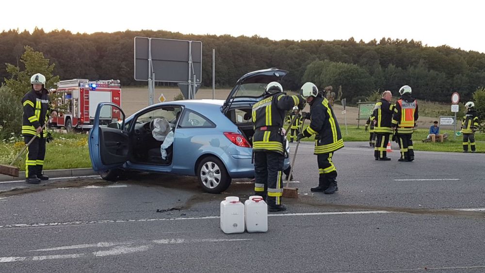 Im Opel befand sich noch ein Beifahrer der ebenso wie beide Fahrer bei dem Unfall so schwer verletzt wurden, das sie nach einer Erstversorgung an der Unfallstelle in ein Krankenhaus eingeliefert werden mussten. Die Feuerwehr Nieste war mit insgesamt elf Einsatzkräften vor Ort und nahm die auslaufenden Betriebsstoffe auf. Der Verkehr konnte an der Unfallstelle vorbei geleitet werden. Nach groben Schätzungen wird der Sachschaden mit rund 10.000 Euro beziffert.