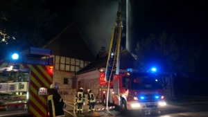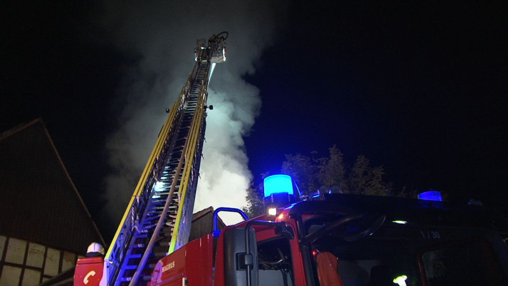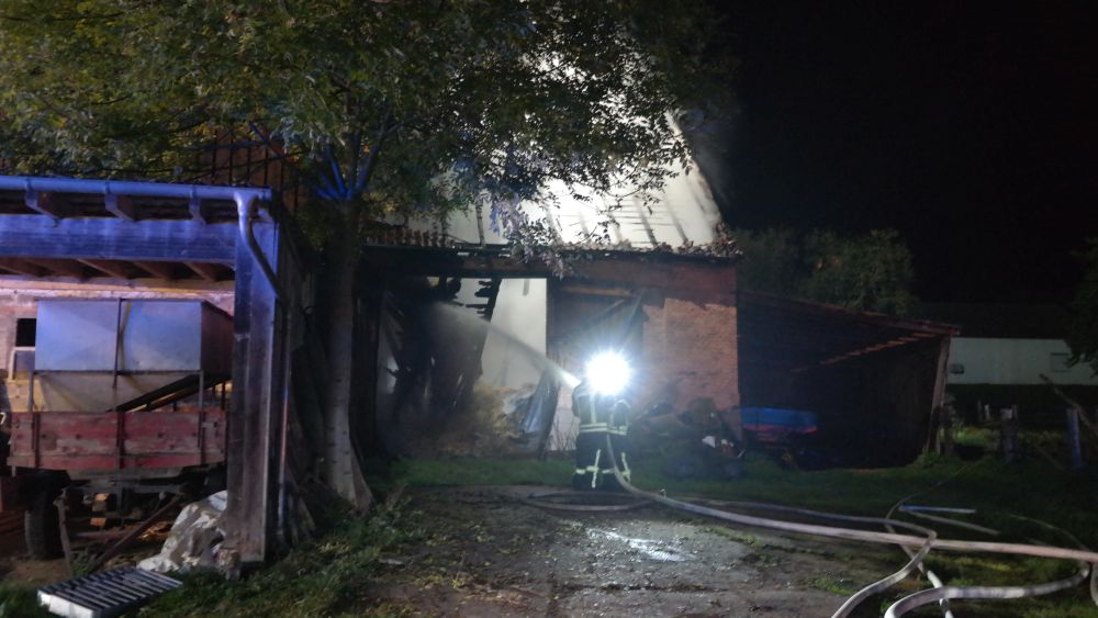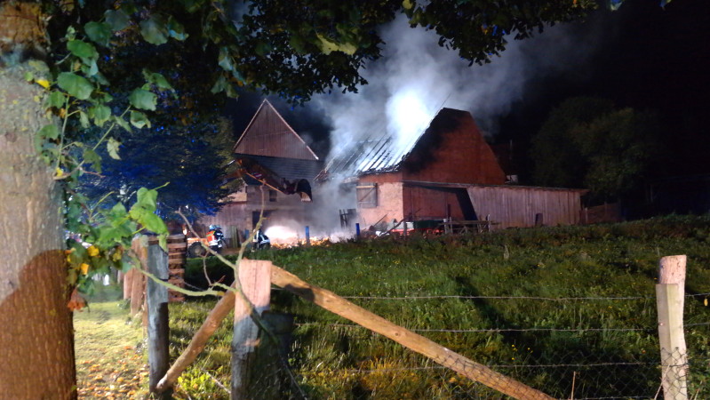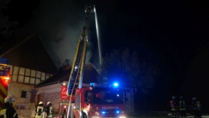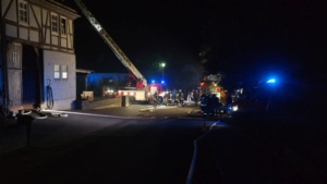 Zum Glück hielt jedoch die Wand das Feuer zurück und die Einsatzkräfte konnten mittels einer Riegelstellung das Wohnhaus retten. Das Feuer fand in der Scheune sehr viel Nahrung, denn sie war mit Stroh angefüllt. Auch ein Dieseltank mit rund 400 Liter Inhalt begünstigte das Flammenmeer. Zum Glück wurde bei dem Brand niemand verletzt, auch Tiere befanden sich nicht in dem Gebäude. Rund 50 Einsatzkräfte waren nötig das Feuer etwa gegen 21.30 Uhr unter Kontrolle zu bringen. Mit einem Bagger wurde das Stroh auseinander gezogen, gelöscht und abtransportiert. Durch den enormen Wasserverbrauch brach die Versorgung kurzzeitig zusammen, wurde jedoch sofort durch zusätzliche Tanklöschfahrzeuge wieder hergestellt. Zum Einsatz kam die Feuerwehr Diemelstadt, Volkmarsen und zur Unterstützung auch die Feuerwehren Bad Arolsen mit der Drehleiter und Warburg mit einem Tanklöschfahrzeug. Wie es zu dem Brand kommen konnte ist aktuell unklar, die Polizei hat die Ermittlungen aufgenommen.