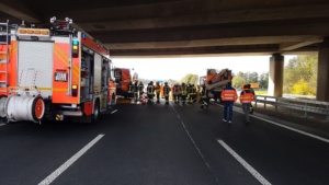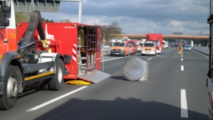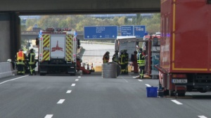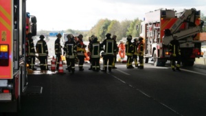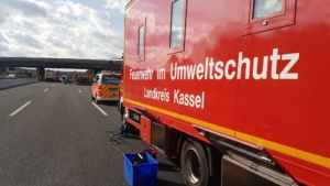 Kassel – Zu einem LKW Unfall kam es am Mittwochmorgen gegen 10.00 Uhr auf der A7 zwischen den Anschlussstellen Kassel Mitte und Kassel Süd. Aus bisher noch nicht geklärter Ursache kam es zu einem Auffahrunfall bei dem das Heck eines Gefahrgut LKW ebenso wie das Fahrerhaus des Unfallfahrers stark beschädigt wurde. Der Fahrer wurde bei dem Unfall schwer verletzt und nach einer Erstversorgung an der Unfallstelle in ein Krankenhaus eingeliefert.Der im Heck beschädigte LKW hatte insgesamt 960 Säcke Granulat geladen, welches als Gefahrgut deklariert wurde. Es wurden einige Säcke beschädigt die es nun galt zu sichern und abtransportieren. Für die Feuerwehr eine sehr zeitaufwendige Arbeit.