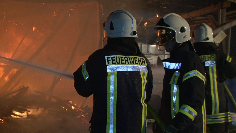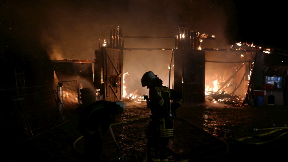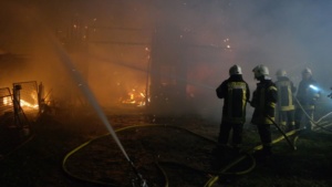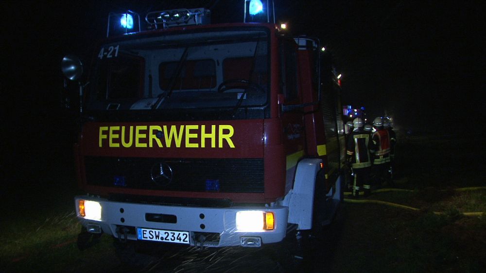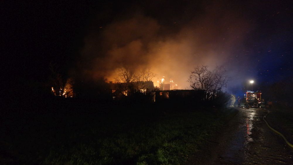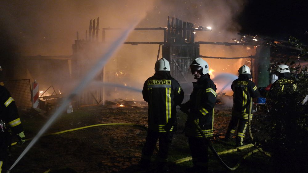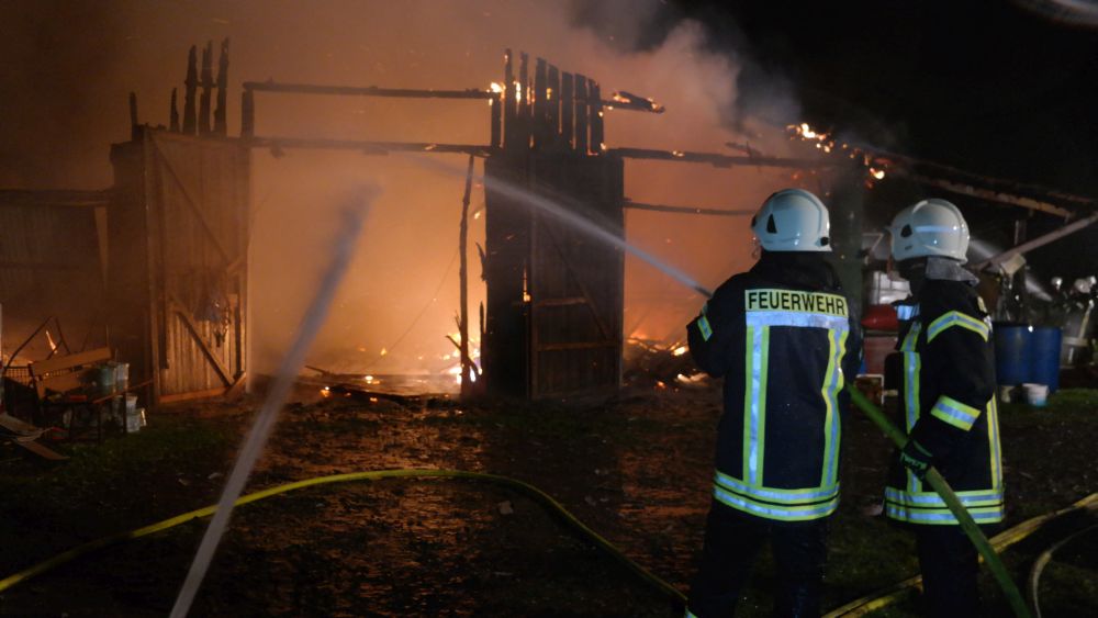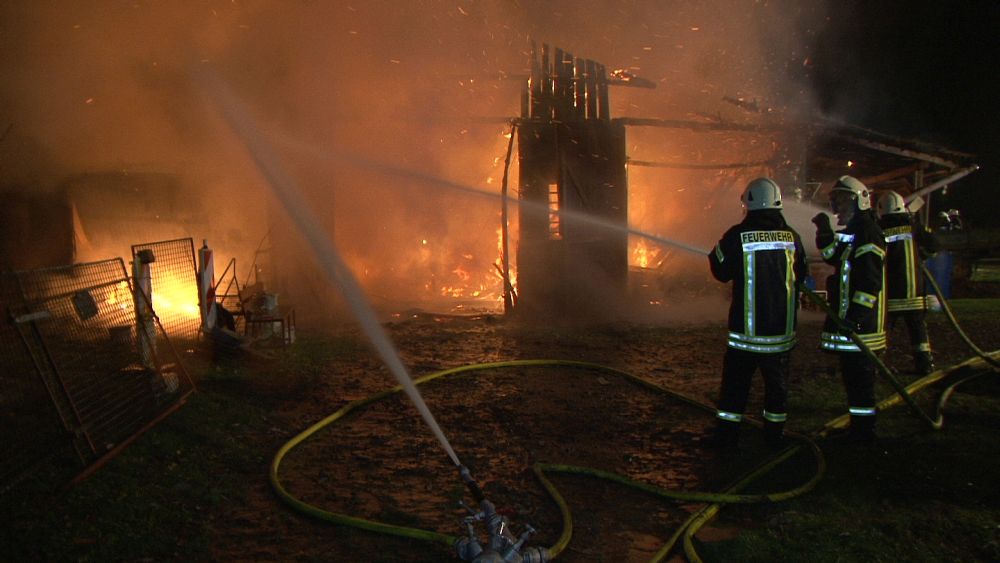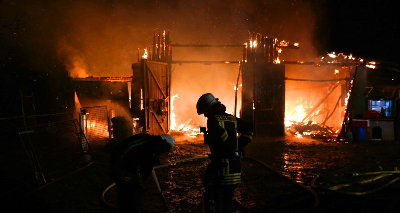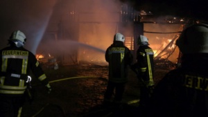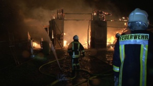 Hessisch Lichtenau – Am späten Samstagabend kam es zum Brand eines landwirtschaftlichen Anwesens in Hess. Lichtenau. Beim Eintreffen der Feuerwehr stand eine rund 375m² große Feldscheune bereits im Vollbrand. Zunächst galt es die noch im Gebäude befindlichen Tiere in Sicherheit zu bringen. Hierzu gehörte ein Pferd, ein Hund und mehrere Gänse. Zum Glück kamen alle Tiere mit dem Schrecken davon.