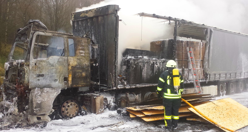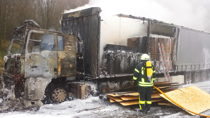 Bad Hersfeld – Aus noch ungeklärter Ursache geriet am Donnerstagmorgen gegen 07.25 Uhr, auf der A7 zwischen den Anschlussstellen Hersfeld-West und dem Kirchheimer Dreieck, Fahrtrichtung Süd, ein Sattelzug in Brand. Derzeit sind mehrere Feuererwehren mit der Brandbekämpfung beschäftigt. Die Autobahn ist in Richtung Kirchheimer Dreieck voll für den Verkehr gesperrt.Der Sattelzug ist mit 22 Tonnen Sperrholz beladen. Dadurch treten bei der Brandbekämpfung immer wieder Glutnester auf.