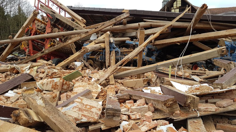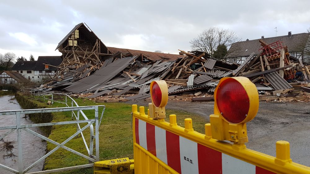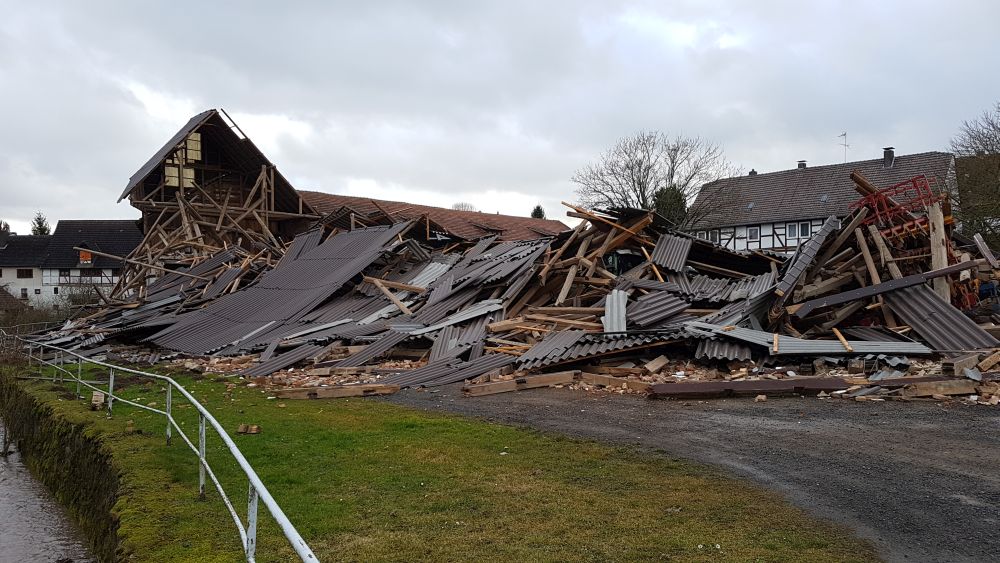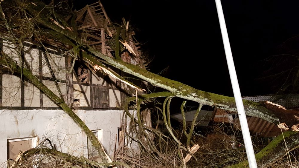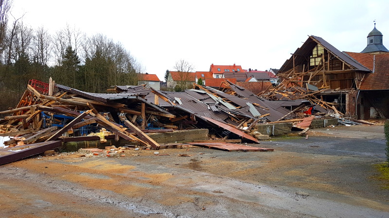 In Meimbressen wurde eine Scheune mit Maschinen dem Erdboden gleich gemacht. Erst im letzten Jahr wurde das Dach neu gemacht, wie Hessennews am Einsatzort erfahren konnte. Die Feuerwehr appellierte an die Autofahrer, die Sperrungen unbedingt zu beachten. Auch wenn der Sturm jetzt nachgelassen hat, besteht auf den gesperrten Straßen Lebensgefahr durch Bäume, die nicht mehr standfest sind und umstürzen können, sowie durch herab fallende Äste. Koordiniert wurden alle Einsätze und Hilfsmaßnahmen vom Führungsstab in der Leitstelle der Feuerwehr Kassel, die für Stadt und Landkreis zuständig ist. Dort informierte sich auch Kassels Brandschutzdezernent Dirk Stochla über das Einsatzgeschehen. Landrat Uwe Schmidt ließ sich während einer Dienstreise laufend telefonisch über die Schadenslage informieren. Stadtrat Stochla und Landrat Schmidt danken allen am heutigen Tag eingesetzten Helferinnen und Helfern für ihren Einsatz. „Sowohl unsere Berufsfeuerwehr als auch die Mitglieder unserer sieben Freiwilligen Feuerwehren haben gezeigt, dass sich die Menschen in der Stadt Kassel auf ein hochprofessionelles Sicherheitssystem verlassen können und auch in solchen außergewöhnlichen Situationen schnelle und kompetente Hilfe erhalten“, erklärt Brandschutzdezernent Stochla. Landrat Schmidt ergänzt: „Ich bin froh, dass keine Personenschäden zu beklagen sind und danke schon jetzt allen Einsatzkräften der Freiwilligen Feuerwehren für ihre unermüdlichen Anstrengungen, um Mitmenschen aus misslicher Lage zu befreien, Straßen wieder passierbar zu machen und Sachschäden zu begrenzen.“ Das ganze Ausmaß der Schäden im Kreisgebiet werde wohl erst am morgigen Freitag sichtbar. Um 17.34 Uhr hat der Deutsche Wetterdienst die Unwetterwarnung aufgehoben. Die Feuerwehren sind jedoch weiterhin im Einsatz. Die Arbeiten werden sich noch bis in die späten Abendstunden hineinziehen. Auch wenn der Sturm jetzt abgeflaut ist, gilt es weiterhin vorsichtig zu sein: Umgestürzte Bäume können unter Spannung stehen – bei Sägearbeiten besteht Lebensgefahr. Beseitigen Sie umgestürzte Bäume auf Ihrem Grundstück nicht selbst. Beauftragen Sie einen Fachbetrieb. Achten Sie auch in den kommenden Tagen auf Äste oder Dachziegel, die vom Sturm gelockert worden sind und auch später noch herabfallen können. Verzichten Sie in den kommenden Tagen auf Spaziergänge im Wald – dort besteht Lebensgefahr.