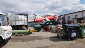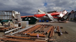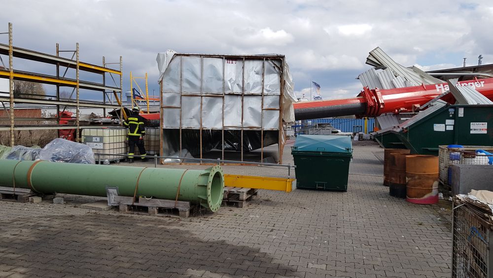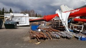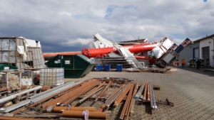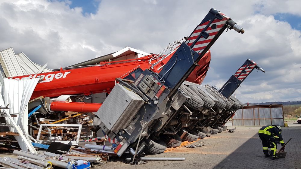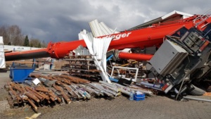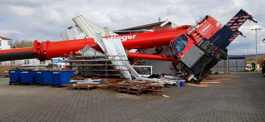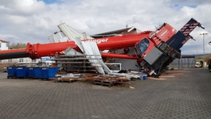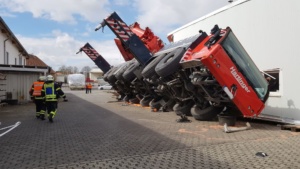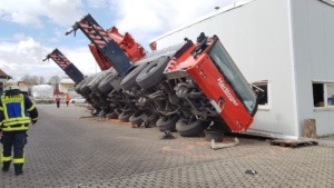 Kurze Zeit später schlug der Kran auch schon ein. Wie genau es zu diesem Unfall kommen konnte, ist aktuell noch nicht geklärt. Die sofort zur Einsatzstelle gerufene Feuerwehr stelle zum Glück schnell fest, das keine Verletzten zu beklagen waren. Jede Menge Hydrauliköl war ausgelaufen welches gebunden werden mussten. Insgesamt 14 Propangasflaschen wurden aus dem Gefahrenbereich gebracht. Ein Gutachter muss nun feststellen, wie es zu diesem Unfall kommen konnte. Wie hoch der Sachschaden sein wird ist derzeit noch nicht abzuschätzen. Eine Halle wurde massiv beschädigt, ob hier eine Reparatur noch möglich ist bleibt abzuwarten. Zum Einsatz kam die Feuerwehr Hofgeismar sowie die Berufsfeuerwehr Kassel.