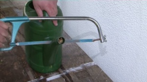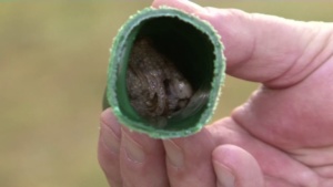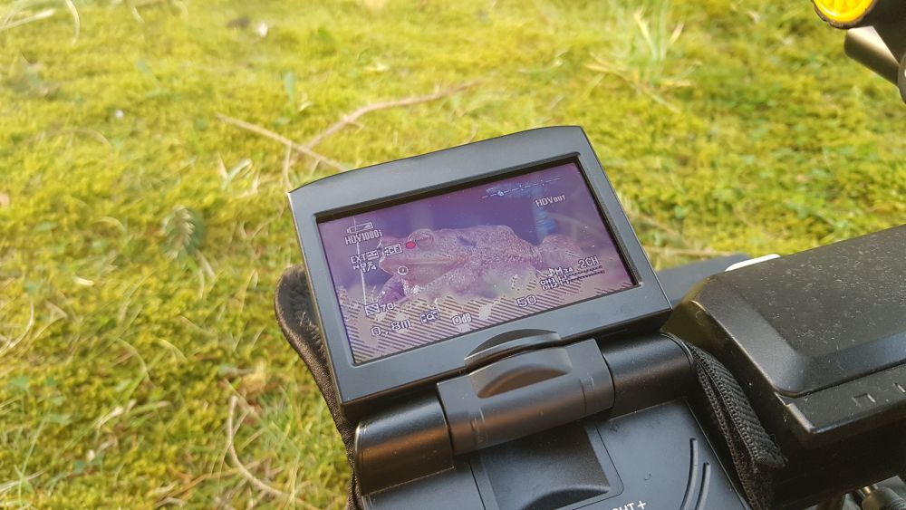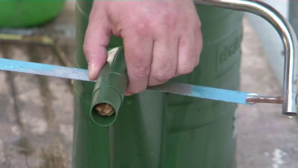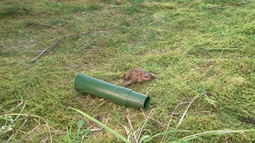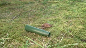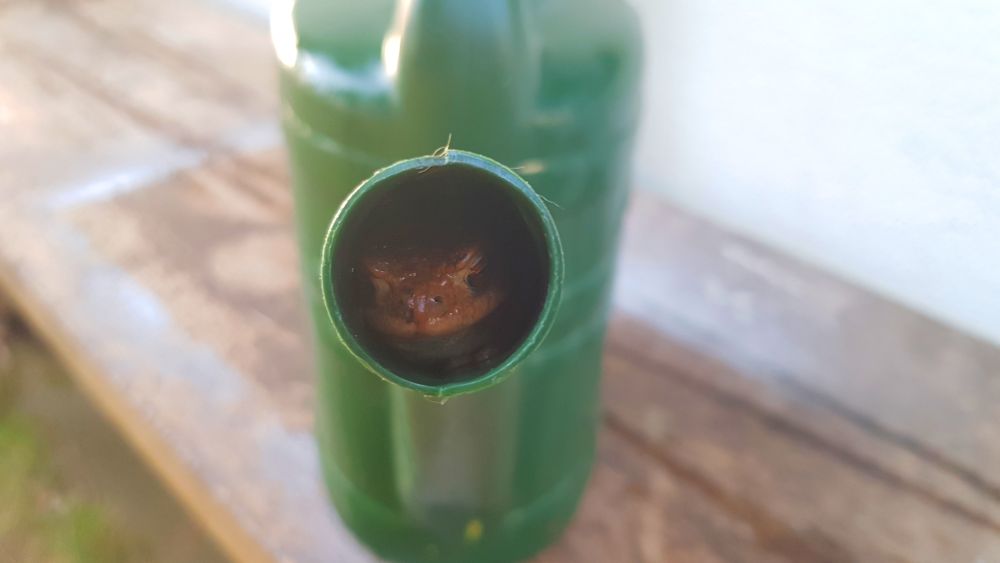 Alle Bemühungen das Tier aus der Tülle zu bewegen gingen jedoch schief. Also half hier nur noch der Griff zur Säge. Nachdem die Tülle ab war und der Frosch dabei zum Glück nicht dem Schneidwerkzeug zum Opfer fiel, konnte er dann endlich aus seiner misslichen Lage befreit werden. Er machte den Eindruck, als hätte er dieses Abenteuer gut überstanden. Wie auch immer, der Frosch war gerettet und hat dann wieder seinen Weg in den benachbarten Teich fortgesetzt.