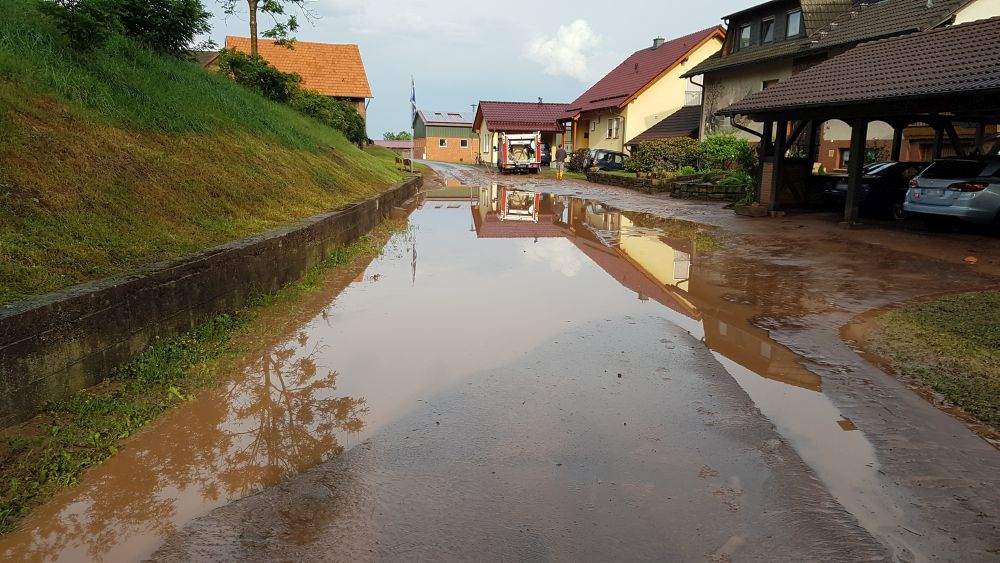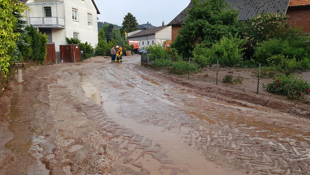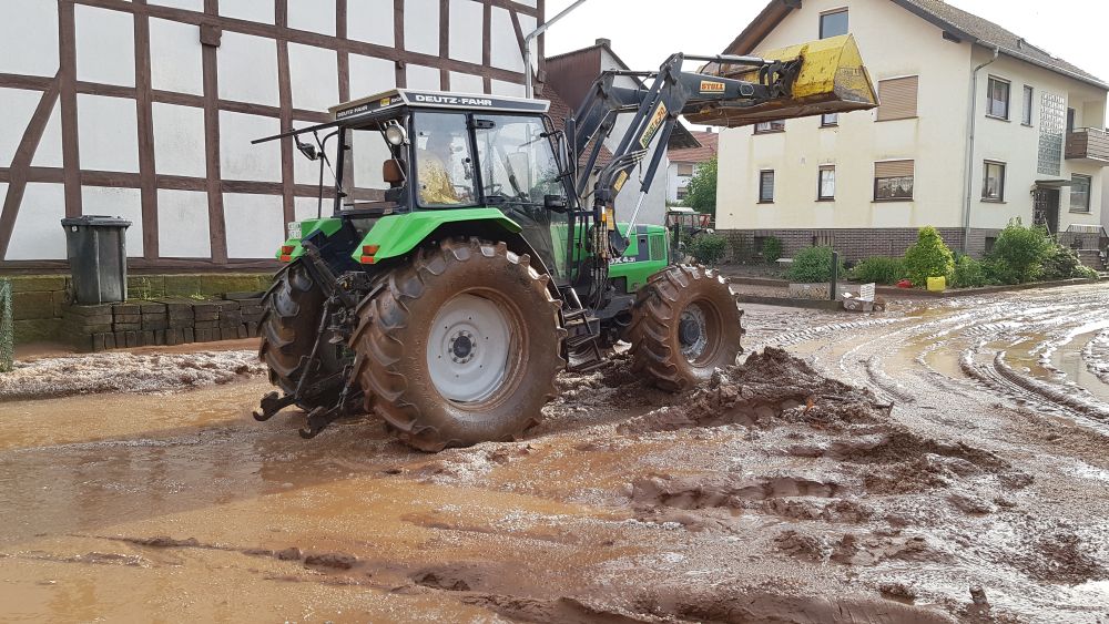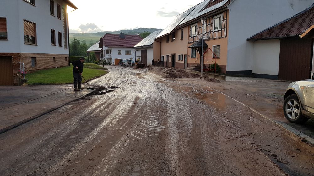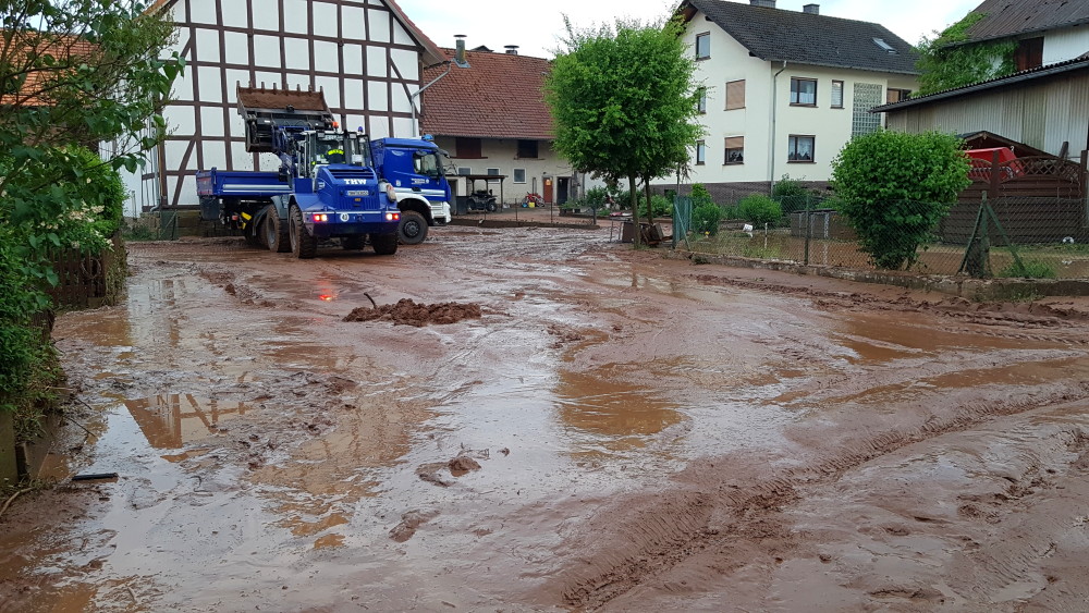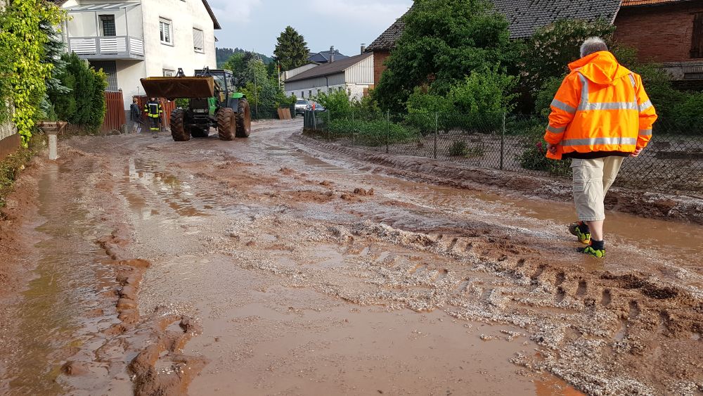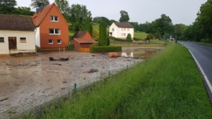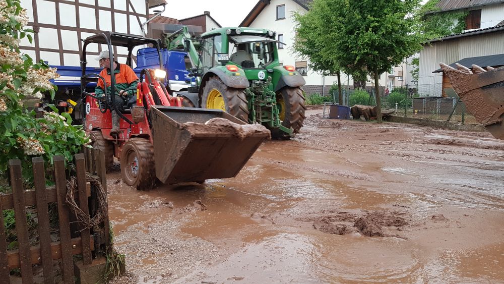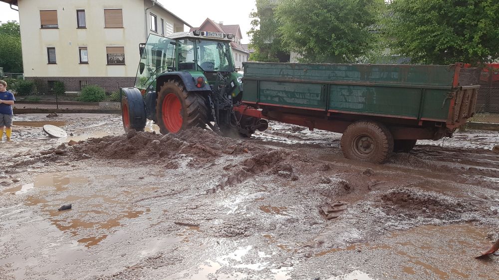 Zum Glück konnten sich die Personen selbst befreien und sind nach letzten Informationen wohl auf. Rund 30 cm hoch ist der Schlamm den das Unwetter hinterlassen hat. Überall drang die braune Brühe ein und sorgte für ein absolutes Chaos. Keller liefen voll und Oeltanks drohten davon zu schwimmen. Trotz der massiven Beschädigungen ist es nahezu ein Wunder das niemand bei dem Unwetter gesundheitlichen Schaden davon trug. Jetzt zeigte sich nach dem schlimmen Unwetter, was Nachbarschaft bedeutet. Jeder half mit Schaufeln, Treckern, Baggern oder auch den bloßen Händen das Chaos unter Kontrolle zu bringen. Jetzt ist das Unwetter vorbei, in ein paar Tagen werden auch die Aufräumarbeiten wieder überschaubar sein, jedoch die Natur wird hier eher weniger Interesse zeigen, denn auf viel Sonnenschein folgen in der Regel auch schwere Unwetter. Vor Ort waren rund 100 Einsatzkräfte von Feuerwehr, THW und dem Roten Kreuz.