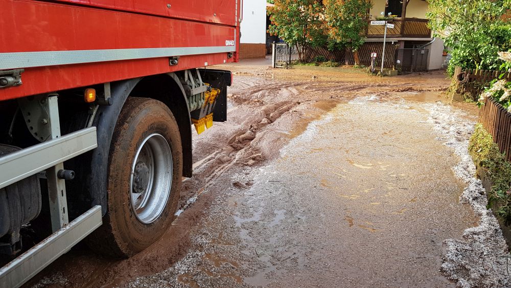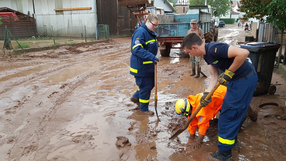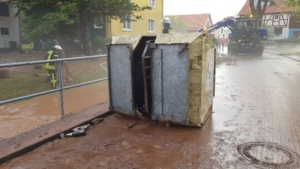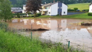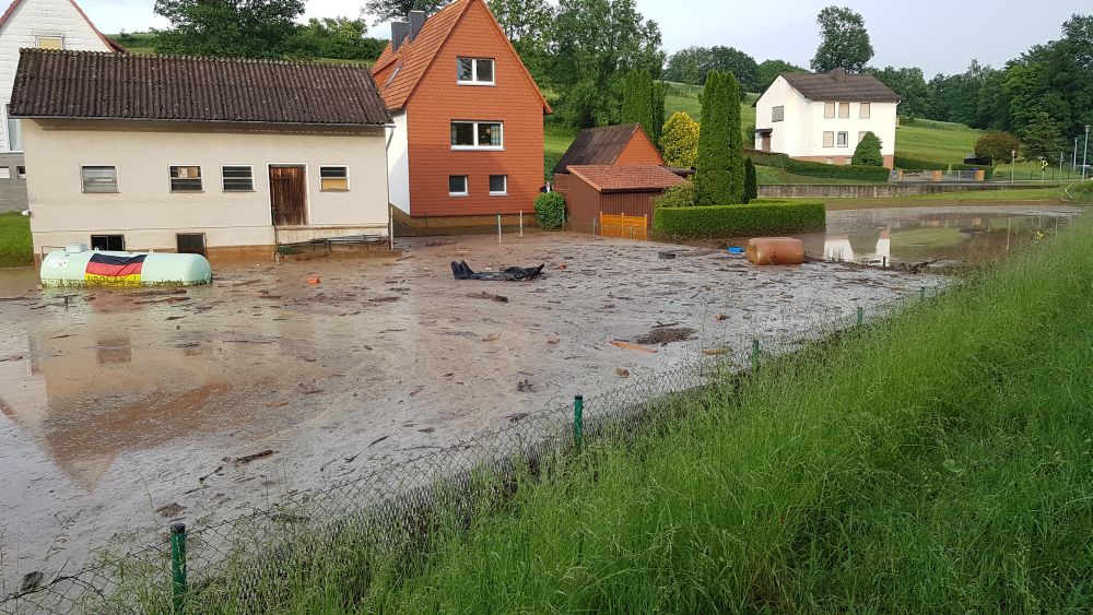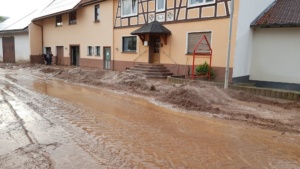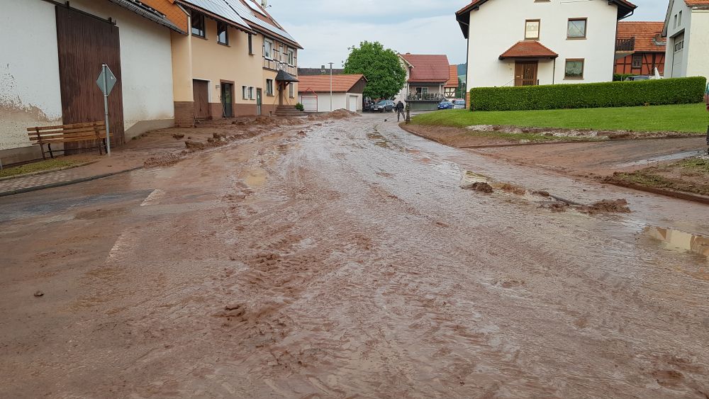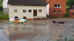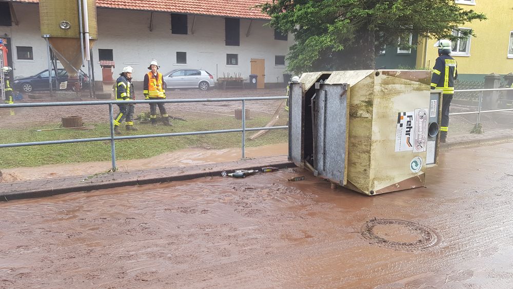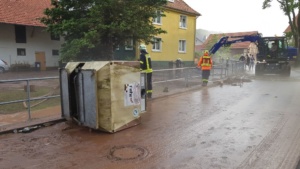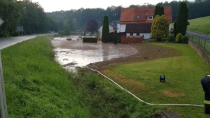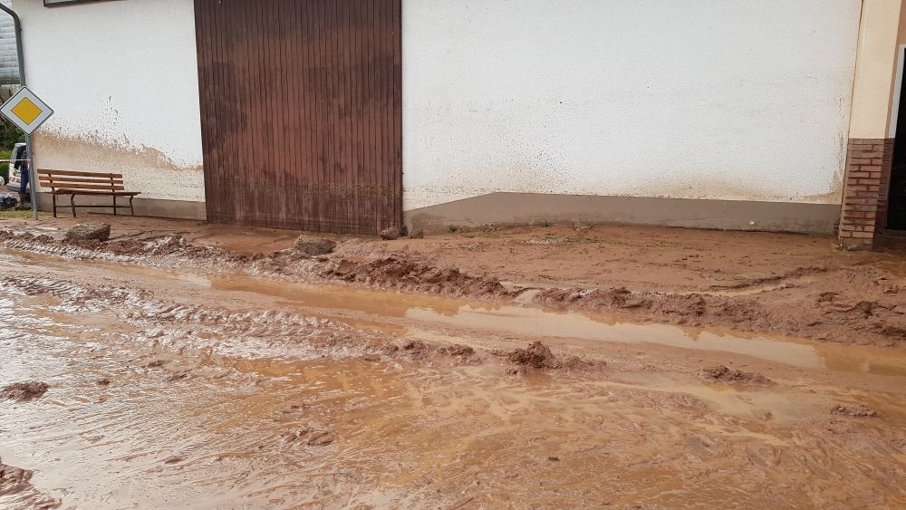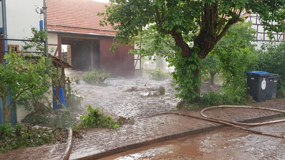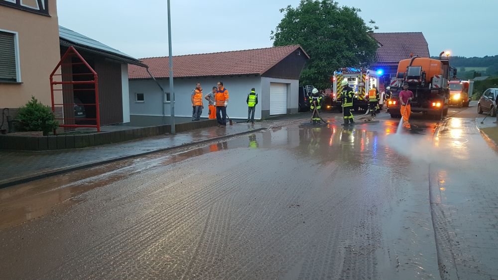 Zum Glück konnten sich die Personen selbst befreien und sind nach letzten Informationen wohl auf. Rund 30 cm hoch ist der Schlamm den das Unwetter hinterlassen hat. Überall drang die braune Brühe ein und sorgte für ein absolutes Chaos. Keller liefen voll und Oeltanks drohten davon zu schwimmen. Trotz der massiven Beschädigungen ist es nahezu ein Wunder das niemand bei dem Unwetter gesundheitlichen Schaden davon trug. Jetzt zeigte sich nach dem schlimmen Unwetter, was Nachbarschaft bedeutet. Jeder half mit Schaufeln, Treckern, Baggern oder auch den bloßen Händen das Chaos unter Kontrolle zu bringen. Jetzt ist das Unwetter vorbei, in ein paar Tagen werden auch die Aufräumarbeiten wieder überschaubar sein, jedoch die Natur wird hier eher weniger Interesse zeigen, denn auf viel Sonnenschein folgen in der Regel auch schwere Unwetter. Vor Ort waren rund 100 Einsatzkräfte von Feuerwehr, THW und dem Roten Kreuz.