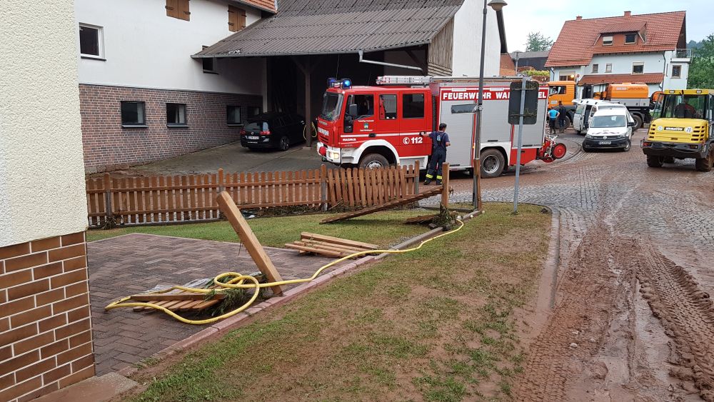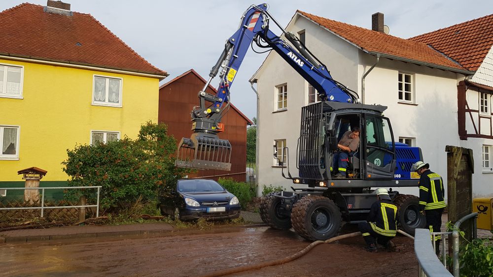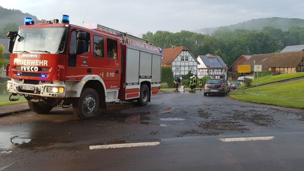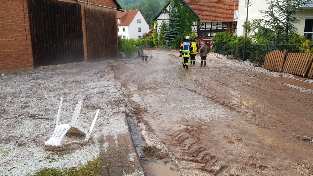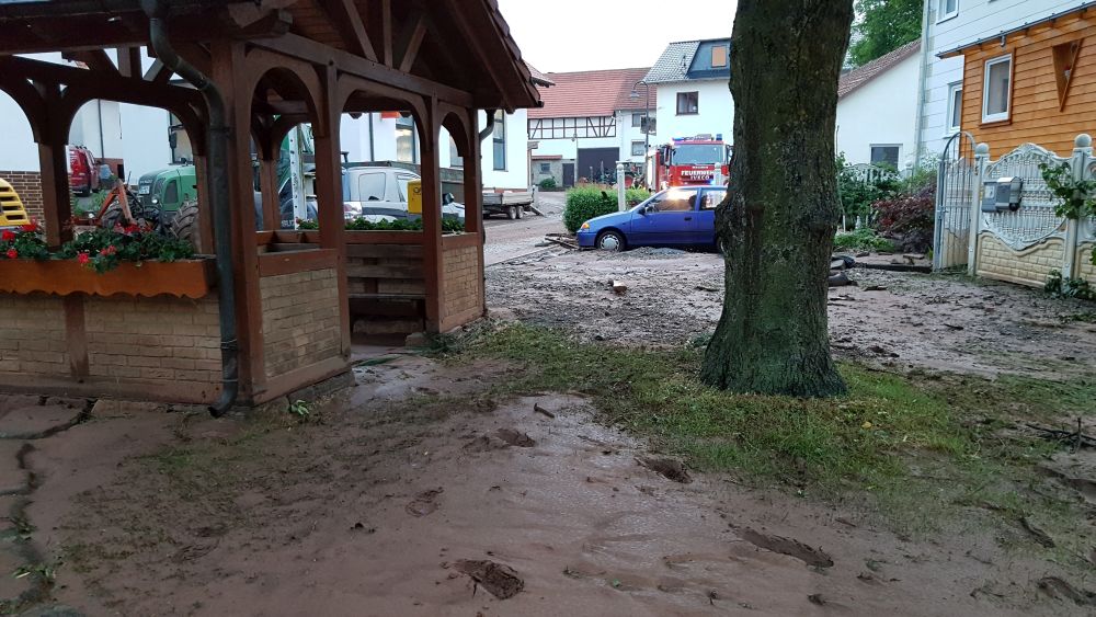 Waldkappel – Schwere Unwetter zogen am späten Sonntagnachmittag über Nordhessen. Besonders betroffen war der Werra Meissner Kreis im Raum Waldkappel. Mit Gewitter, Hagel und Überflutungen stellte das Wetter die letzten schönen Tage den Anwohnern in Hetzerode, Mäckelsdorf und Friemen in Rechnung. Die Menschen wissen wie es ist, wenn Unwetter über den Ort ziehen, jedoch so schlimm wie diesmal war es noch nie, so ein Anwohner. Die Feuerwehr hatte mit 30 Einsatzstellen an drei Orten zu kämpfen. Gleich zu Beginn des Einsatzes gab es eine erschreckende Meldung, das sich noch Menschen in einem PKW befanden, der von den Schlammmassen mitgerissen wurde.