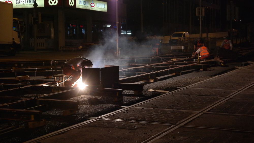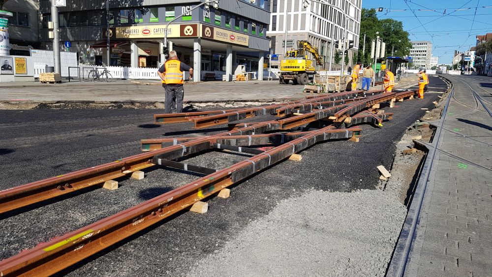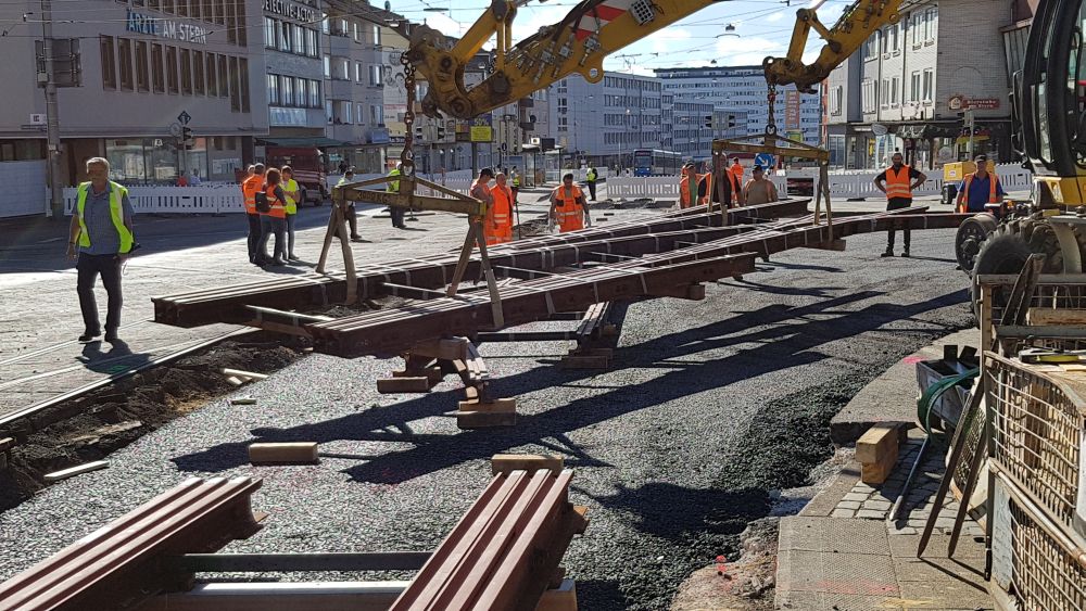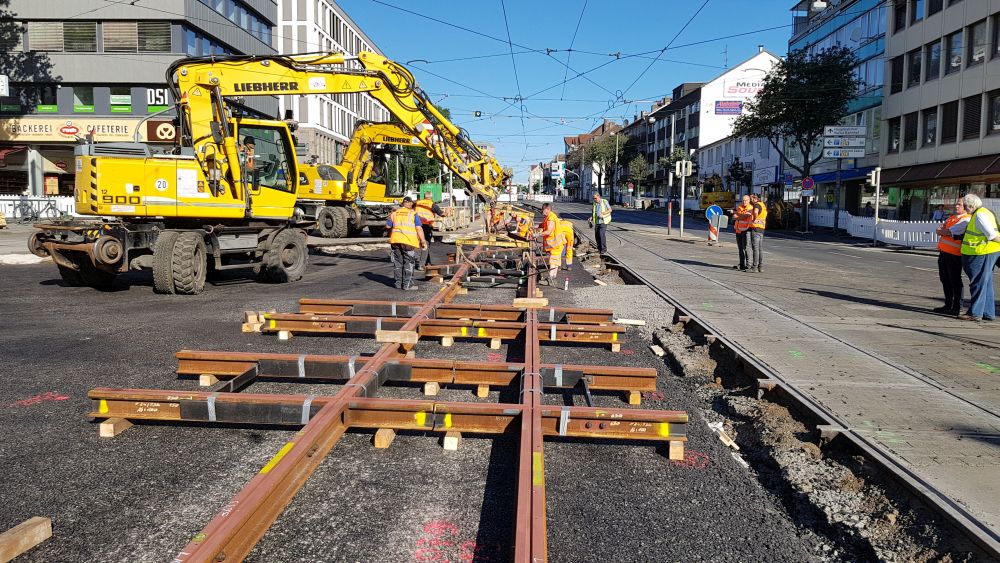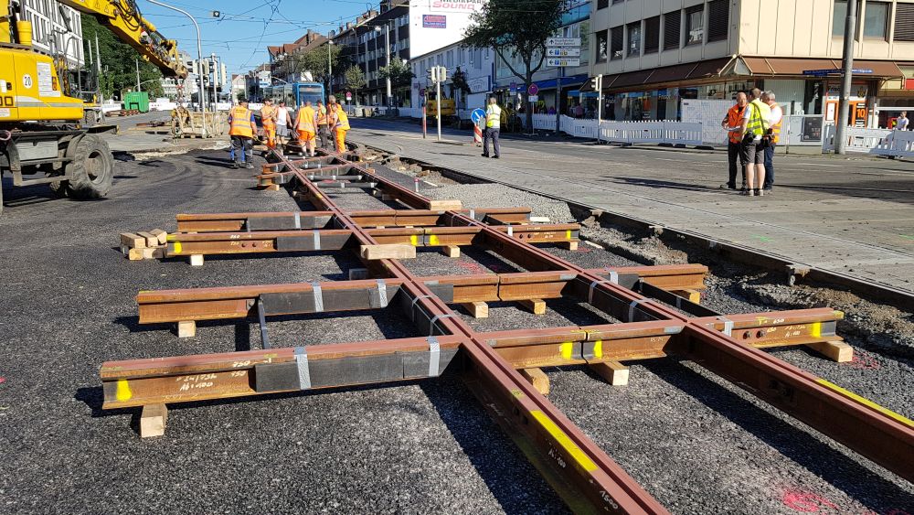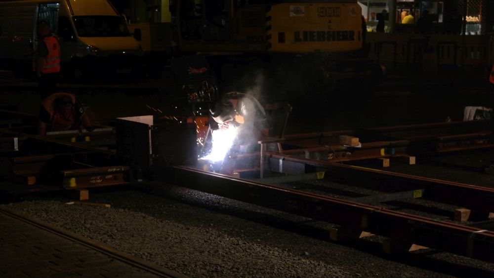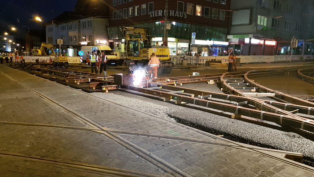 Heidi Hamdat Sprecherin der KVG gibt zu, dass es ein sehr enger Zeitplan ist, man zeigt sich jedoch zuversichtlich den Termin einhalten zu können. Jetzt am Wochenende kamen die LKWs mit dem Weichen an, die zunächst abgeladen werden mussten. Für die Mitarbeiter der KVG ist dies die schwierigste Baustelle überhaupt. Das Problem liegt besonders in der Aufrechterhaltung des Verkehrsbetriebs rund um die Baustelle, denn wenn während der Arbeiten Busse und Bahnen fahren, ist erhöhte Aufmerksamkeit gefordert. Das schöne Wetter sorgte nun dafür, dass die für den Tag geplanten Schweißarbeiten in die Nacht verlegt werden mussten. Insgesamt werden hier rund 800 Meter Gleise mit 16 Weichen und einem Gesamtgewicht von etwa 243 Tonnen verbaut. Jetzt bleibt abzuwarten ob alles nach Plan weiter läuft, denn die Zeit drängt und die Sommerferien in Hessen enden am 03. August 2018.