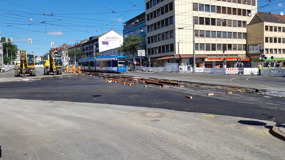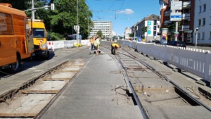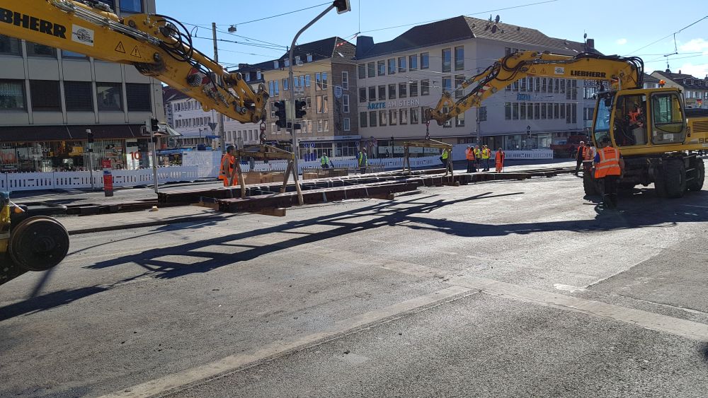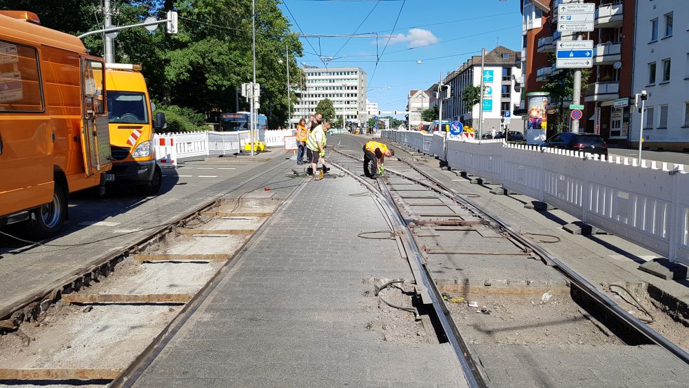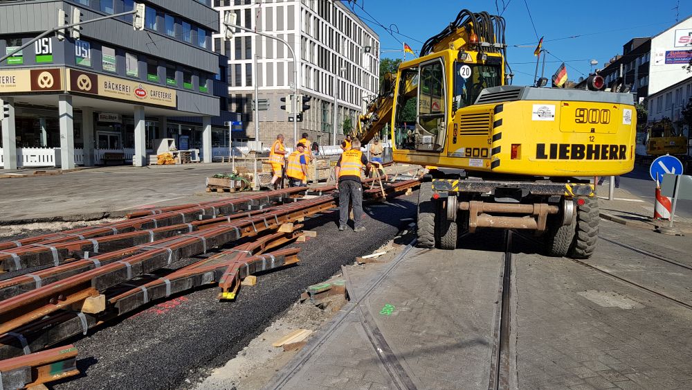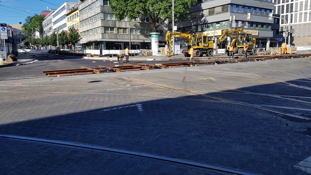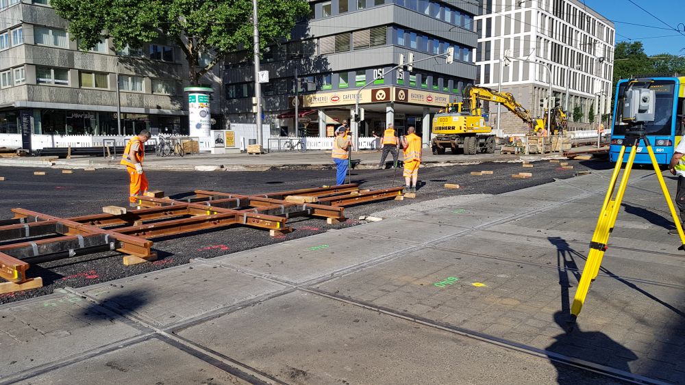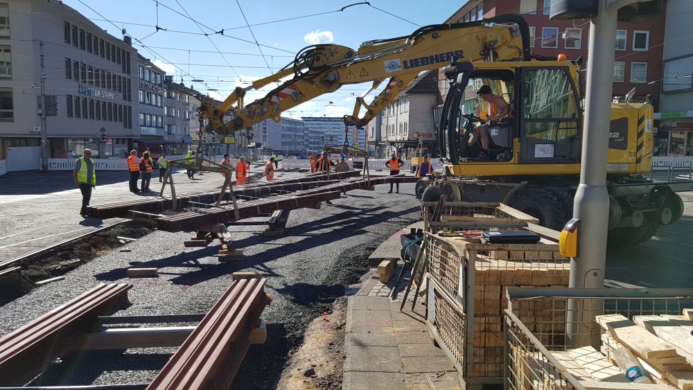 Heidi Hamdat Sprecherin der KVG gibt zu, dass es ein sehr enger Zeitplan ist, man zeigt sich jedoch zuversichtlich den Termin einhalten zu können. Jetzt am Wochenende kamen die LKWs mit dem Weichen an, die zunächst abgeladen werden mussten. Für die Mitarbeiter der KVG ist dies die schwierigste Baustelle überhaupt. Das Problem liegt besonders in der Aufrechterhaltung des Verkehrsbetriebs rund um die Baustelle, denn wenn während der Arbeiten Busse und Bahnen fahren, ist erhöhte Aufmerksamkeit gefordert. Das schöne Wetter sorgte nun dafür, dass die für den Tag geplanten Schweißarbeiten in die Nacht verlegt werden mussten. Insgesamt werden hier rund 800 Meter Gleise mit 16 Weichen und einem Gesamtgewicht von etwa 243 Tonnen verbaut. Jetzt bleibt abzuwarten ob alles nach Plan weiter läuft, denn die Zeit drängt und die Sommerferien in Hessen enden am 03. August 2018.