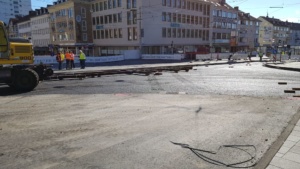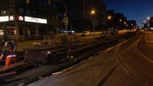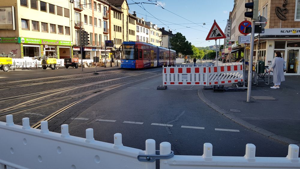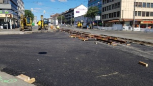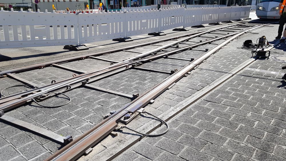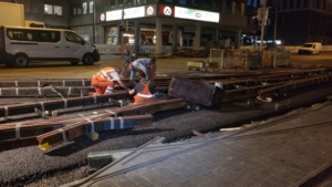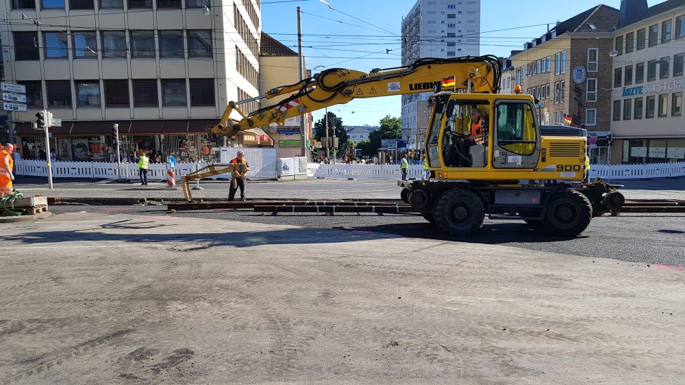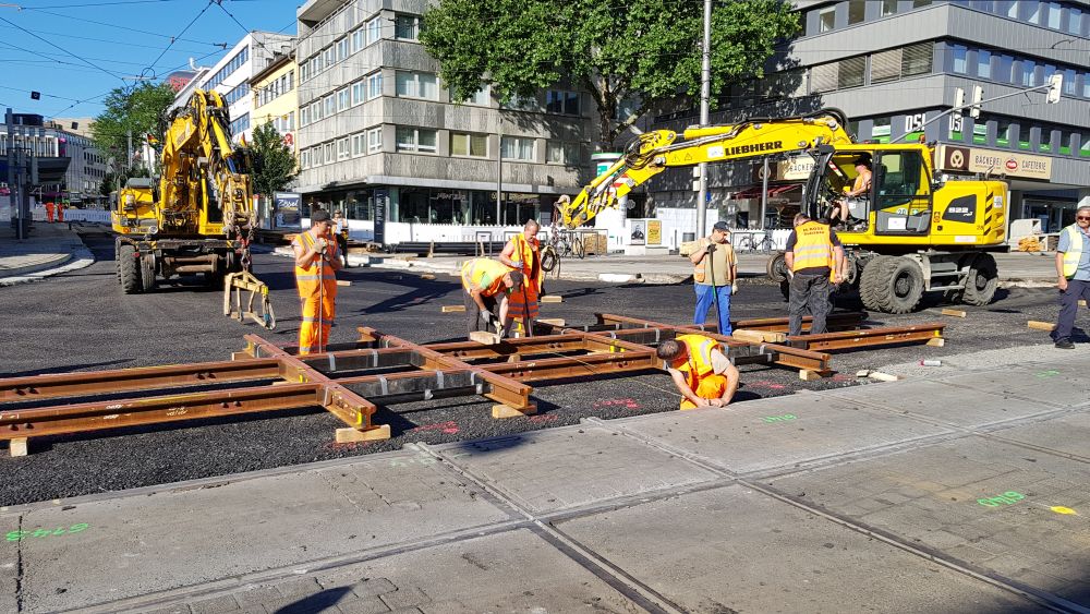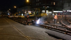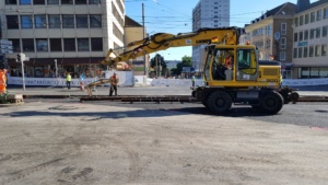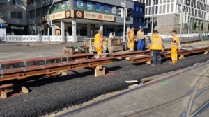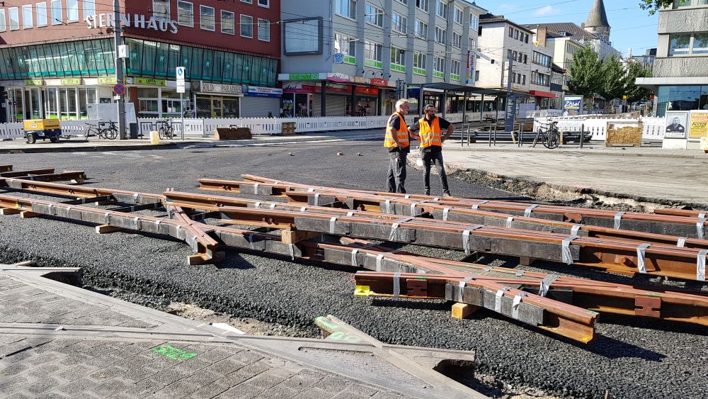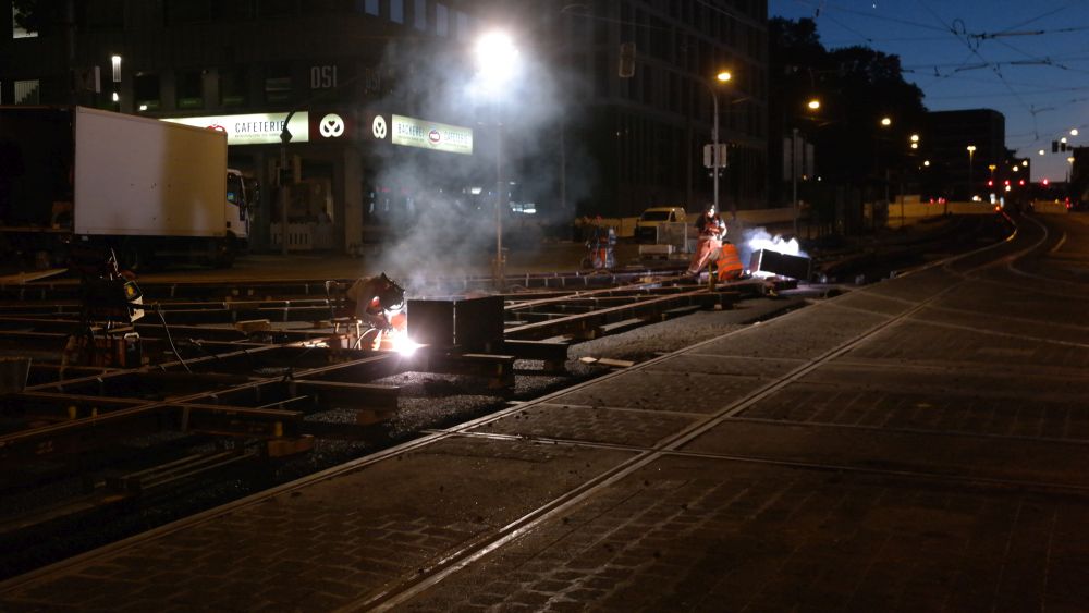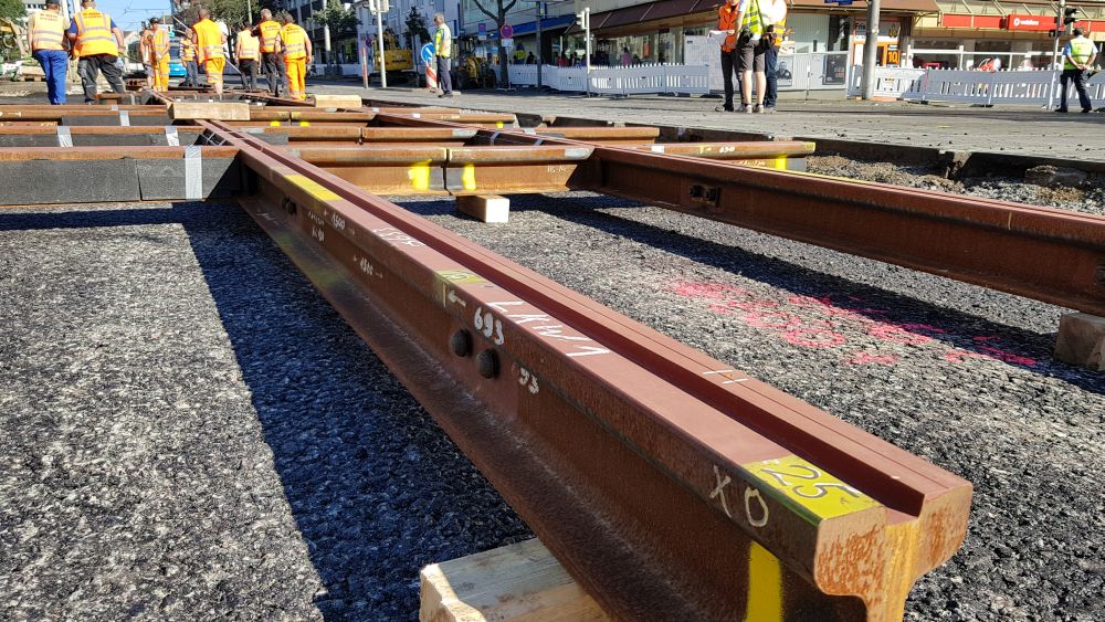 Heidi Hamdat Sprecherin der KVG gibt zu, dass es ein sehr enger Zeitplan ist, man zeigt sich jedoch zuversichtlich den Termin einhalten zu können. Jetzt am Wochenende kamen die LKWs mit dem Weichen an, die zunächst abgeladen werden mussten. Für die Mitarbeiter der KVG ist dies die schwierigste Baustelle überhaupt. Das Problem liegt besonders in der Aufrechterhaltung des Verkehrsbetriebs rund um die Baustelle, denn wenn während der Arbeiten Busse und Bahnen fahren, ist erhöhte Aufmerksamkeit gefordert. Das schöne Wetter sorgte nun dafür, dass die für den Tag geplanten Schweißarbeiten in die Nacht verlegt werden mussten. Insgesamt werden hier rund 800 Meter Gleise mit 16 Weichen und einem Gesamtgewicht von etwa 243 Tonnen verbaut. Jetzt bleibt abzuwarten ob alles nach Plan weiter läuft, denn die Zeit drängt und die Sommerferien in Hessen enden am 03. August 2018.