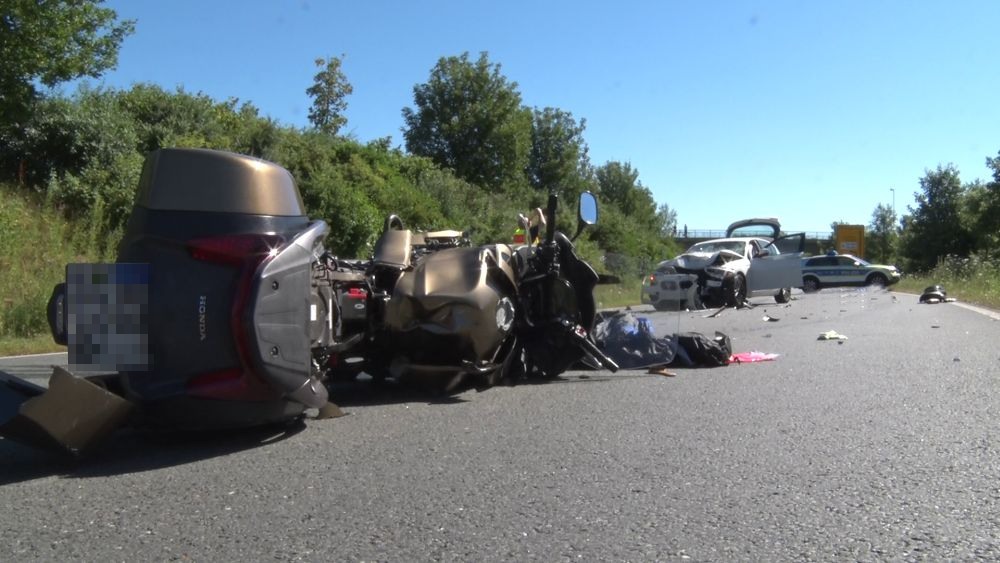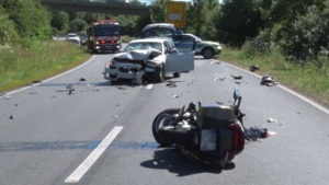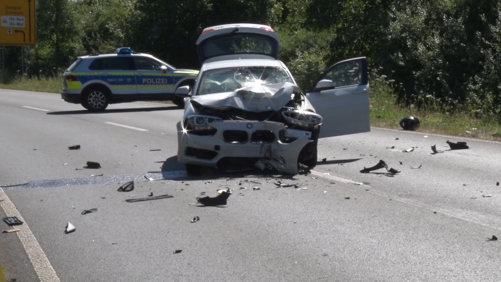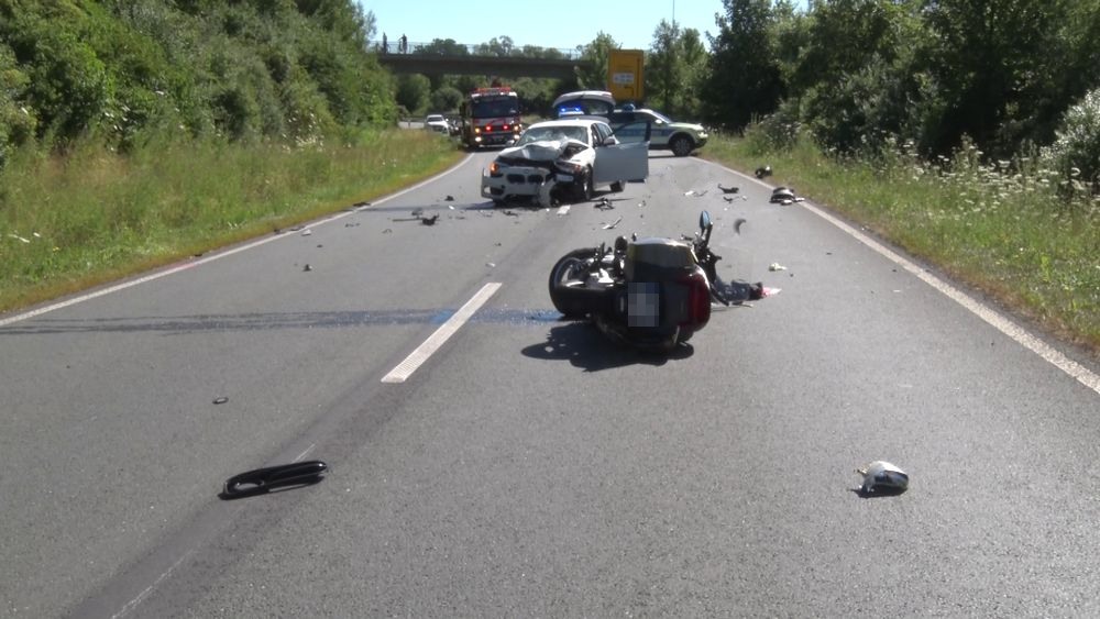 Etwa 300 Meter nach dem Abzweig Röddenau kam der BMW Fahrer aus bisher nicht geklärter Ursache in einer Rechtskurve in den Gegenverkehr. Ein 61-jährige Motorradfahrer hatte keine Chance auszuweichen und stieß mit dem BMW frontal zusammen. Der Aufprall war so heftig, dass der Mann noch an der Unfallstelle verstarb. Ein sofort zur Einsatzstelle gerufener Notarzt konnte nur noch den Tod des Mannes feststellen. Auf Anordnung der Staatsanwaltschaft wurde ein Gutachter in die Ermittlungen einbezogen. Die Fahrbahn musste während der Unfallaufnahme komplett gesperrt werden.