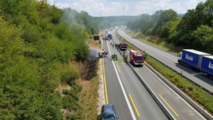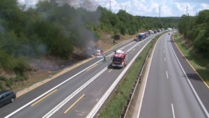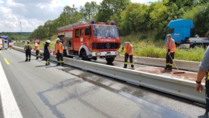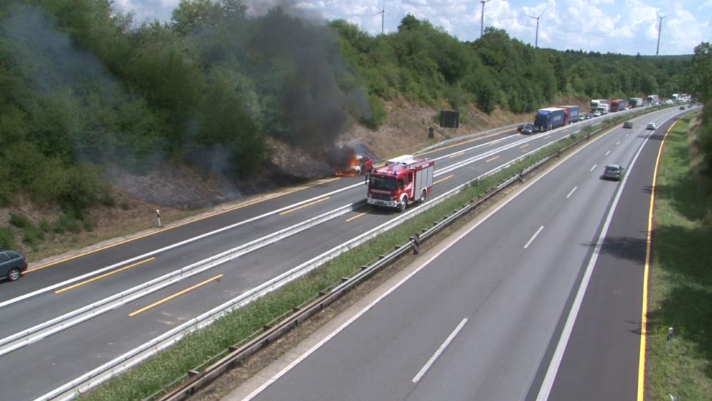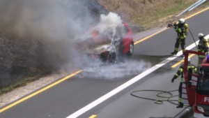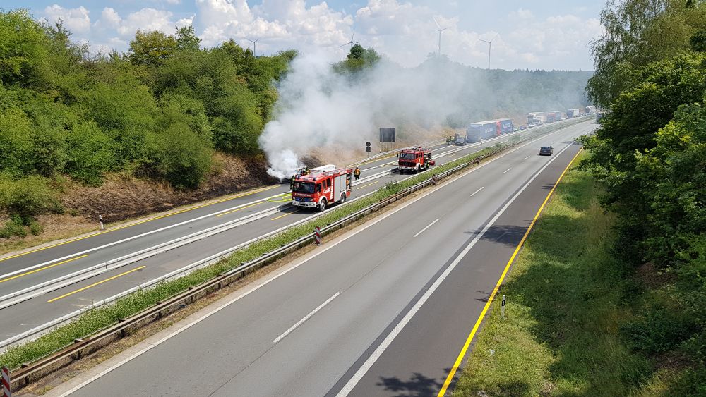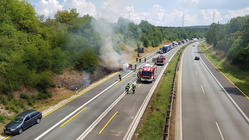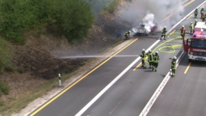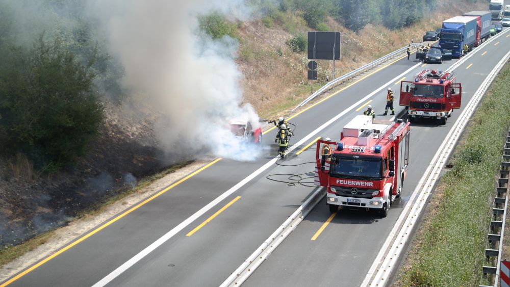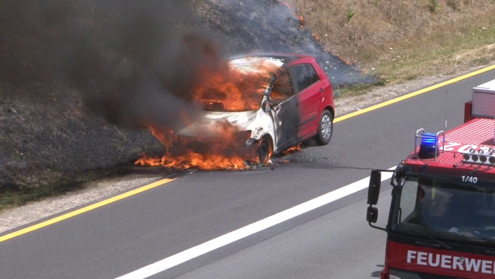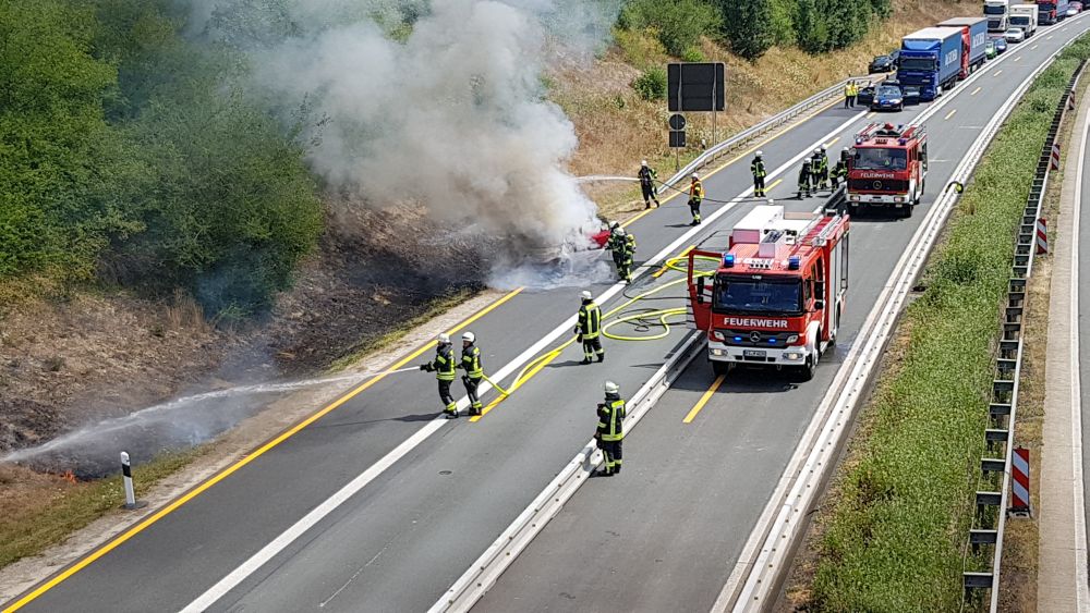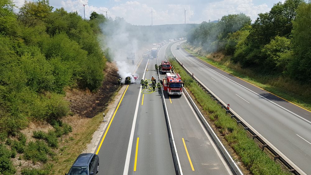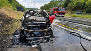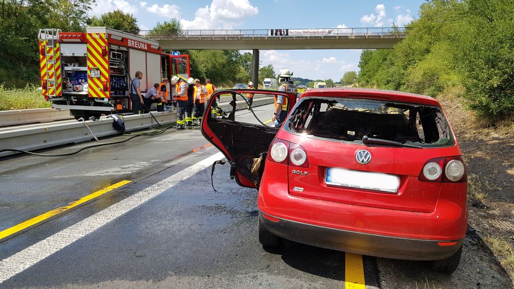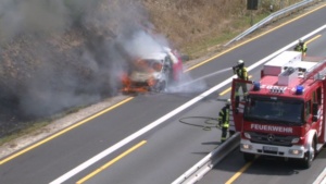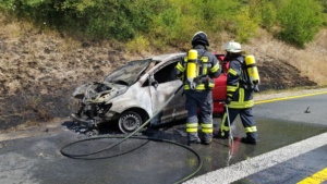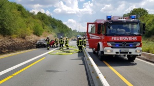 Breuna – Am Montag gegen 13 Uhr kam es auf der A44 kurz vor der Ausfahrt Breuna in Richtung Dortmund zum Brand eines PKW. Der Fahrer aus Sachsen Anhalt konnte das Fahrzeug unverletzt verlassen und wurde von Ersthelfern betreut. Die Feuerwehr kam trotz einer Baustelle sehr schnell an die Einsatzstelle, weil die zweite gesperrte Spur zum Glück frei war. Dennoch stand das Fahrzeug beim Eintreffen der Einsatzkräfte bereits im Vollbrand. Auch Teile der Böschung hatten bereits Feuer gefangen.