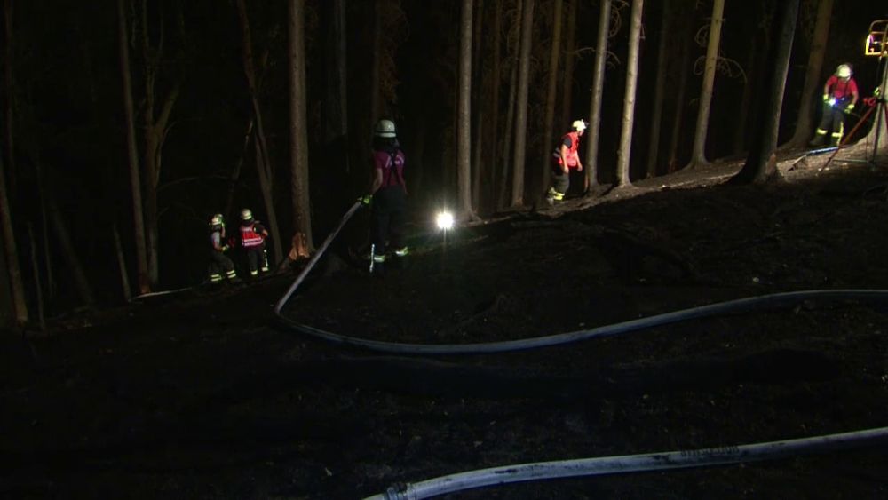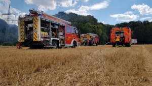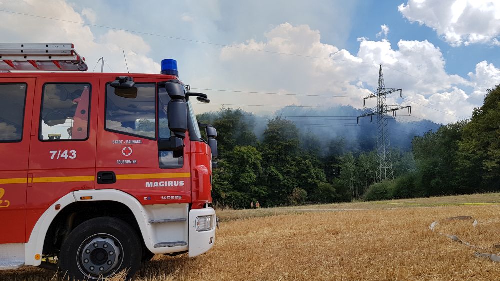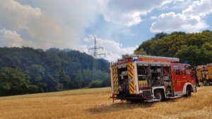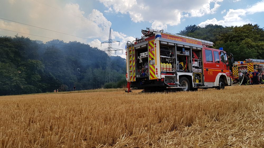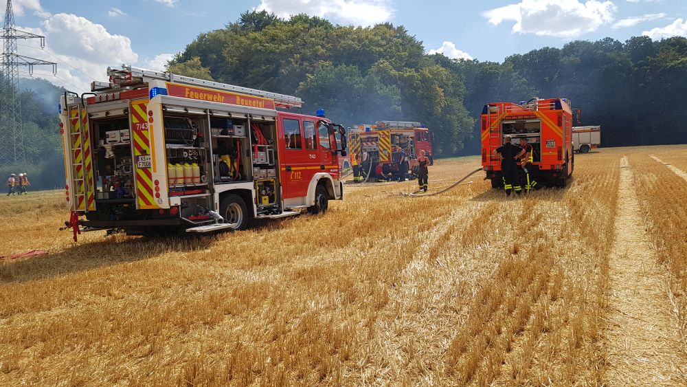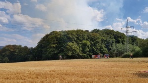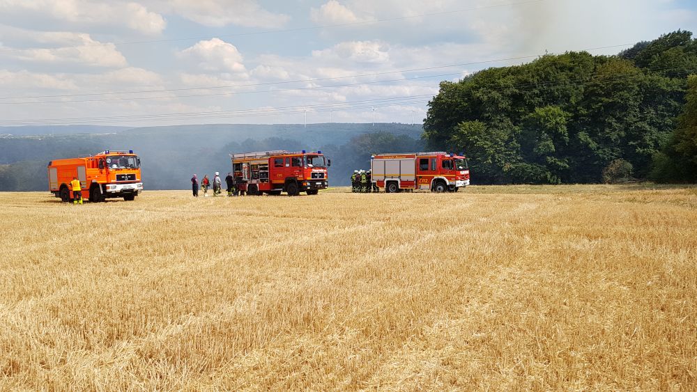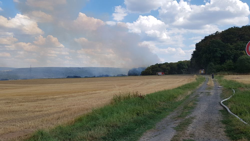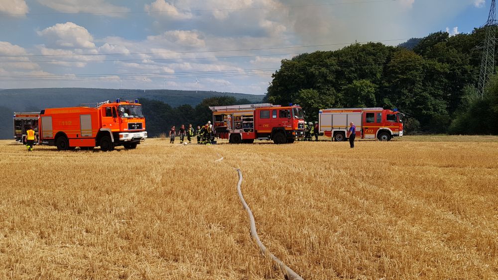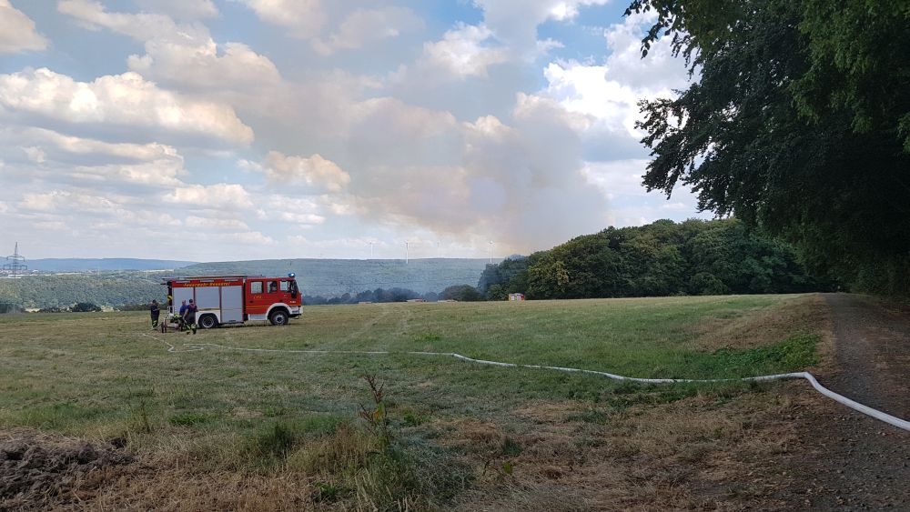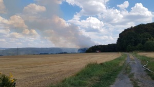 Ein Pendelverkehr wurde aufgebaut, damit immer genügend Löschwasser zur Verfügung stand. Die Feuerwehrkameraden und Kameradinnen mussten ständig abgewechselt werden. Zum einen müssen sie ständig ihre Schutzkleidung tragen, zum anderen herrschen unerträgliche Außentemperaturen. Zu allem Unglück gab es bereits zwei Verletzte unter den Einsatzkräften. Eine Person litt unter Erschöpfung, eine weitere hatte sich am Fuß verletzt. Insgesamt waren bei dem Feuer rund 3000m² Wald und 5000m² Stoppelfeld in Brand geraten. Auch drei Hubschrauber wurden zur Brandbekämpfung eingesetzt. Der Rettungshubschrauber Christoph 7 zur Erkundung und zwei zum Abwurf von Löschwasser. Gegen Abend wurden dann weitere Kräfte alarmiert, um die Einsatzstelle auszuleuchten. Durch die enorme Rauchentwicklung musste auch die ICE Strecke gesperrt werden, die jedoch gegen 19.30 Uhr wieder frei gegeben werden konnte. Allerdings mussten die Zugführer langsam auf Sicht fahren um die Einsatzkräfte nicht zu gefährden. Die Einsatzleitung geht nun davon aus, dass die Löscharbeiten noch bis in die Morgenstunden andauern wird.