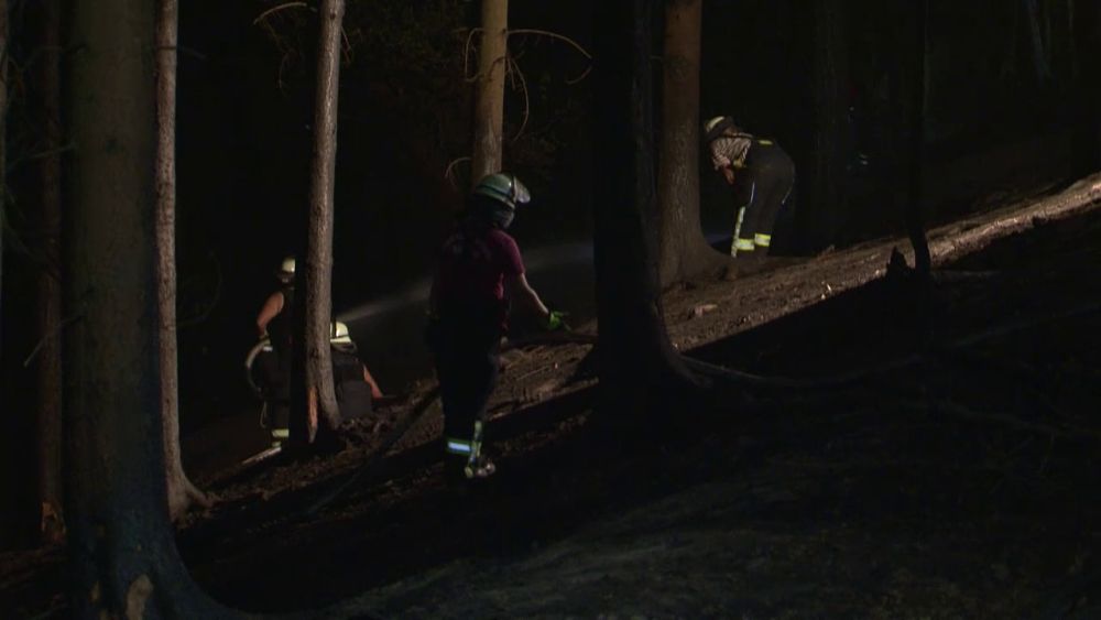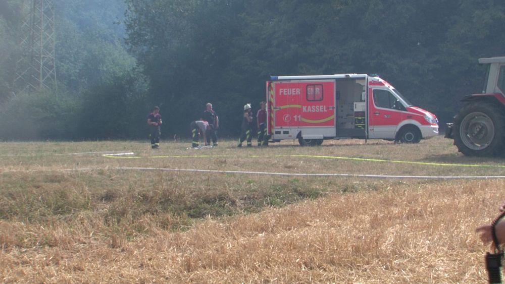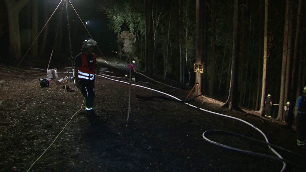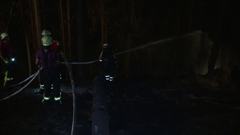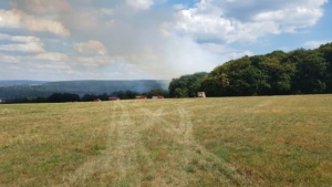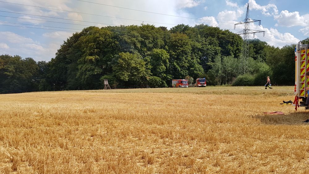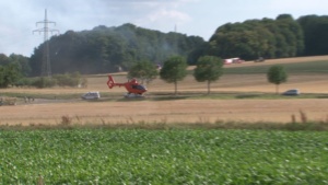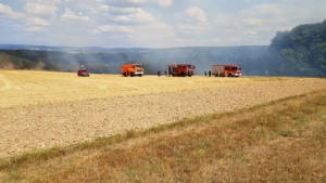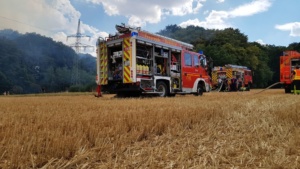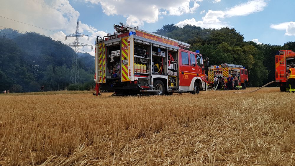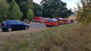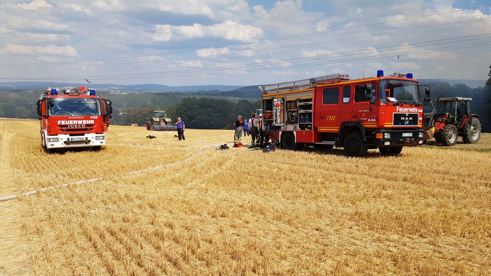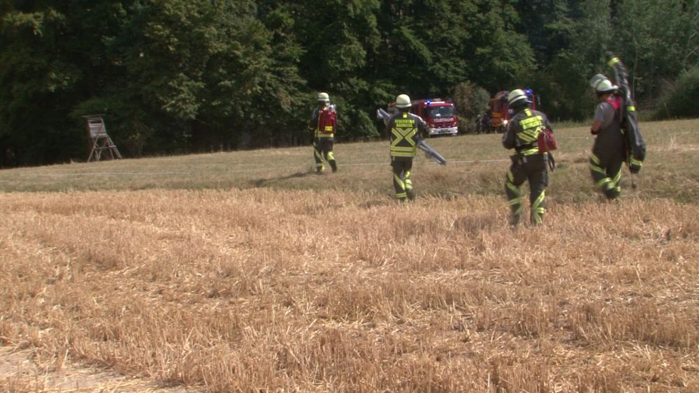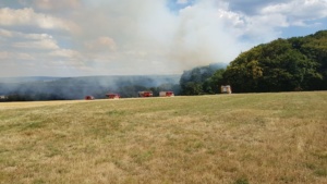 Ein Pendelverkehr wurde aufgebaut, damit immer genügend Löschwasser zur Verfügung stand. Die Feuerwehrkameraden und Kameradinnen mussten ständig abgewechselt werden. Zum einen müssen sie ständig ihre Schutzkleidung tragen, zum anderen herrschen unerträgliche Außentemperaturen. Zu allem Unglück gab es bereits zwei Verletzte unter den Einsatzkräften. Eine Person litt unter Erschöpfung, eine weitere hatte sich am Fuß verletzt. Insgesamt waren bei dem Feuer rund 3000m² Wald und 5000m² Stoppelfeld in Brand geraten. Auch drei Hubschrauber wurden zur Brandbekämpfung eingesetzt. Der Rettungshubschrauber Christoph 7 zur Erkundung und zwei zum Abwurf von Löschwasser. Gegen Abend wurden dann weitere Kräfte alarmiert, um die Einsatzstelle auszuleuchten. Durch die enorme Rauchentwicklung musste auch die ICE Strecke gesperrt werden, die jedoch gegen 19.30 Uhr wieder frei gegeben werden konnte. Allerdings mussten die Zugführer langsam auf Sicht fahren um die Einsatzkräfte nicht zu gefährden. Die Einsatzleitung geht nun davon aus, dass die Löscharbeiten noch bis in die Morgenstunden andauern wird.