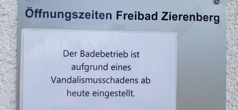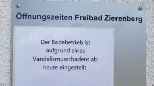 Zierenberg – In der Nacht von Donnerstag auf Freitag haben bisher Unbekannte eine Mülltonne in das Hauptbecken des Freibades Zierenberg ausgekippt. Papier, Windeln, Essensreste und Plastikabfall musste aus dem Becken gefischt werden. Das hat den Übertätern jedoch noch nicht gereicht, denn die Schilder am Sprungturm wurden ebenfalls abgerissen und ins Becken geworfen.