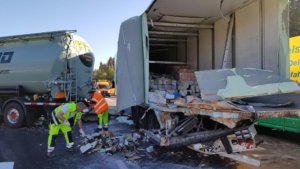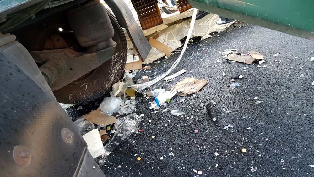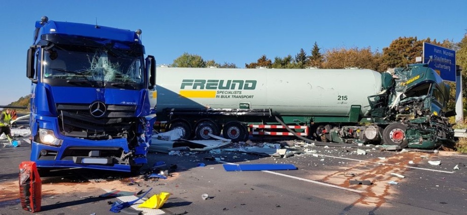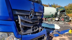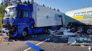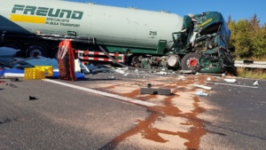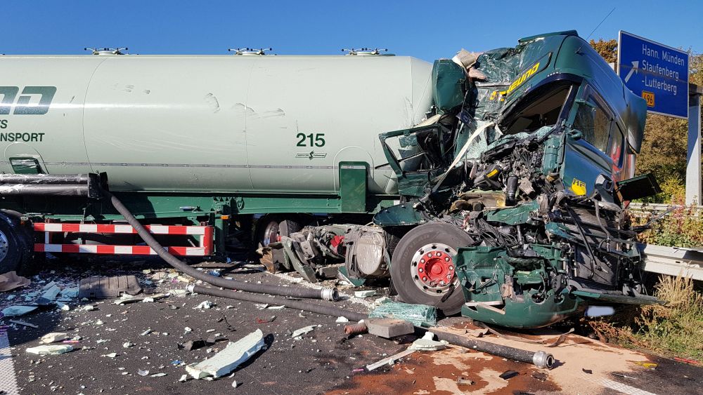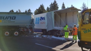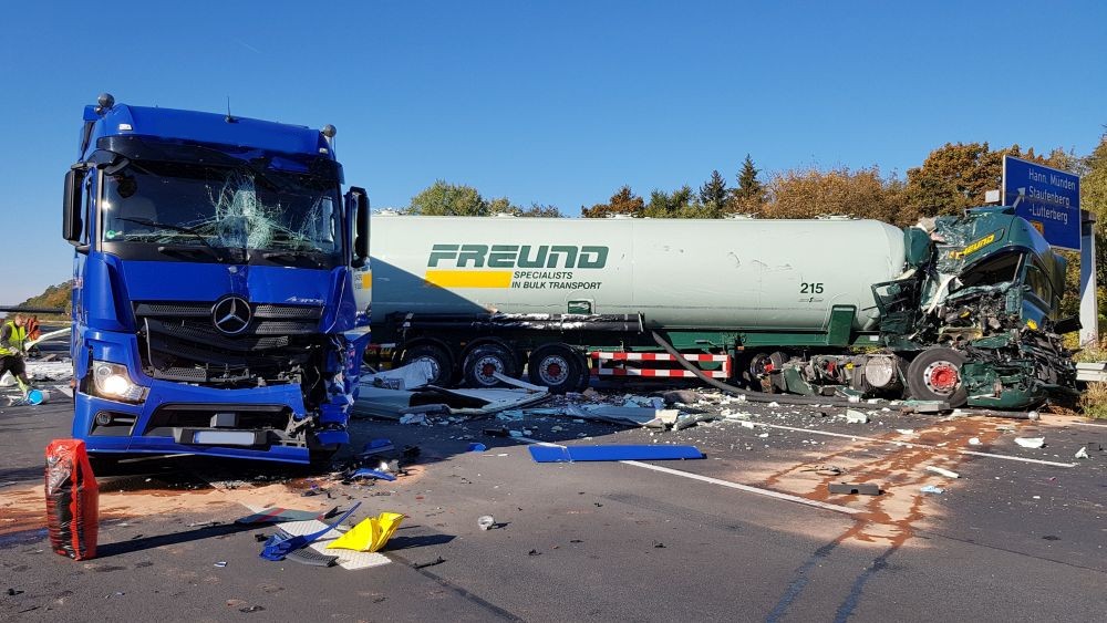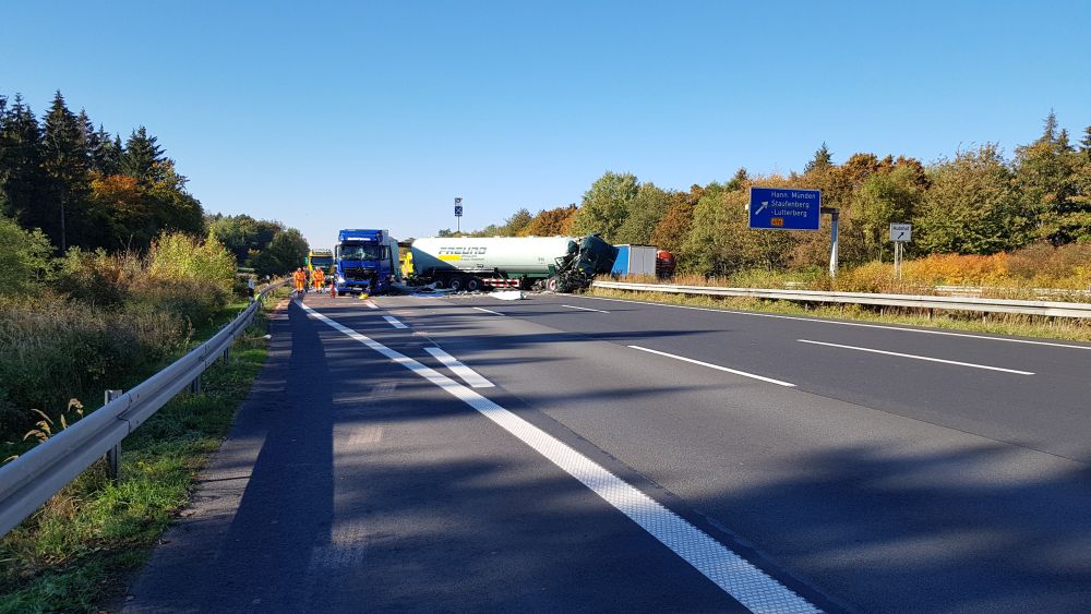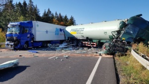 Hann. Münden – Am Donnerstagvormittag gegen 08.50 Uhr kam es auf der A7 kurz nach der Anschlussstelle Hann. Münden Lutterberg zu einem schweren Unfall mit mehreren LKW. Aus bisher nicht geklärter Ursache krachten insgesamt drei LKW ineinander. Wie durch ein Wunder werden trotz dieser erschreckenden Bilder die drei Fahrer nur leicht verletzt. Die Ladung bestehend aus Süßigkeiten, Sekt und Lebensmitteln verteilte sich über die gesamte Fahrbahn.