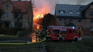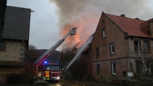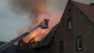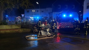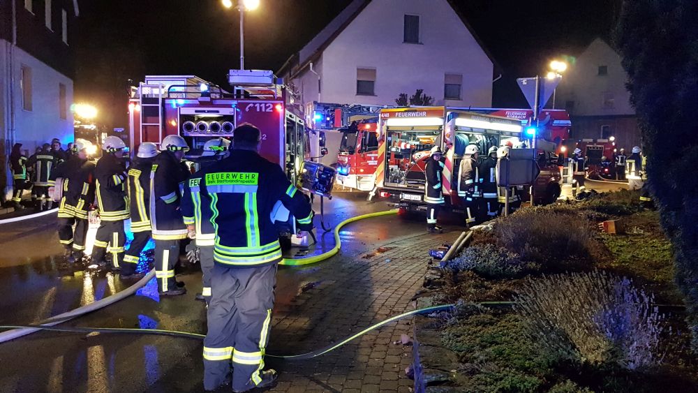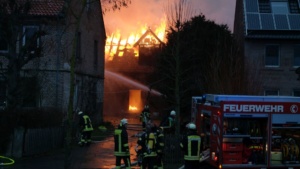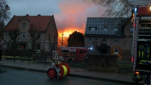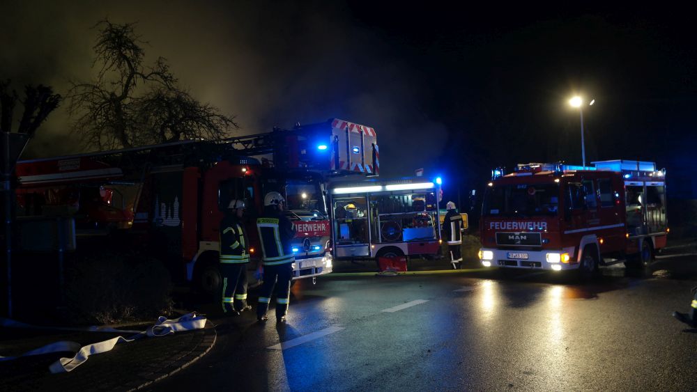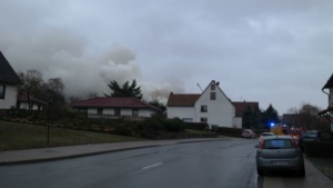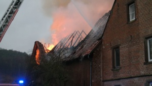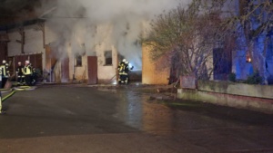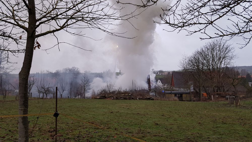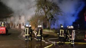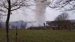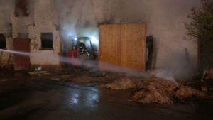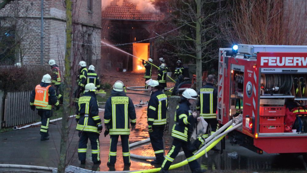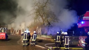 Rund 30 Km weiter in Ehringen sah es dann am frühen Morgen gegen 8.30 Uhr anders aus. Hier stand beim Eintreffen der Feuerwehr eine Scheune bereits im Vollbrand. Die Löschmaßnahmen gestalteten sich schwierig, auf Grund der engen Bebauung. Mit rund 120 Einsatzkräften und zwei Drehleitern konnten die Flammen schnell eingedämmt werden, dennoch erlitt die Scheune einen Totalschaden. Hilfreich war hier insbesondere die gute Wasserversorgung, durch einen Bach, der direkt gegenüber des Brandortes verlief. Durch den schnellen Einsatz der Feuerwehr, konnte das angrenzende Wohnhaus gerettet werden. Auch hier wurde zum Glück niemand verletzt. Wie es zu diesem Brand kommen konnte ist aktuell noch unklar.