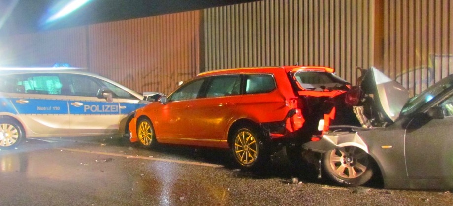 Der Abschleppdienst war gerade vor Ort, um einen beschädigten PKW aufzuladen, der nach einem Unfall im Begegnungsverkehr noch auf der Fahrbahn stand. Ein 78-jähriger Bad Vilbeler hielt von Frankfurt kommend mit seinem VW Passat bereits in einigem Abstand vor dem Streifenwagen, da er aufgrund der Abschleppung die Unfallstelle nicht passieren konnte. Ein 42-jähriger Bad Vilbeler erkannte die Situation vor sich offenbar zu spät. Mit seinem BMW fuhr er vermutlich ungebremst auf den Passat auf, der durch die Wucht des Aufpralls gegen den Streifenwagen geschoben wurde. Beide Vilbeler Fahrzeugführer und ein auf dem Beifahrersitz des Streifenwagens sitzender Polizeibeamter verletzten sich dabei leicht. Rettungswagen brachten sie zur Behandlung ins Krankenhaus. Ein weiterer Polizist erlitt einen Schock. Beide Beamte konnten nach dem Unfall ihren Dienst nicht fortsetzen. An allen drei PKW entstand mit rund 80.000 Euro Sachschaden, sie mussten abgeschleppt werden. Die Feuerwehr kam zum Einsatz, um die auslaufenden Betriebsstoffe zu binden. Die Bundesstraße 3 bei Dortelweil blieb bis 02.30 Uhr für die Rettungs- und Bergungsarbeiten voll gesperrt. Da bei dem 42-jährigen Vilbel Alkoholgeruch festgestellt werden konnte, wurde eine Blutentnahme durchgeführt. Es besteht der Verdacht, dass der Fahrer aufgrund eines vorausgegangenen Alkoholkonsums nicht fahrtüchtig war. Sein Führerschein wurde sichergestellt.