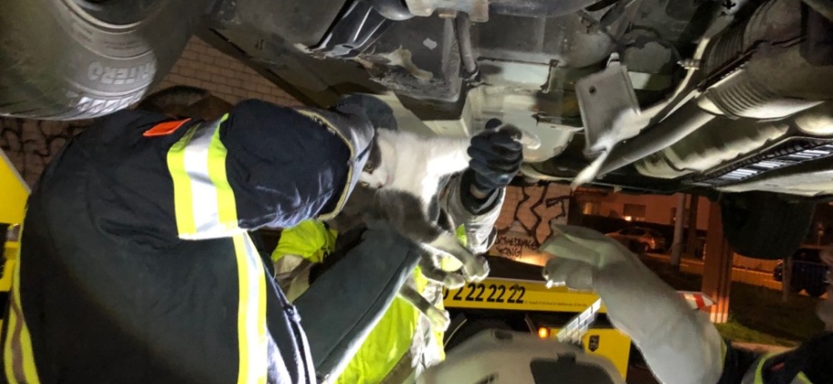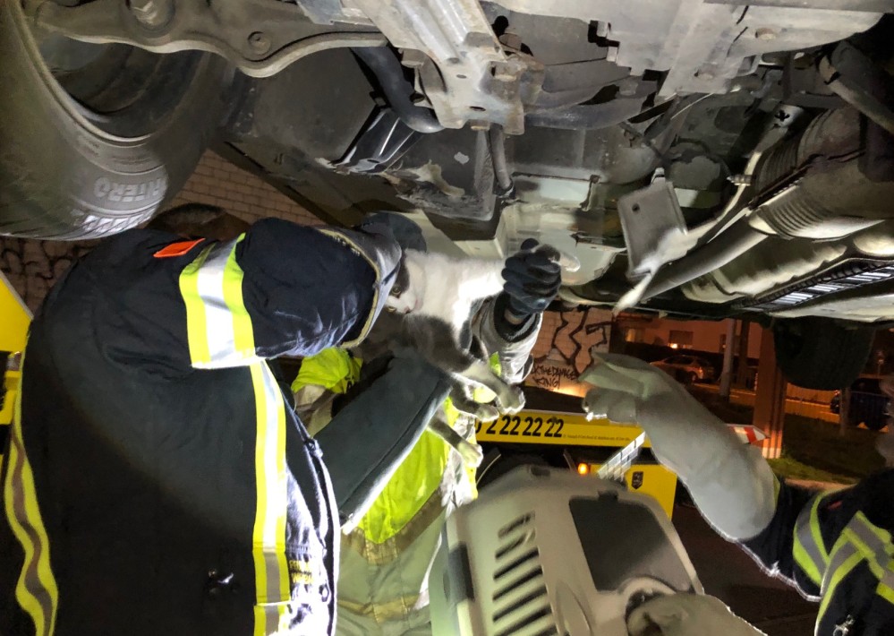 Als die Besitzer das Fahrzeug starteten, gelang es ihr nicht, sich schnell genug wieder zu entfernen. So musste sie die acht Kilometer lange Fahrt wohl oder übel unter dem Fahrzeug als „blinder Passagier“ zurücklegen. Doch selbst als das Fahrzeug auf dem Parkplatz in der Dotzheimer Straße zum Stehen kam, gelang es ihr nicht mehr sich zu befreien. Die Besitzer das Fahrzeug, die durch das Maunzen der Katze aufmerksam wurden, verständigten die Leitstelle der Feuerwehr Wiesbaden, die das Kleinalarmfahrzeug mit zwei Feuerwehrleuten in Marsch setzte. Sie benötigten einige Zeit um die Katze im Fahrzeug überhaupt zu lokalisieren. Auch ihnen gelang es zuerst nicht die Katze unter dem Fahrzeug zu befreien, da hierfür das Platzangebot nicht ausreichte. Also verständigte man ein Abschleppunternehmen, welches den PKW mit dem Kran des Abschleppfahrzeugs soweit anheben konnte, dass die Einsatzkräfte weitere Verkleidungsteile entfernen konnten. So gelang es schließlich die Katze augenscheinlich unverletzt zu befreien. Um herauszufinden, wohin die Katze gehört, nutzen die Einsatzkräfte anschließend ein spezielles Lesegerät und hatten Glück: Die Katze war tatsächlich mit einem Chip versehen über den die Besitzer ermittelt werden konnten. Nach einigen Telefonaten waren sie informiert und konnten die Katze, die übrigens auf den Namen ‚Fleur‘ hört, auf der Feuerwache abholen und wieder in ihre Obhut nehmen.