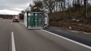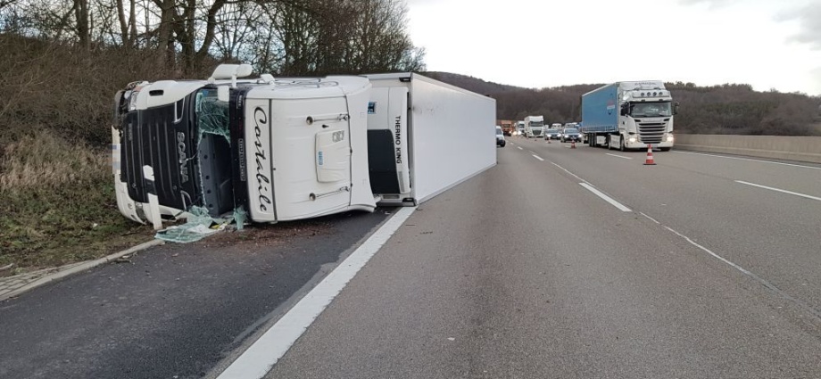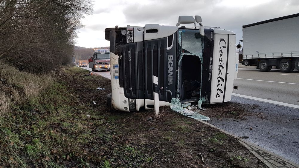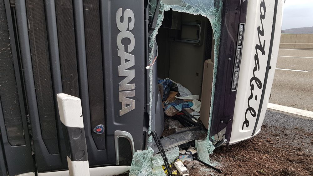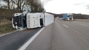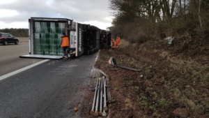 Homberg – Zu einem LKW Unfall kam es auf der A7 zwischen Hasselberg-West und der Anschlussstelle Homberg-Efze. Gegen 13.00 Uhr kam ein 63-jähriger italienischer LKW Fahrer aus bisher nicht geklärter Ursache nach rechts von der Autobahn ab, fuhr einen Hang hinauf und kippte dann mit der Linken Seite auf die Fahrbahn und blieb dort liegen.