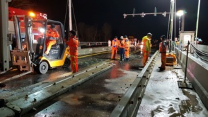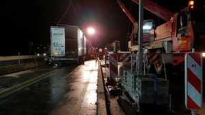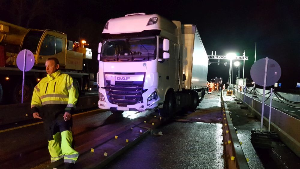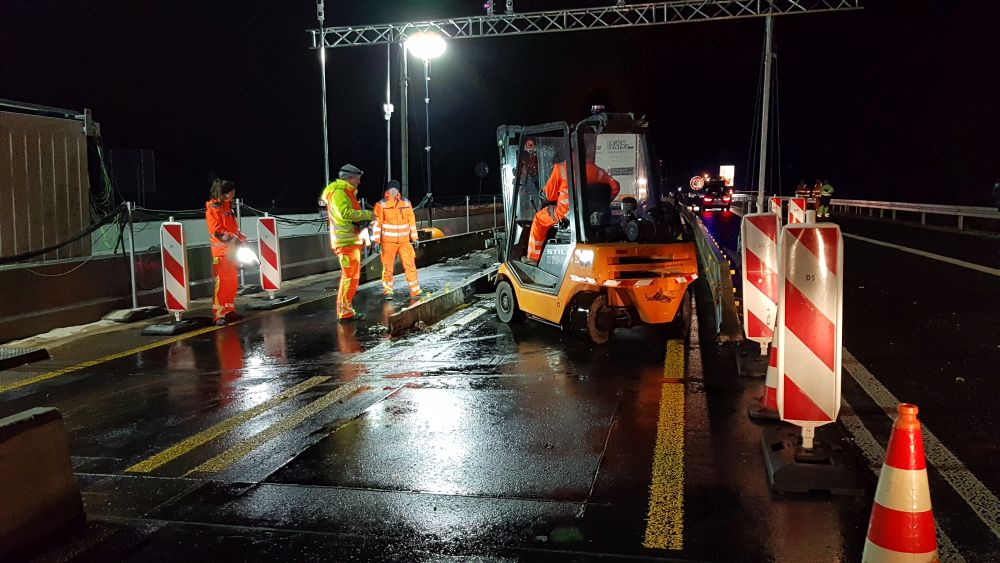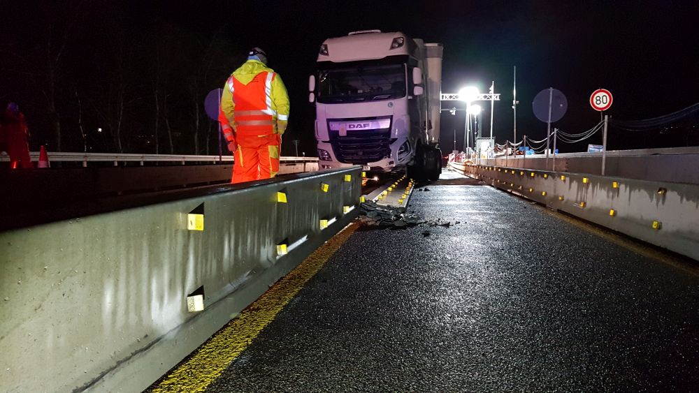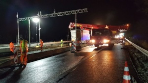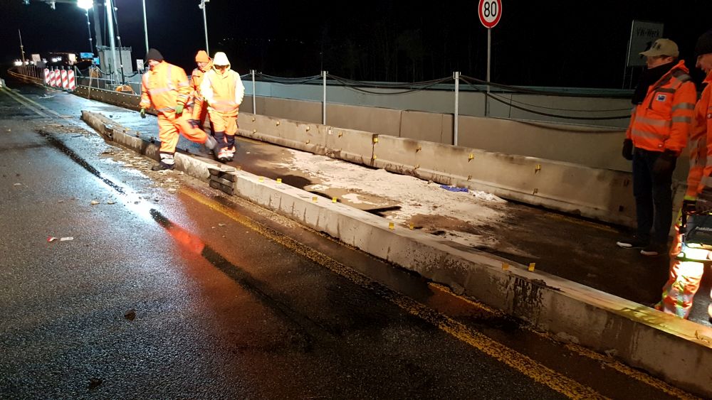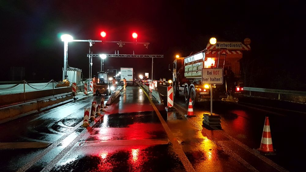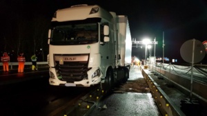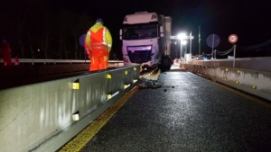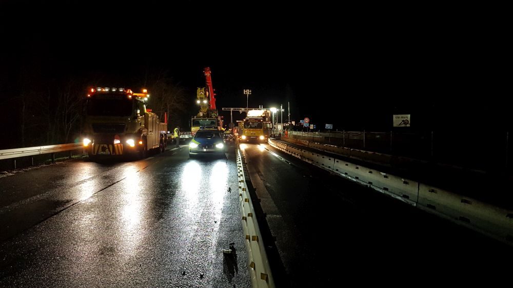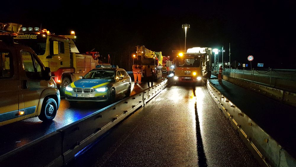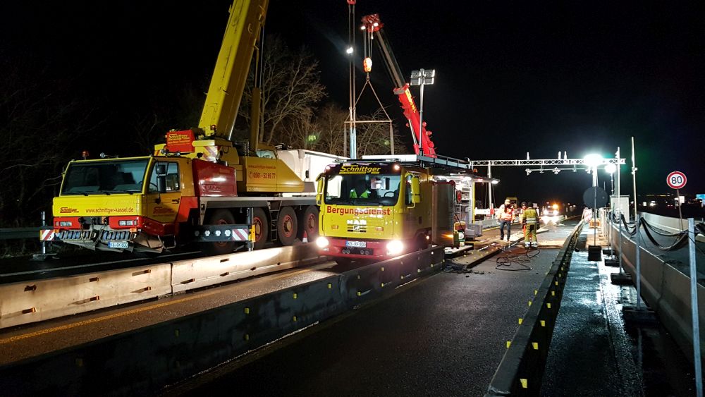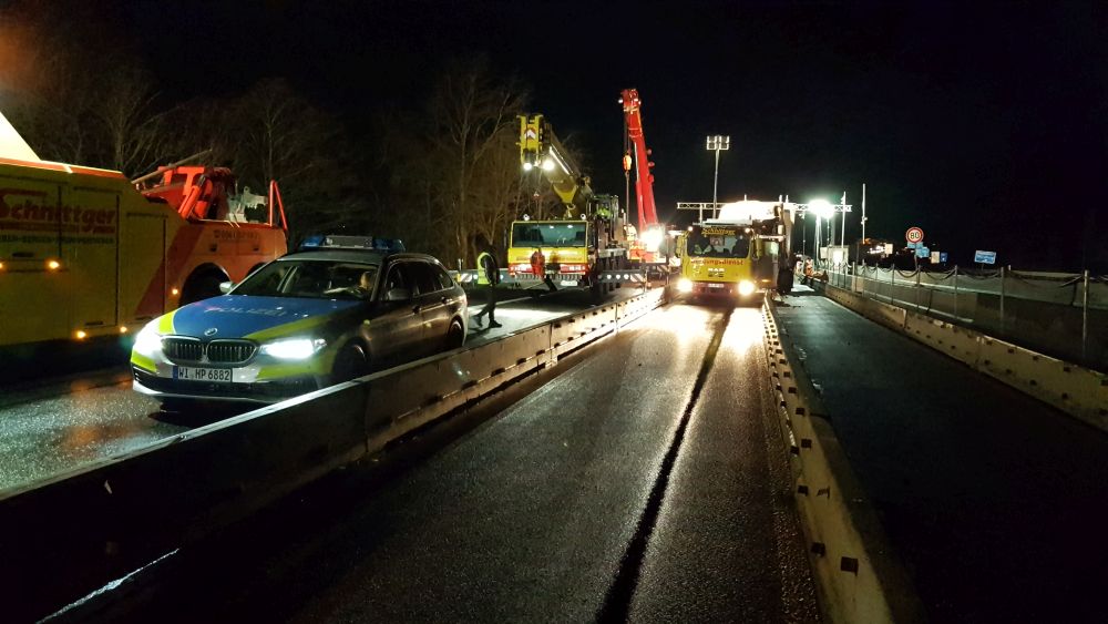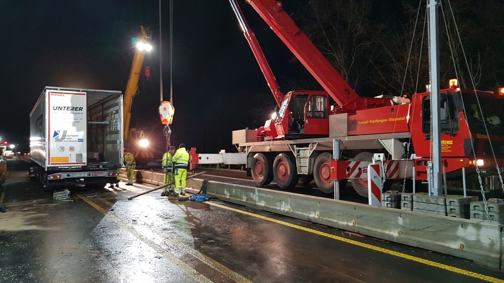 Insgesamt 16 Felder dieser Betongleitwände, die den Fahrstreifenverlauf im Bereich der in der Fahrbahn eingebauten Fahrzeugwaage vorgeben, wurden hierbei beschädigt. Der 52-jährige Fahrzeugführer blieb unverletzt, der Sachschaden wird nach ersten Schätzungen auf rund 55.000 Euro geschätzt. Allein 20.000 Euro Sachschaden dürften an den Betongleitwänden entstanden sein sowie etwa 35.000 Euro Sachschaden am Sattelzug. Die Vollsperrung der Bergshäuser Brücke in Richtung A 7, die Bergung des Sattelzuges sowie die anschließende Fahrbahnreinigung und Wiederherstellung der Betongleitwände werden voraussichtlich bis Dienstagmittag andauern.