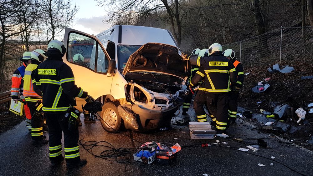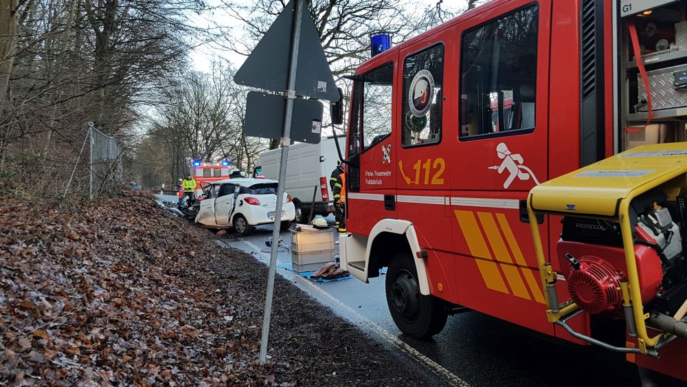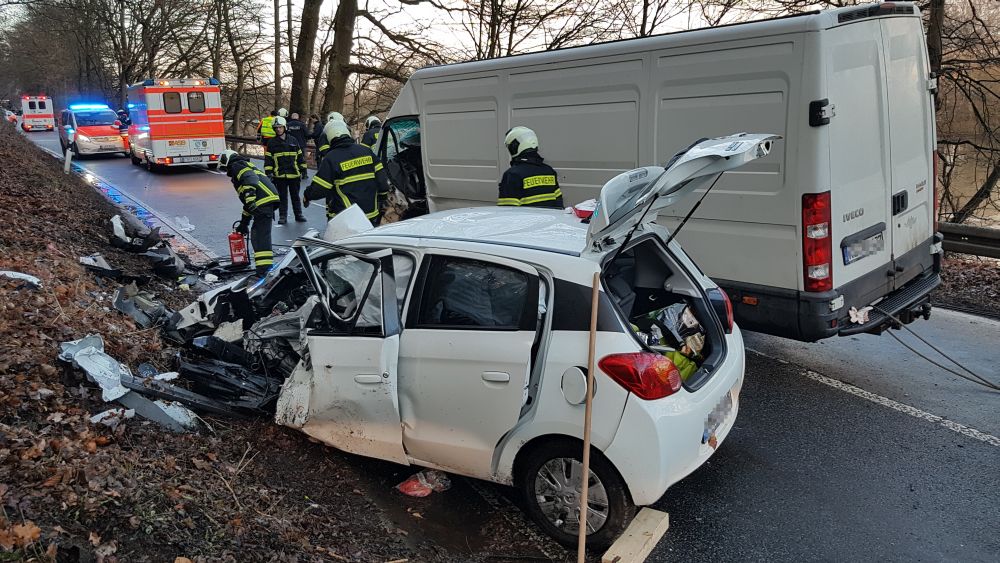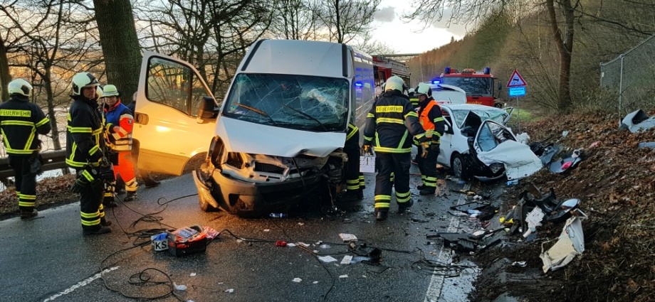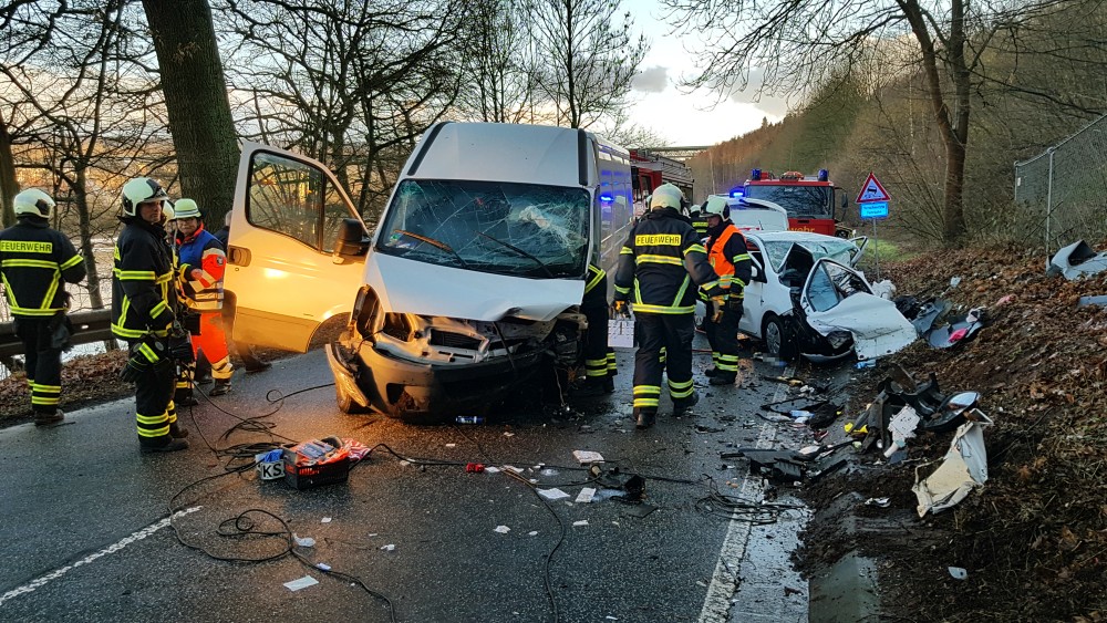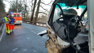 Fuldabrück – Am Montagnachmittag gegen 15.50 Uhr kam es auf der L3124 zwischen Kassel Niederzwehren und Fuldabrück-Dennhausen etwa in Höhe „Gut Freienhagen“ zu einem schweren Verkehrsunfall. Nach ersten Informationen der Polizei ist ein Kleintransporter mit einem PKW frontal zusammengestoßen. In den Fahrzeugen wurden zwei Personen massiv eingeklemmt und mussten von der Feuerwehr Fuldabrück mit hydraulischem Gerät befreit werden. Zwei weitere Personen befanden sich ebenfalls in den Fahrzeugen.