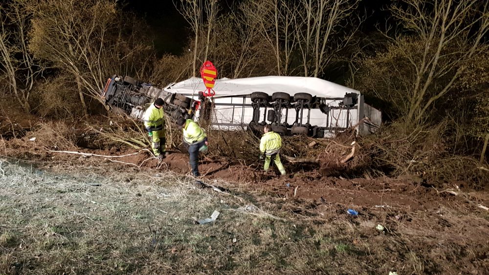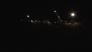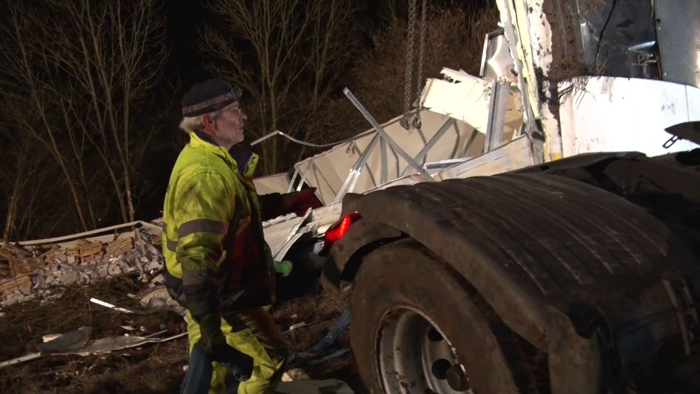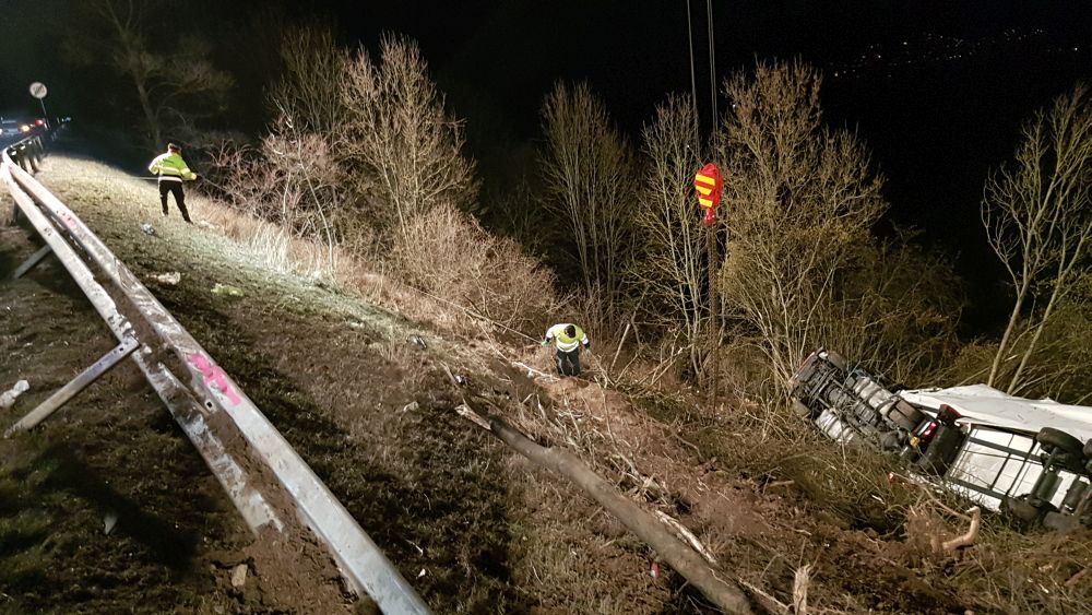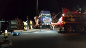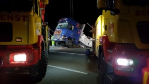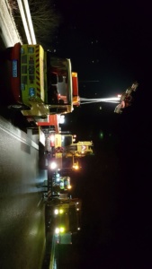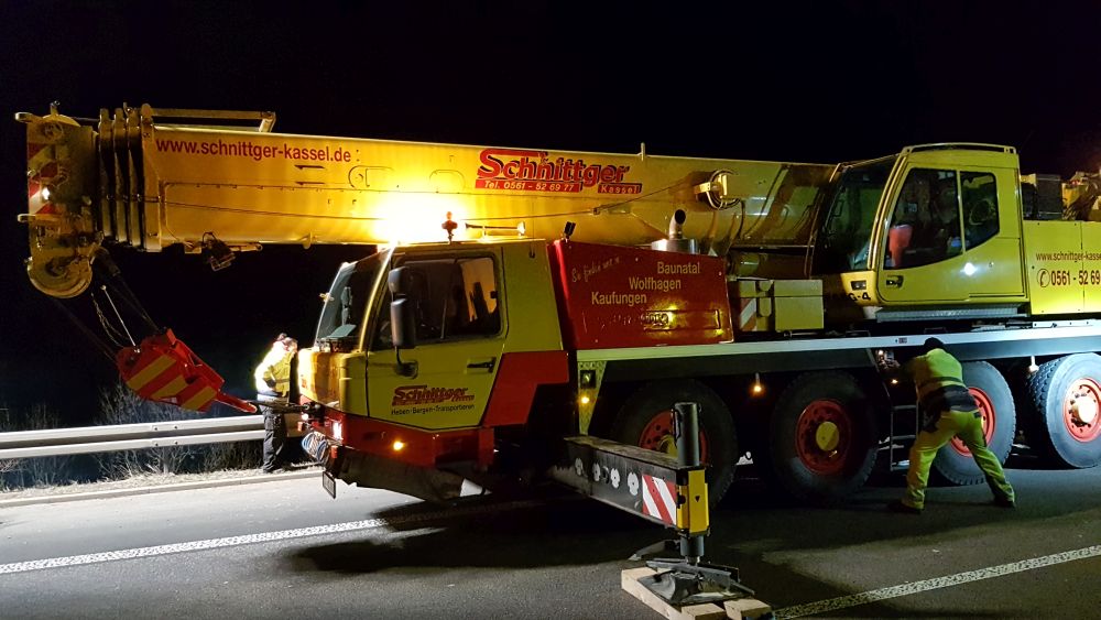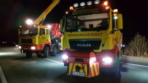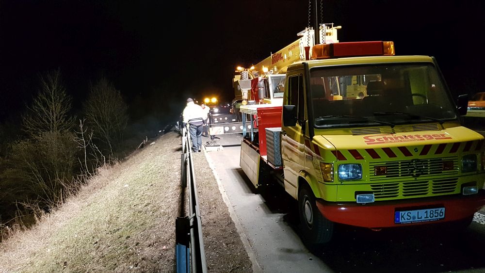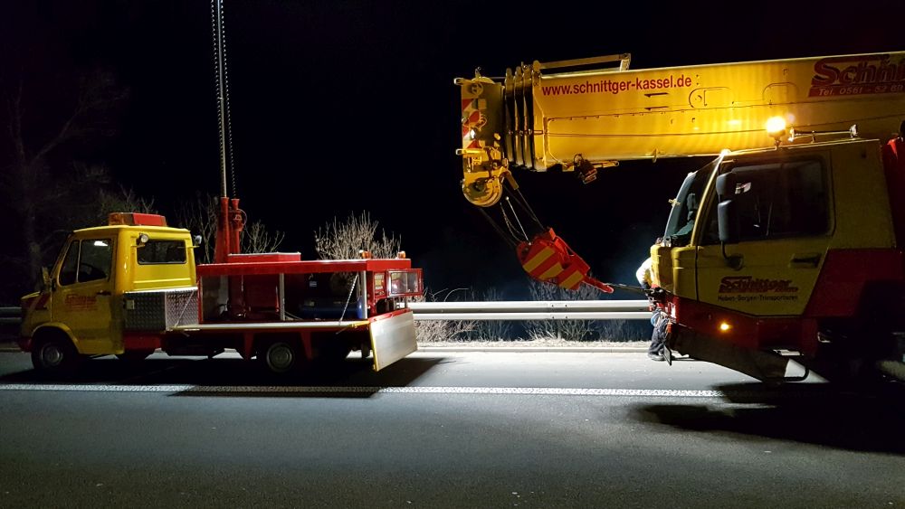 Auf Grund der aufwendigen Bergung, wurde der Termin in die Nachtstunden gelegt. Mehrere Abschleppfahrzeuge und zwei Kräne waren nötig den 40-Tonner zu bergen. Zunächst mussten die Bäume rund um den Sattelzug entfernt werden. Mit Seilwinden wurde dann der LKW nach oben gezogen, um ihn letztendlich mit einem Kran auf die Strasse zu stellen. Während des gesamten Einsatzes musste die A44 bis in die frühen Morgenstunden voll gesperrt werden
