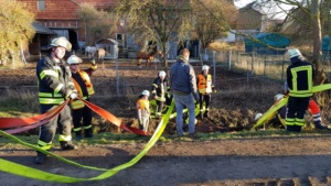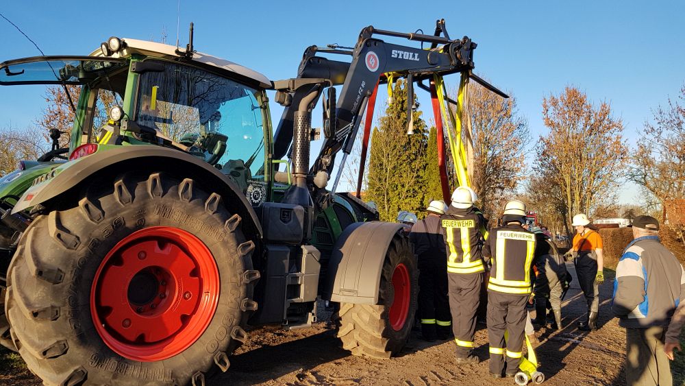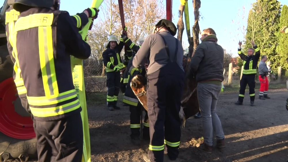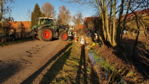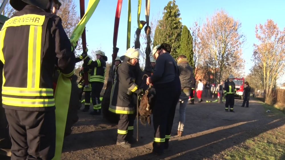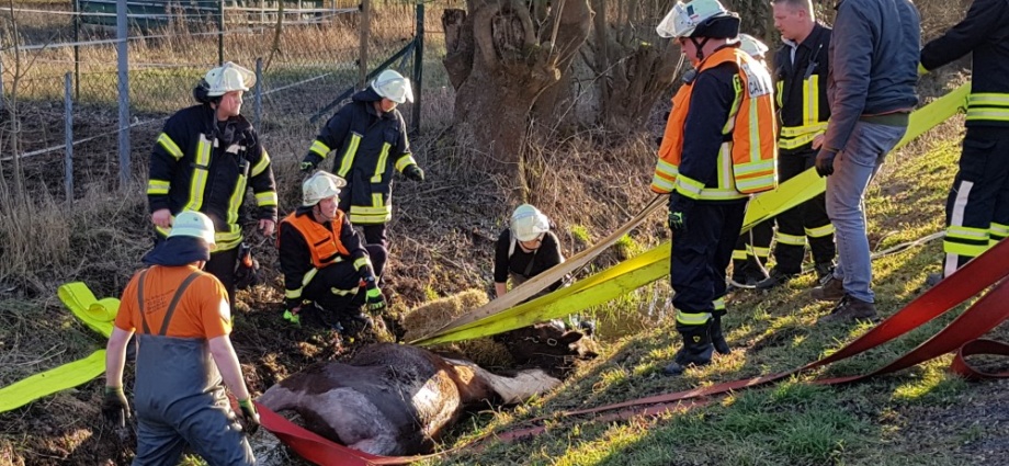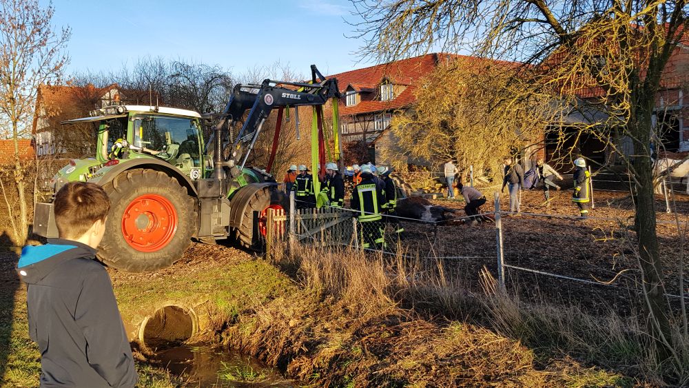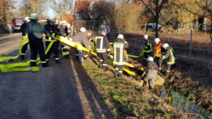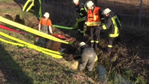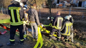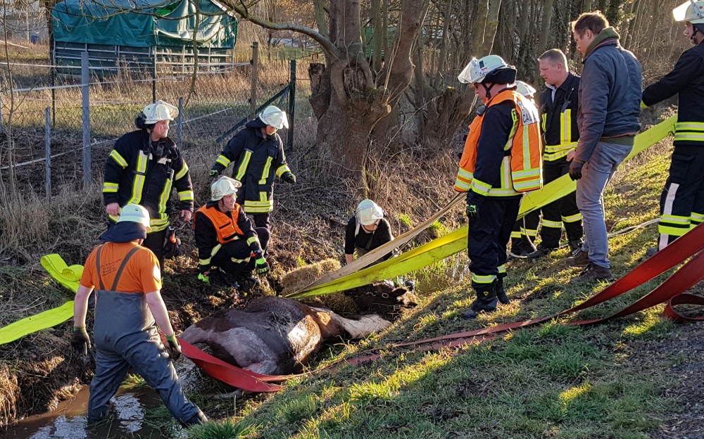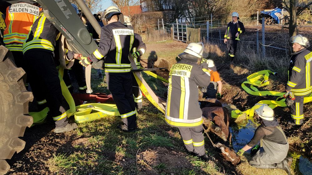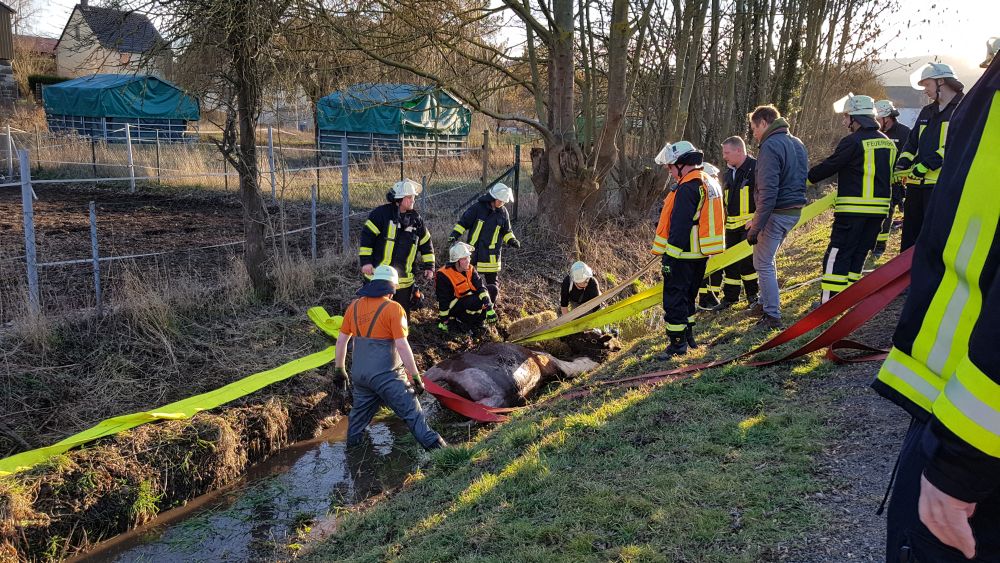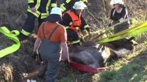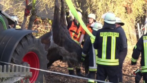 Mit Schläuchen an jedem Bein konnte das Pferd dann mit Hilfe eines Traktors auch dem Graben gehoben werden. Auch wenn die Rettung des Tieres sehr zügig voran ging, mussten die Helfer vor Ort dafür Sorge tragen, dass das Pferd nicht in dem Bach ertrinken konnte. Zunächst wurde der Kopf des Tieres von den Kameraden der Feuerwehr hoch gehalten und dann mit Hilfe von Heuballen fixiert. Nach gut einer Stunde hatte das Pferd die Rettung überstanden. Augenscheinlich blieb das Tier unverletzt, dennoch kann erst nach einer genaueren Untersuchung geklärt werden, ob tatsächlich alles gut gegangen ist.