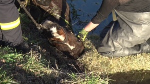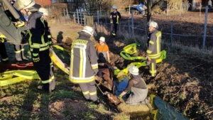 Calden – Einen besonderen Einsatz musste die Feuerwehr in Calden-Ehrsten am Montagnachmittag gegen 16.00 Uhr abarbeiten. Beim Überqueren eines Bachlaufes wurde ein Pferd von einem anderen geschubst und stürze in den darunter liegenden Flutgraben. Das Tier kam dann in Rückenlage zum liegen und konnte sich nicht mehr selbst aus seiner misslichen Lage befreien. Sofort wurden Feuerwehr und Veterinär verständigt. Nachdem das Tier mit Medikamenten ruhig gestellt werden konnte, nahm die Feuerwehr Ihre Arbeit auf.