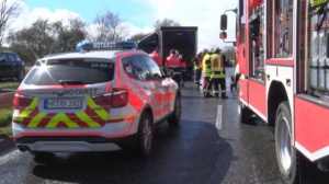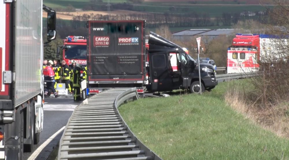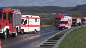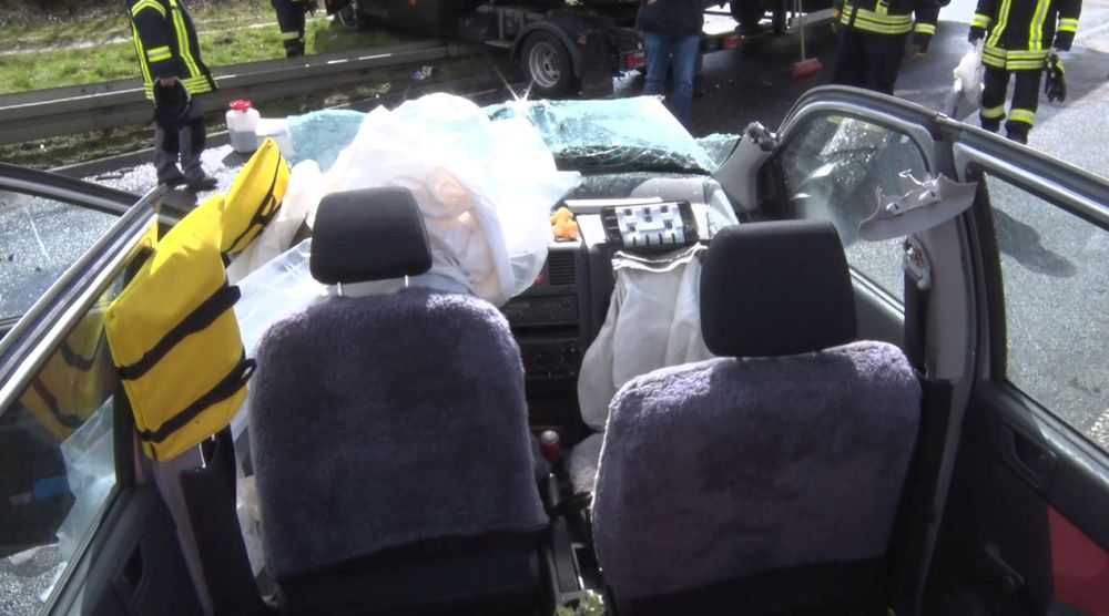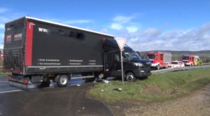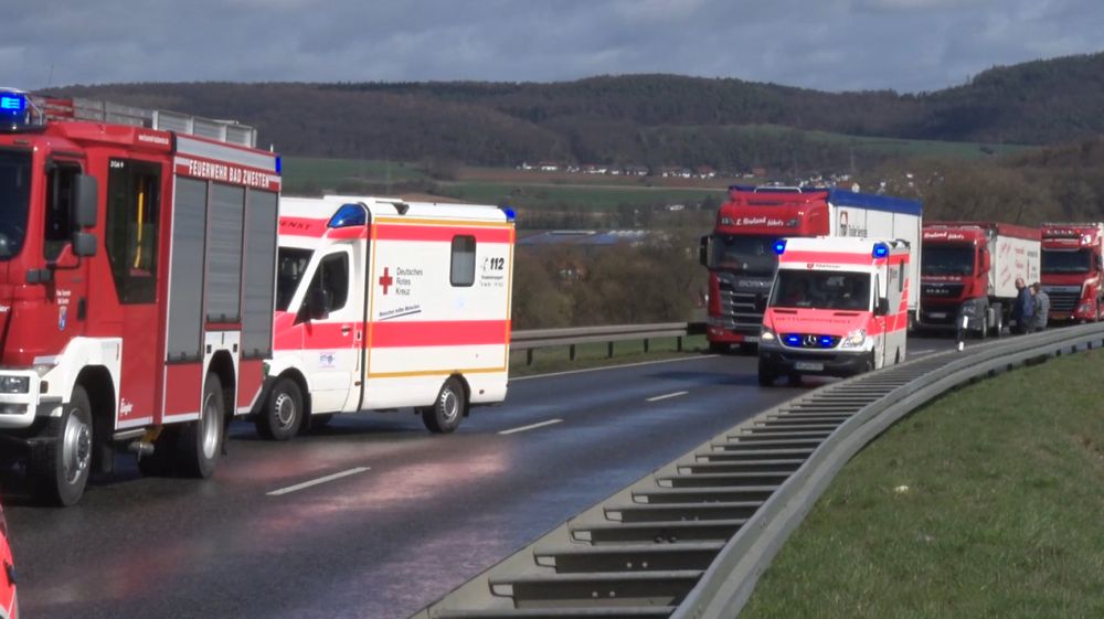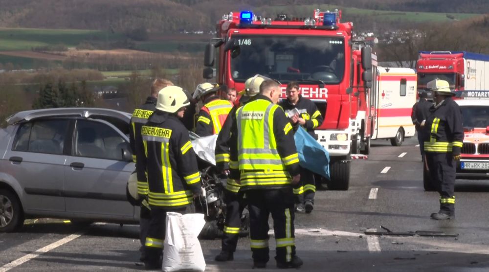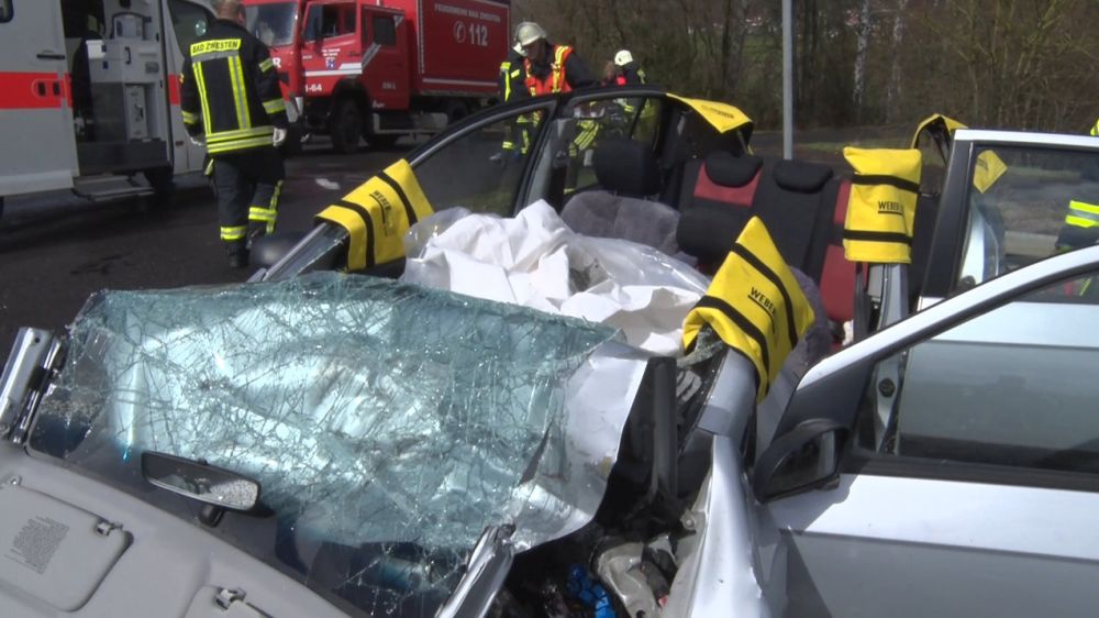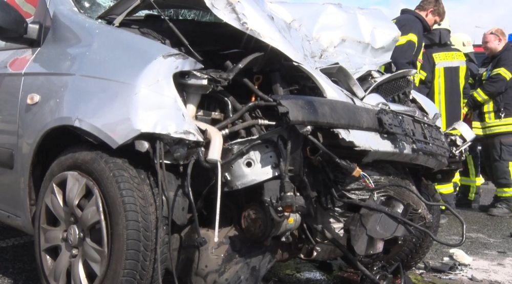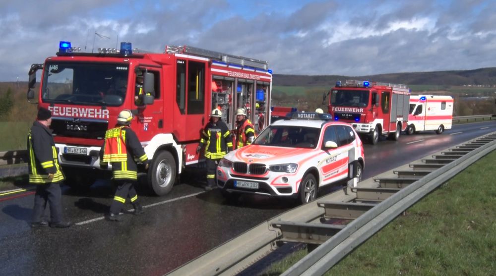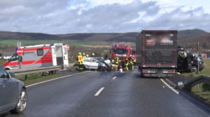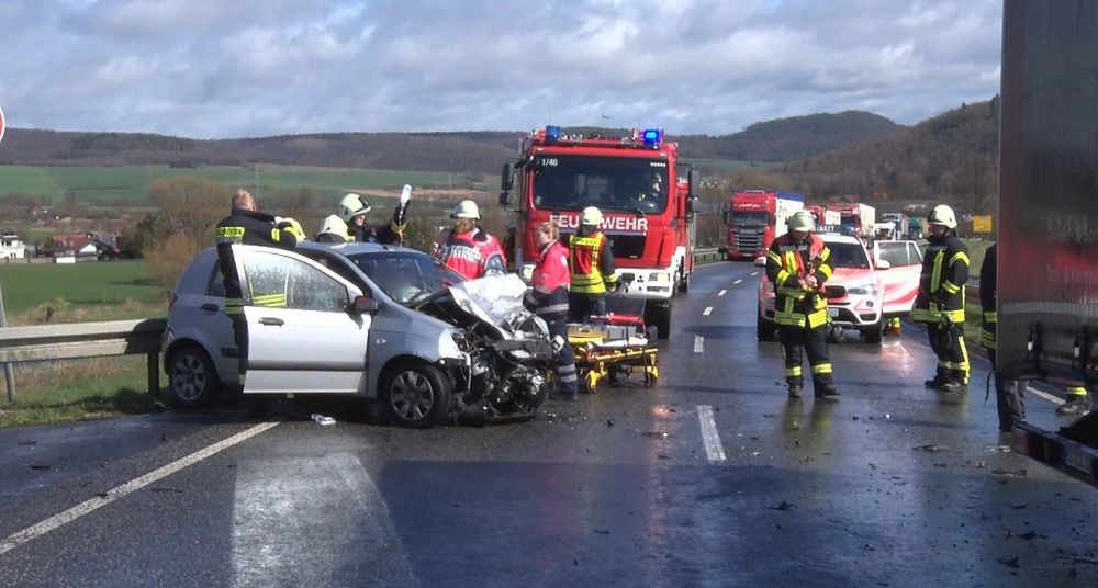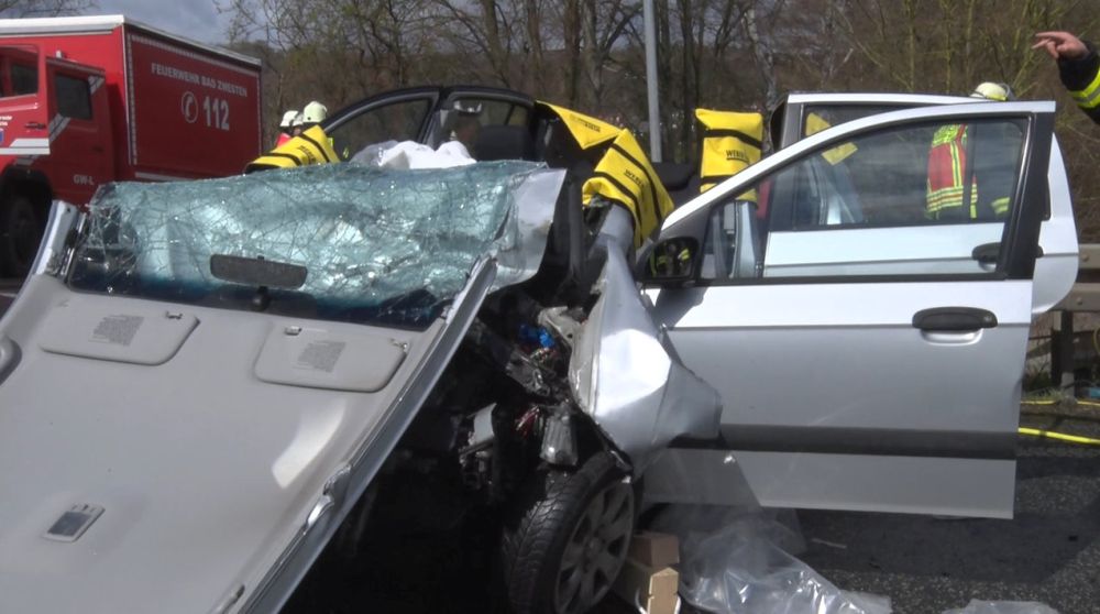 Durch den unvermeidlichen Zusammenprall wurde die Jesbergerin mit ihrem Fahrzeug auf die Gegenfahrbahn abgewiesen und stieß dort frontal mit einem LKW zusammen, der von einem 59-jährigen Mann aus Eschwege gesteuert wurde. Während der 82 Jährige leicht verletzt wurde und mit seinem Fahrzeug wenige Meter hinter der Unfallstelle zum stehen kam, knickte die Zugmaschine des LKW ein und wurde vom Auflieger seitlich auf die Leitplanken geschoben. Der LKW-Fahrer sowie die 68-jährige Frau aus Jesberg wurden durch den Zusammenprall schwer verletzt, glücklicherweise aber nicht eingeklemmt. Der Eschweger konnte sein Fahrzeug eigenständig verlassen. Aufgrund ihrer Verletzungen wurde die Jesbergerin schonend aus ihrem Fahrzeug gerettet. Dazu trennte die Feuerwehr das Dach des Fahrzeuges ab. Insgesamt waren drei Rettungswagen, eine Notärztin, die Feuerwehren aus Bad Zwesten und Jesberg, sowie die Polizei Fritzlar vor Ort im Einsatz. Die Schadenshöhe liegt bei rund 50000 Euro. Die Bundesstraße war während der Rettungs- und Bergungsmaßnahmen in beide Richtungen voll gesperrt.