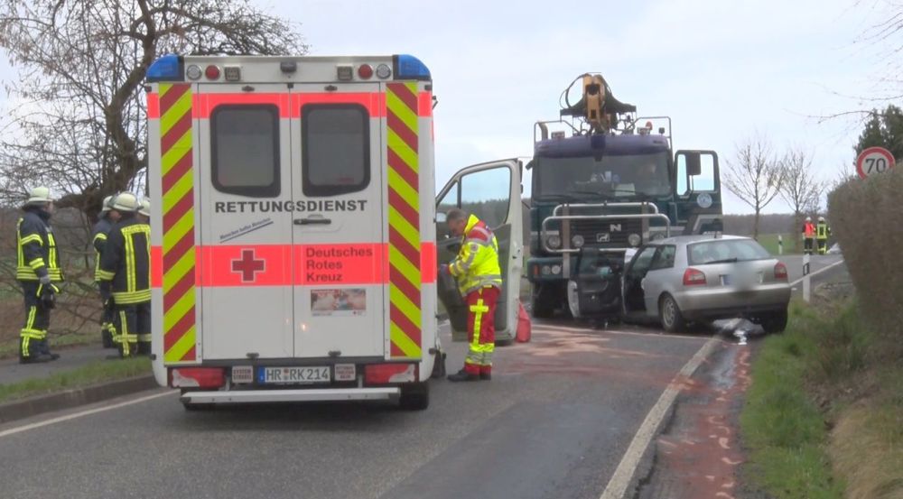 Obwohl dieser noch versuchte den Zusammenstoß zu verhindert, krachte der Frielendorfer in den Laster. Das Fahrzeug wurde in der Front komplett zerstört. Ersthelfer sowie die Einsatzkräfte von Feuerwehr und Rettungsdienst konnten den Mann ohne hydraulische Geräte aus seinem Wagen befreien. Nach seiner Erstversorgung wurde der Mann mit dem Rettungshubschrauber in eine Klinik nach Kassel geflogen. Der 56-jährige Jesberger blieb unverletzt. Neben der Feuerwehr Frielendorf waren zwei Rettungswagen, ein Notarzt, der Rettungshubschrauber Christoph-7 sowie die Polizei vor Ort im Einsatz. Die K53 war während der Rettungs- und Bergungsmaßnahmen voll gesperrt.