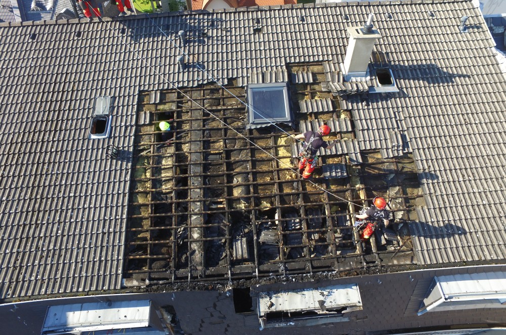 Anschließend wurde die Dachfläche des Wohnhauses von Einsatzkräften des Sonderdienstes Höhenrettung großflächig geöffnet um noch vorhandene Glutnester aufzufinden und gezielt abzulöschen. Abschließend wurde die geöffnete Dachfläche von den Höhenrettern der Feuerwehr provisorisch mit Folie wieder abgedichtet. Eine Dachgeschosswohnung ist aufgrund von Feuer und Rauch unbewohnbar, die Wohnungen in den darunter liegenden Geschossen blieben unversehrt. Am Einsatz waren die Freiwillige Feuerwehr Höchst sowie Kräfte von Berufsfeuerwehr und Rettungsdienst mit insgesamt rund 50 Einsatzkräften beteiligt. Verletzt wurde niemand. Die Höhe des entstandenen Sachschadens wird im sechsstelligen Bereich liegen. Die Brandursache ist noch unbekannt und wird von der Polizei ermittelt. Zum Zeitpunkt vom Versand dieser Pressemeldung dauern die Einsatzmaßnahmen der Feuerwehr noch an.