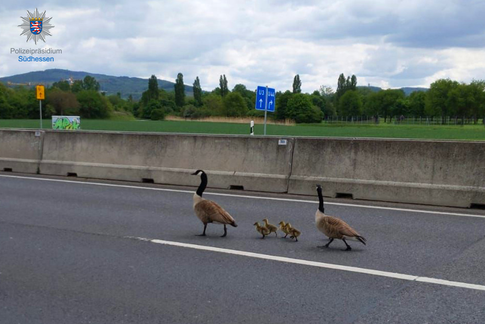 Bensheim – Eine Gänsefamilie sorgte am Sonntagmittag für eine kurzzeitige Sperrung der B47 bei Bensheim. Nachdem Verkehrsteilnehmer vergeblich versucht hatten, die beiden Elterntiere von der Bundesstraße fernzuhalten, wandten sich diese an die Polizei. Zunächst waren zwei Polizeibeamte damit beschäftigt, die Elterntiere über eine Strecke von etwa 100 Meter, davon abzuhalten, auf die Bundesstraße zu watscheln. Als dies gelang, tauchten im tiefen Gras die fünf Küken der Gänseeltern auf und die gesamte Familie setzte sich in Richtung Bensheim auf der Suzukiallee in Bewegung.