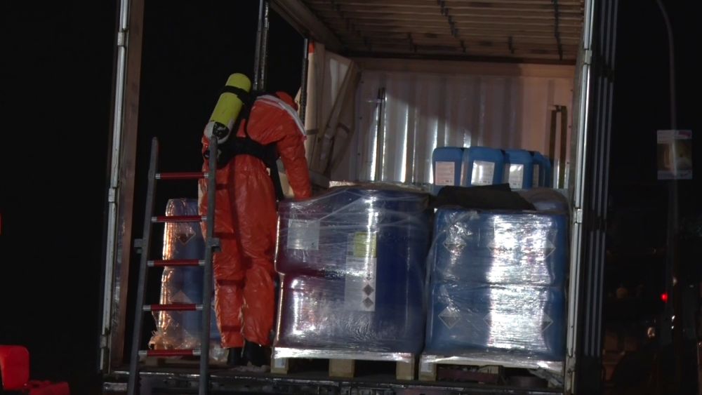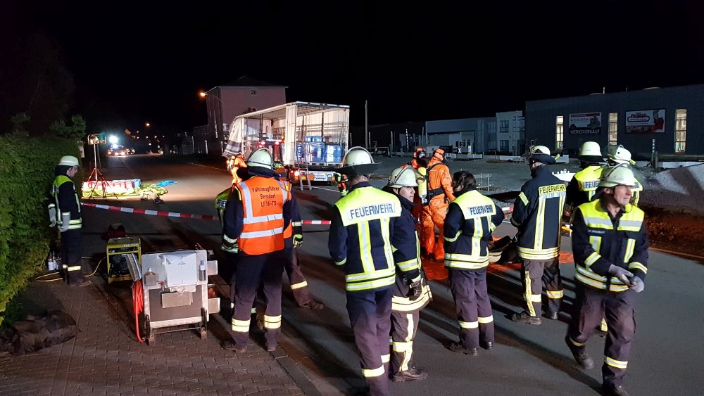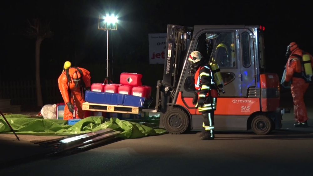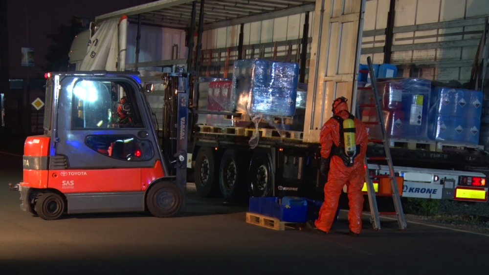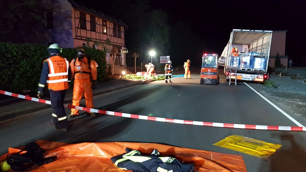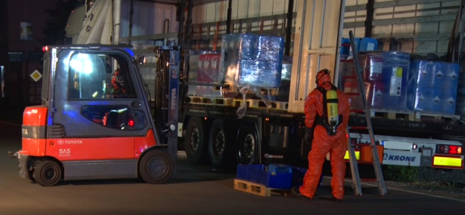 Die Feuerwehr sperrte den näheren Gefahrenbereich ab. Die Auswertung der Ladelisten ergab, dass der LKW säurehaltige und alkalische Reinigungskonzentrate für die lebensmittelverarbeitende Industrie geladen hatte, die überwiegend biologisch abbaubar sind. Im Falle einer Vermischung könnte es aber zur Bildung von gesundheitsschädlichen Chlorgas kommen. Die Feuerwehren entluden den Auflieger des LKW mit Schutzkleidung und Atemschutzgeräten. Die Kanister mit der Reinigungsflüssigkeit wurden per Hand vollständig in geeignete Container umgeladen. Insgesamt waren 5 Kanister mit je 25 Liter beschädigt, die mit einem Gabelstabler getrennt aufgenommen werden mussten. Die ausgelaufenen Stoffe konnte die Feuerwehr aufnehmen und entsorgen.