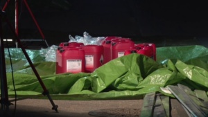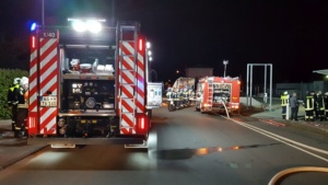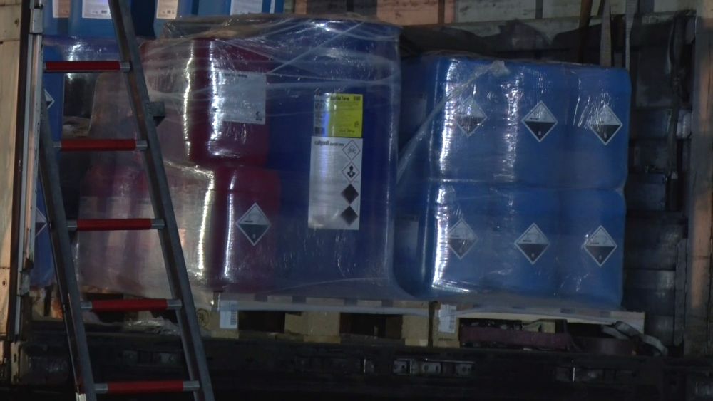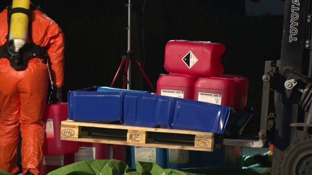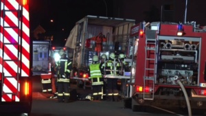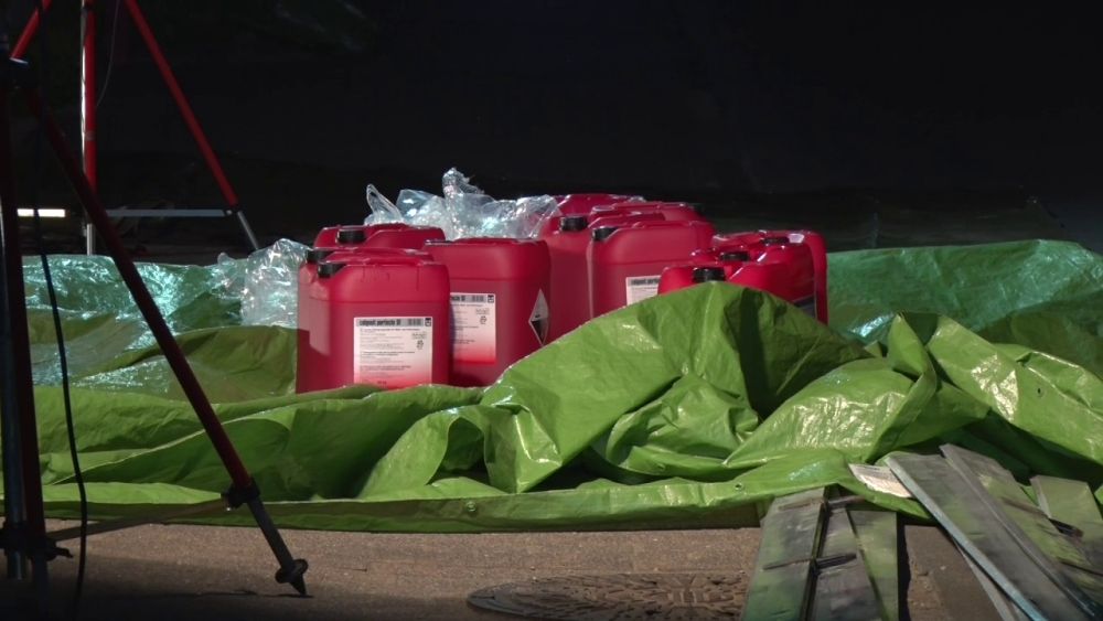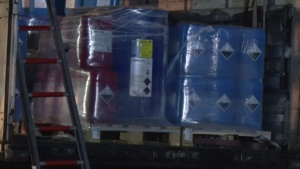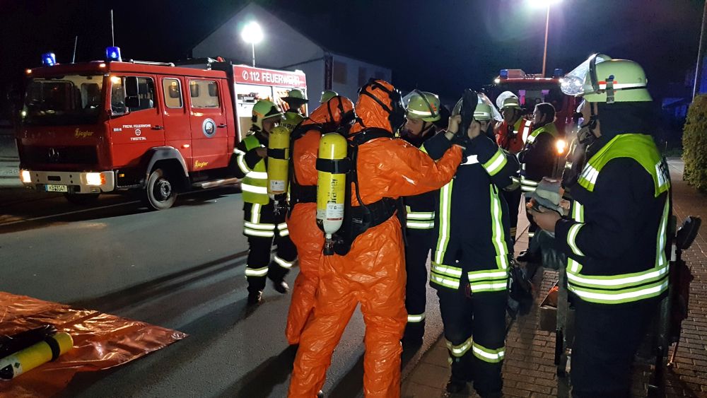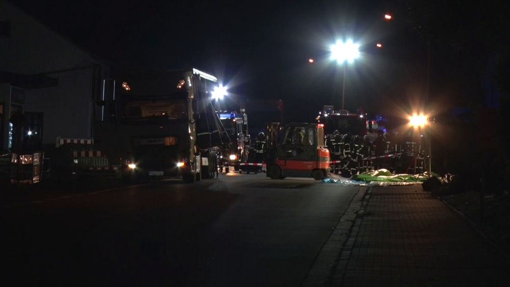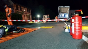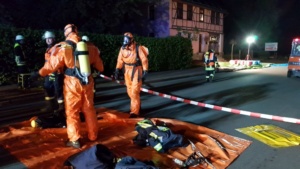 Die Feuerwehr sperrte den näheren Gefahrenbereich ab. Die Auswertung der Ladelisten ergab, dass der LKW säurehaltige und alkalische Reinigungskonzentrate für die lebensmittelverarbeitende Industrie geladen hatte, die überwiegend biologisch abbaubar sind. Im Falle einer Vermischung könnte es aber zur Bildung von gesundheitsschädlichen Chlorgas kommen. Die Feuerwehren entluden den Auflieger des LKW mit Schutzkleidung und Atemschutzgeräten. Die Kanister mit der Reinigungsflüssigkeit wurden per Hand vollständig in geeignete Container umgeladen. Insgesamt waren 5 Kanister mit je 25 Liter beschädigt, die mit einem Gabelstabler getrennt aufgenommen werden mussten. Die ausgelaufenen Stoffe konnte die Feuerwehr aufnehmen und entsorgen.