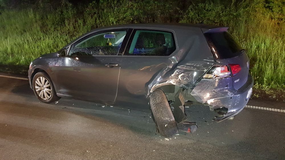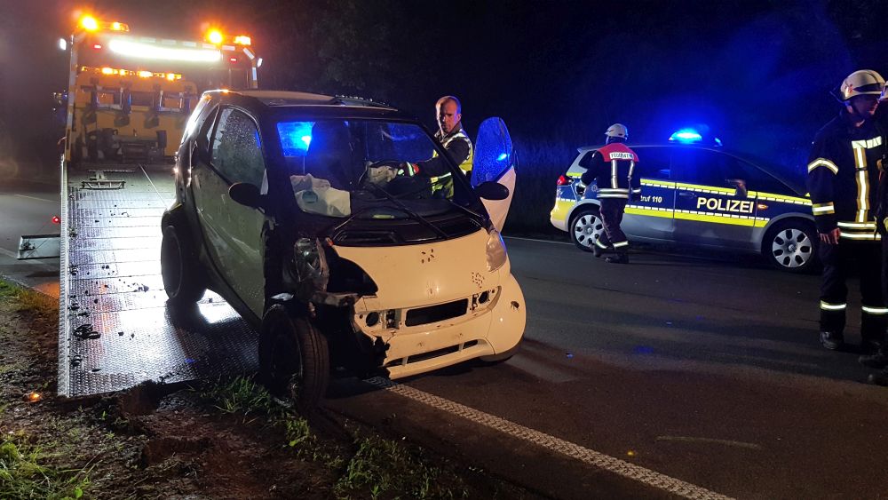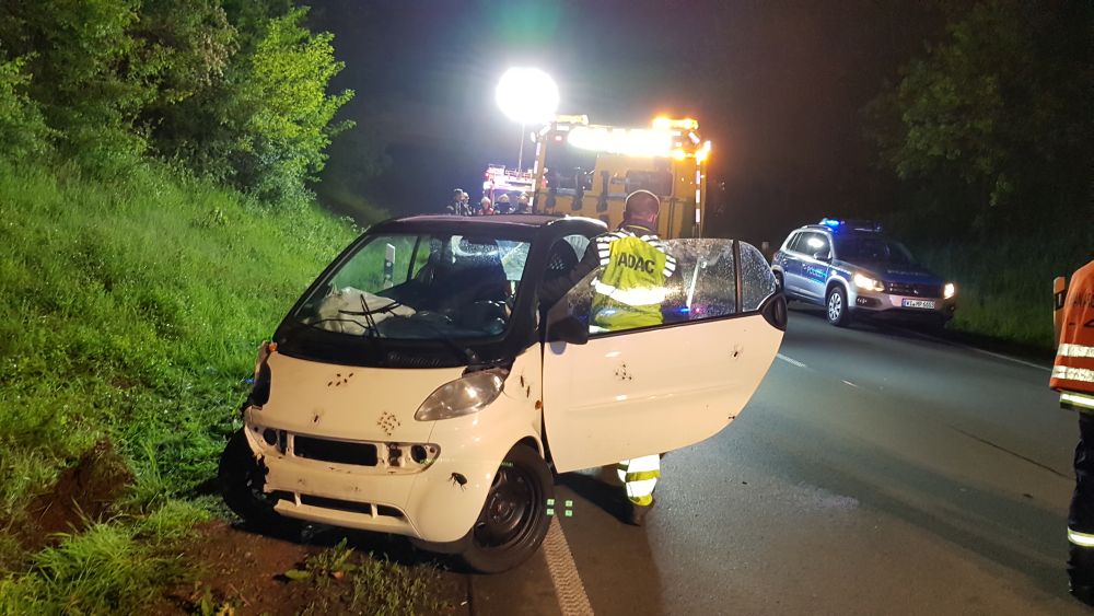 Bad Arolsen – Auf der B 252 zischen Bad Arolsen und Diemelstadt-Rhoden kam es am Dienstag gegen 22.10 Uhr zu einem Verkehrunfall mit zwei PKW. Nach Angaben der Polizei hatte ein Reh die Fahrbahn gewechselt, worauf der Fahrer eines VW Golf sein Fahrzeug abgebremst hatte. Ein nachfolgender Smart Fahrer erkannte dies offensichtlich viel zu spät und krachte dem vor ihm fahrenden in die linke Heckseite. Hierbei verlor der Smartfahrer die Kontrolle über sein Fahrzeug, überschlug sich und kam in einem Graben zum liegen.