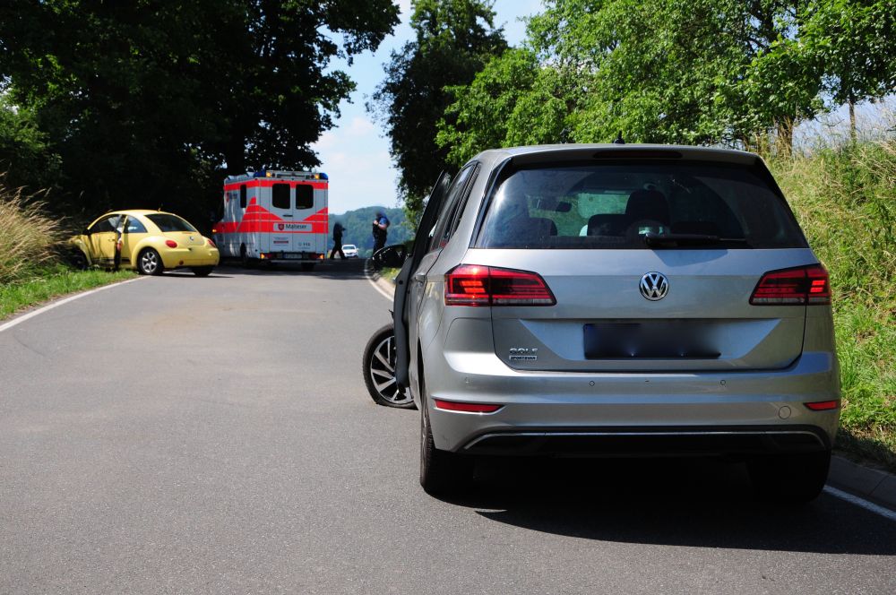 Niedenstein – Zu einem Verkehrsunfall mit zwei verletzten Personen kam es am Montagnachmittag auf der K 82 zwischen Kirchberg und Riede. Ein 53-jähriger Mann aus Arolsen befuhr mit seinem VW Beatle die Kreisstraße von Kirchberg in Richtung Bundesstraße. Ihm entgegen kam ein 76-jähriger Fahrzeugführer eines VW Golf aus Naumburg. Aus bislang ungeklärten Umständen stießen beide Fahrzeuge auf der schmalen Straße seitlich versetzt zusammen.