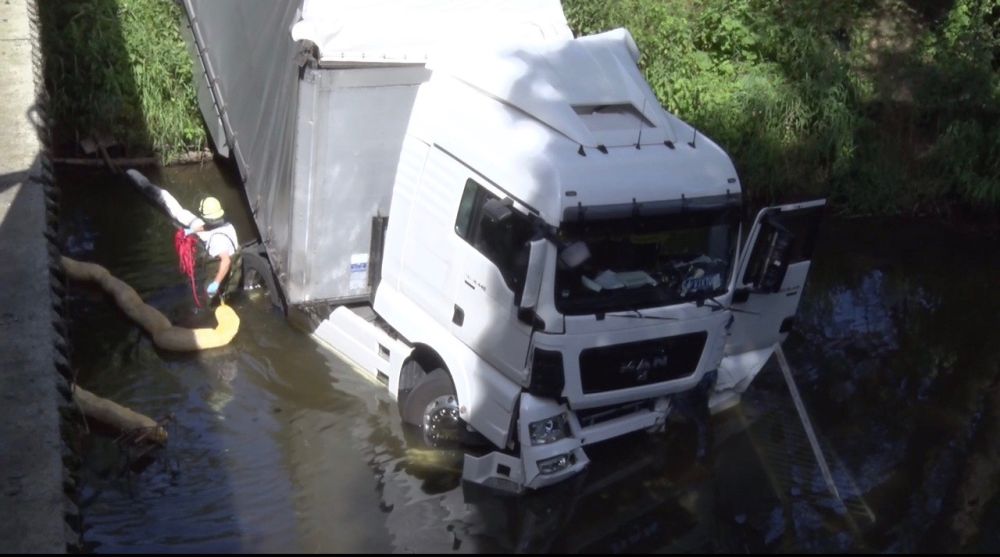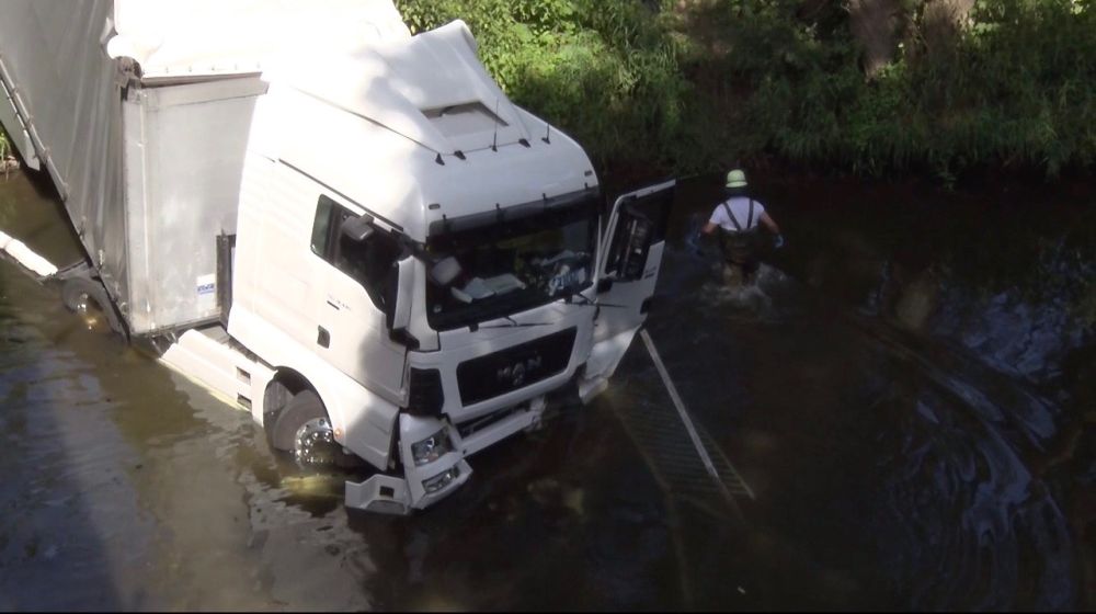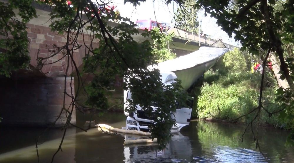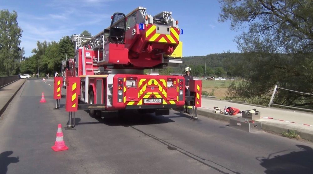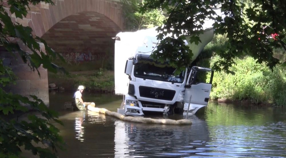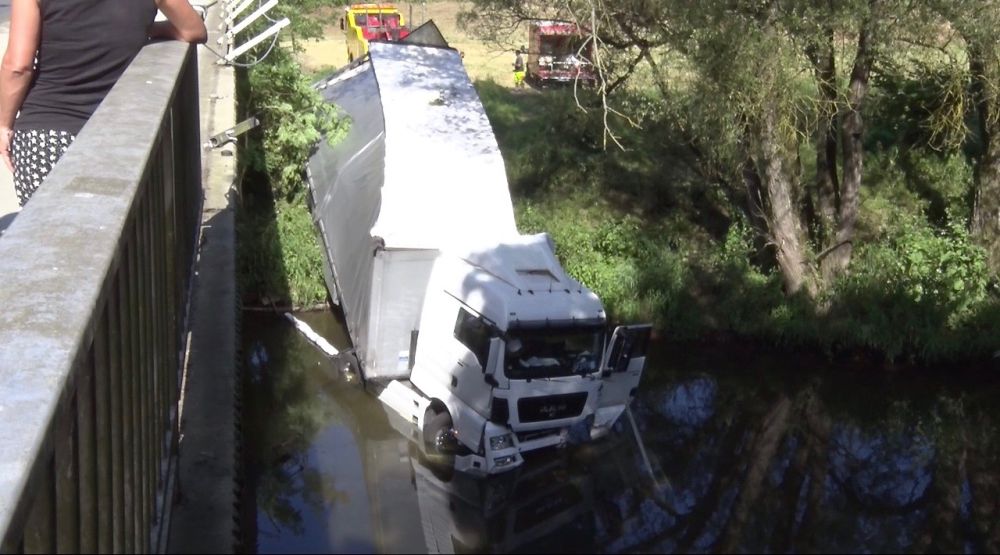 Kurz hinter dem Ortsausgangsschild von Cölbe geriet der 61-Jährige auf einer Lahnbrücke mit dem rechten Vorderrad an den Bordstein eines Fußgängerweges. Von diesem wurde er abgewiesen, querte die Straße, fuhr einen Gehweg hinauf und durchbrach das Brückengeländer. Obwohl der Mann noch eine Gefahrenbremsung einleitete, konnte er den Sturz in die Tiefe nicht mehr verhindern. Der Sattelzug fiel rund acht Meter tief und landete auf den Rädern. Durch die enorme Wucht des Aufpralls wurde der Fahrer glücklicherweise nur leicht verletzt. Während die Zugmaschine im Gewässer der Lahn landete und erheblich beschädigt wurde, blieb der Auflieger mit völlig verzogenem Aufbau an einer Böschung liegen. Weil durch den Unfall ein Dieseltank aufgerissen wurde, musste die Feuerwehr insgesamt drei Ölsperren auf der Lahn errichten. Das Brückengeländer wurde auf einer Länge von rund 30 Metern komplett zerstört. Die gesamtem Schadenshöhe ist derzeit noch nicht bekannt. Die Straße zwischen Wehrda und Cölbe war für mehrere Stunden voll gesperrt.