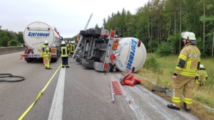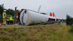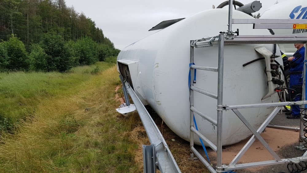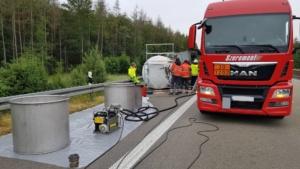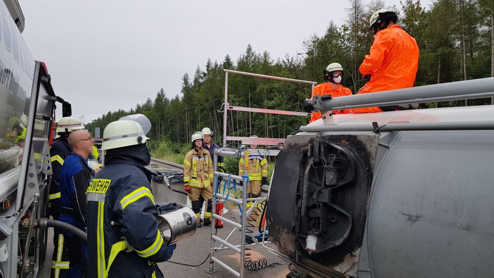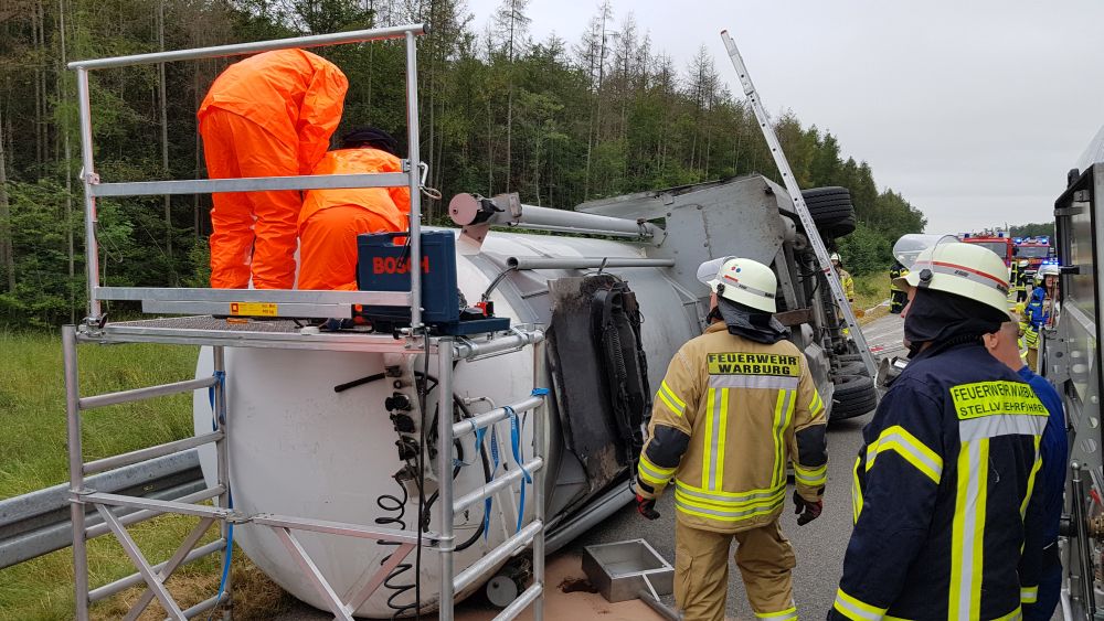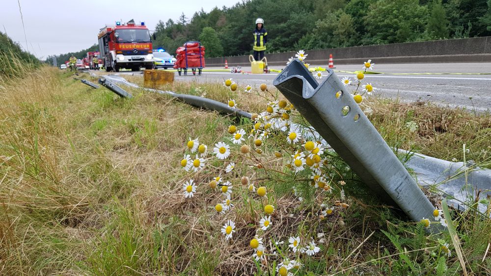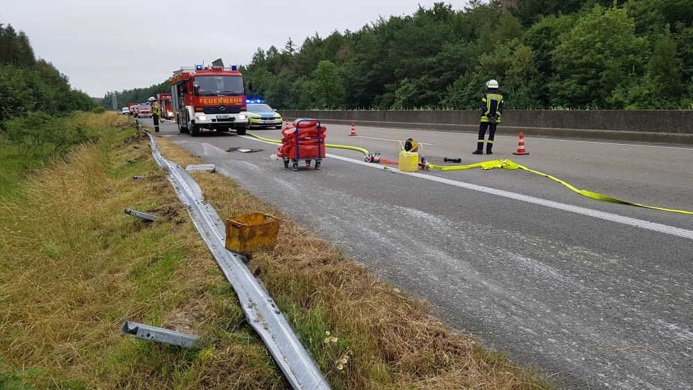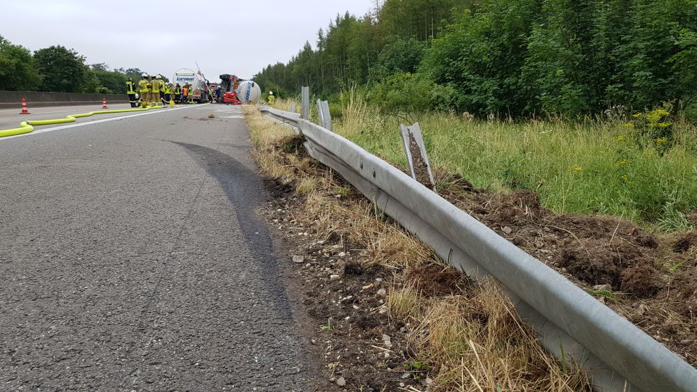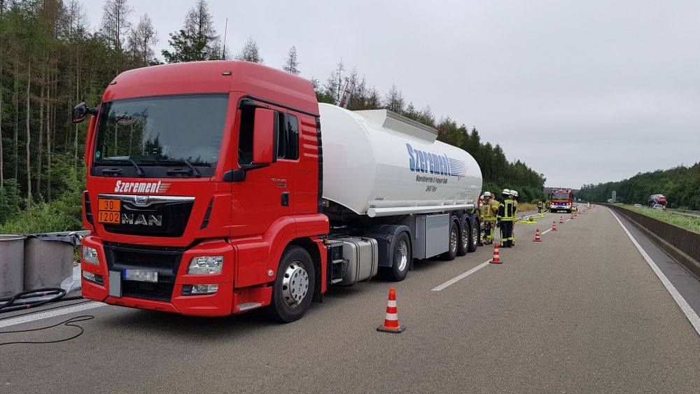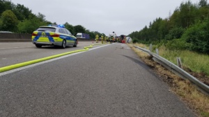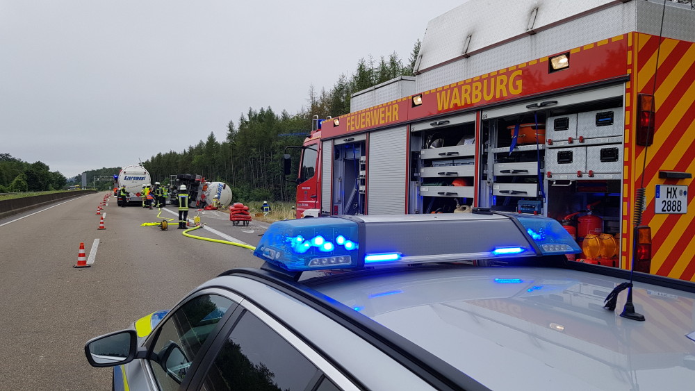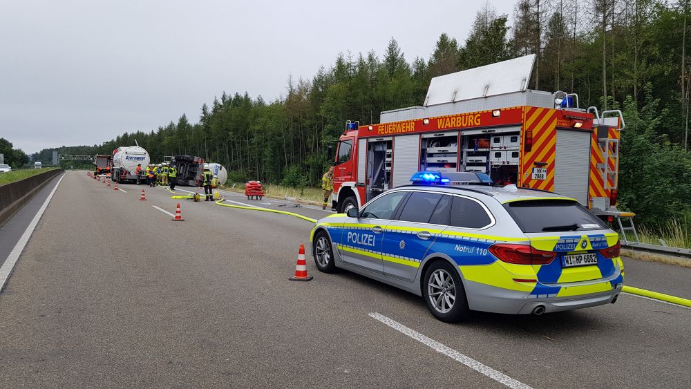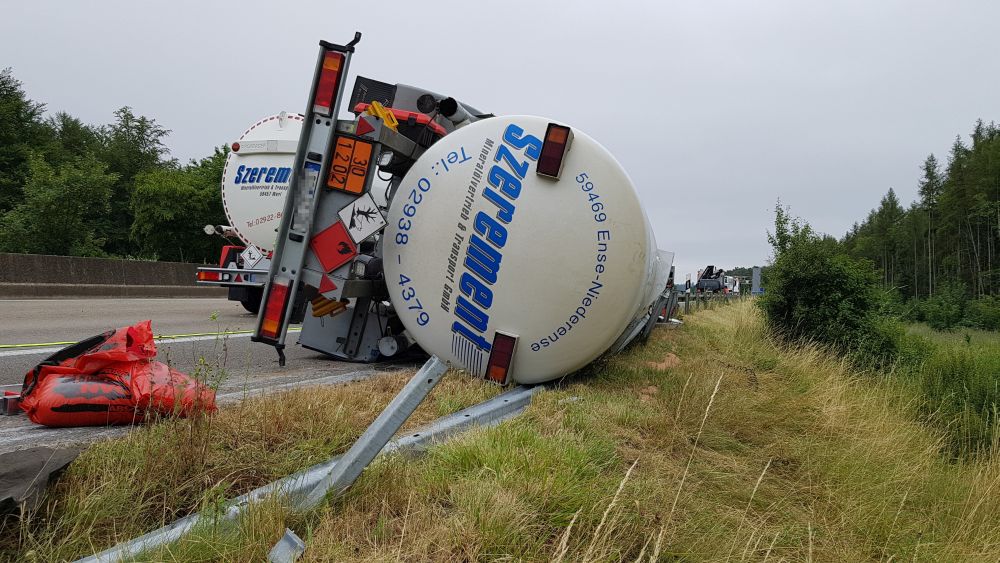 Wie die Autobahnpolizisten zum Unfallhergang berichten, könnte ein Reifenplatzer am Sattelauflieger für den Unfall verantwortlich sein. Der aus dem Landkreis Soest in Nordrhein-Westfalen stammende 39-jährige Fahrer des Sattelzuges hatte gegen 7:20 Uhr zwischen Warburg und Breuna vermutlich beim Gegenlenken die Kontrolle über den Lkw verloren. Der Auflieger hatte sich anschließend aufgeschaukelt, war vom Zugfahrzeug abgebrochen und umgekippt. Auf der Schutzplanke kam der Tanksattelauflieger dann auf der Seite zum Liegen. Ein nachfolgender Autofahrer war anschließend noch über einen auf der Fahrbahn liegenden Bremskeil des verunfallten Lkw gefahren und hatte sich seinen Pkw beschädigt. Der 39-Jährige war bei dem Unfall glücklicherweise nur leicht verletzt worden. Er konnte das Krankenhaus nach ambulanter Behandlung zwischenzeitlich wieder verlassen. Die genaue Höhe des Sachschadens steht derzeit noch nicht fest. Insbesondere das Schadensausmaß hinsichtlich des ins Erdreich gesickerten Öls kann momentan noch nicht benannt werden.