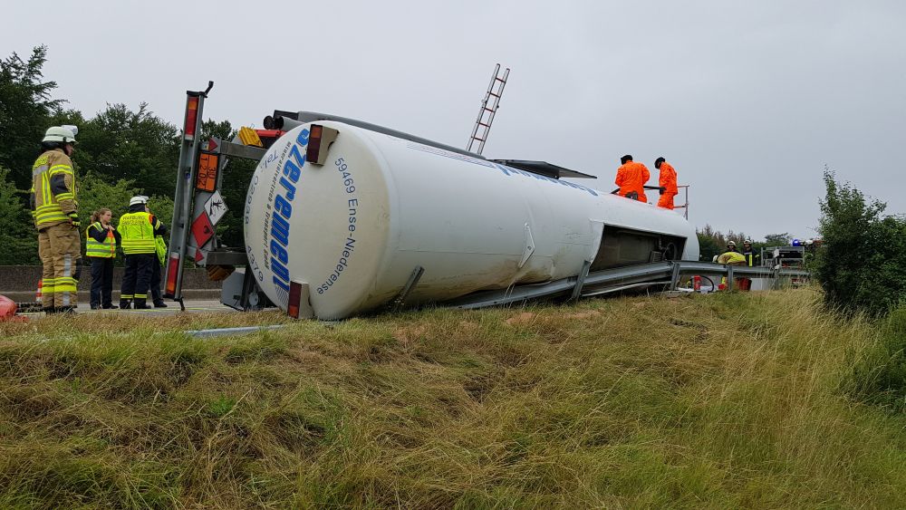 Warburg/Breuna – Gegen 07.20 Uhr krachte es auf der A44 zwischen Warburg und Breuna. Ein mit Heizöl beladener Sattelzug verunglückte und kippte auf die Seite. Was hier genau passiert ist steht derzeit noch nicht fest. Um eine mögliche Katastrophe zu verhindern musste der Tanksilo zunächst leer gepumpt werden, was jedoch Probleme mit sich brachte, denn der Auslauf zum abpumpen lag unter dem Auflieger. Die Feuerwehr musste dann den Tank anbohren um das Umpumpen zu ermöglichen.