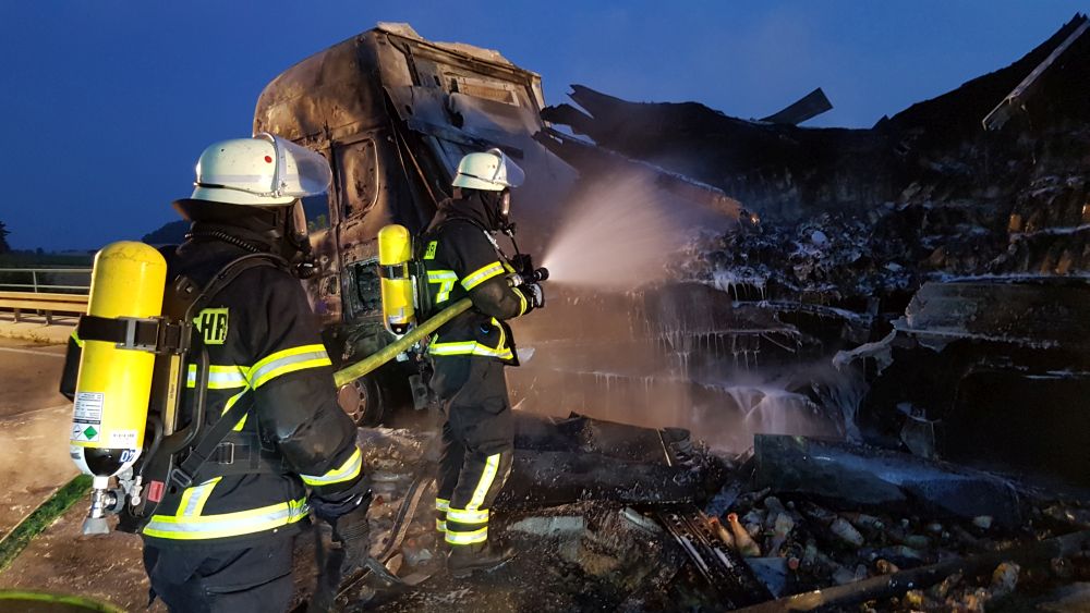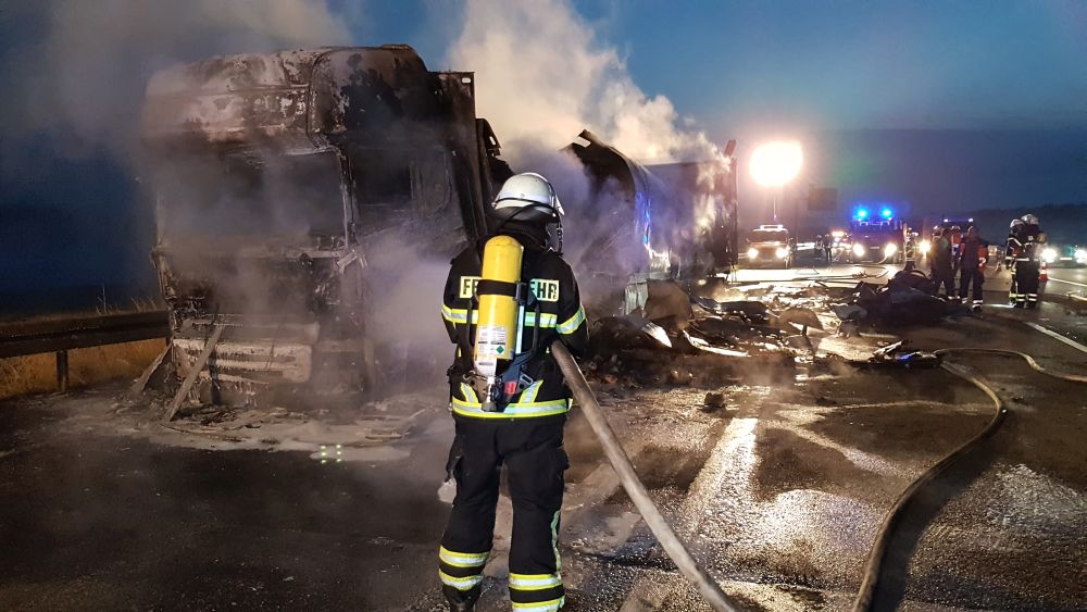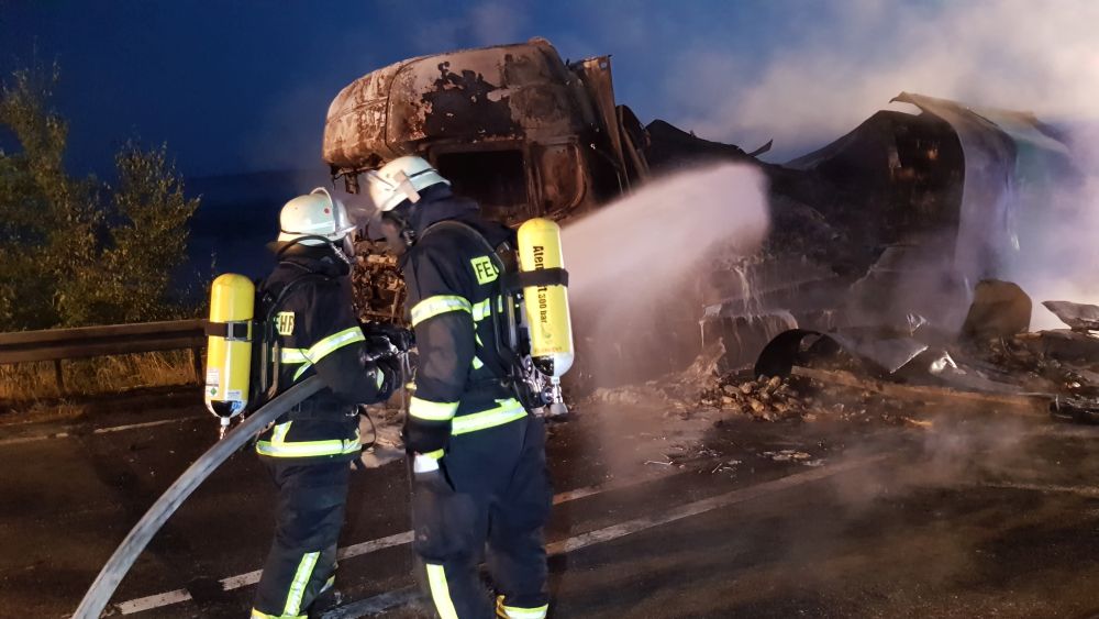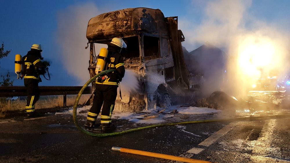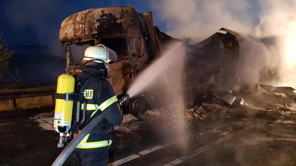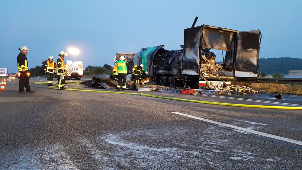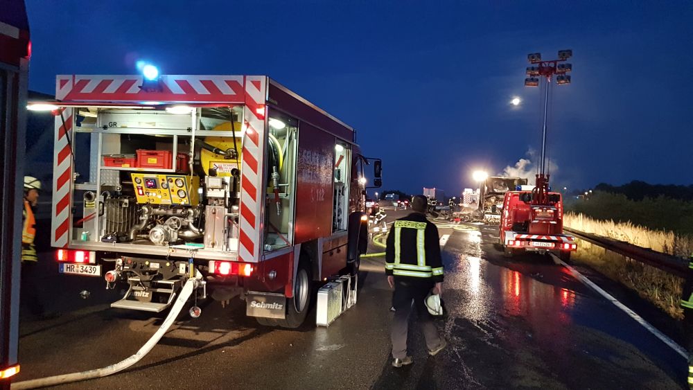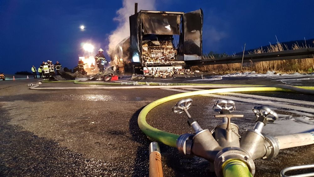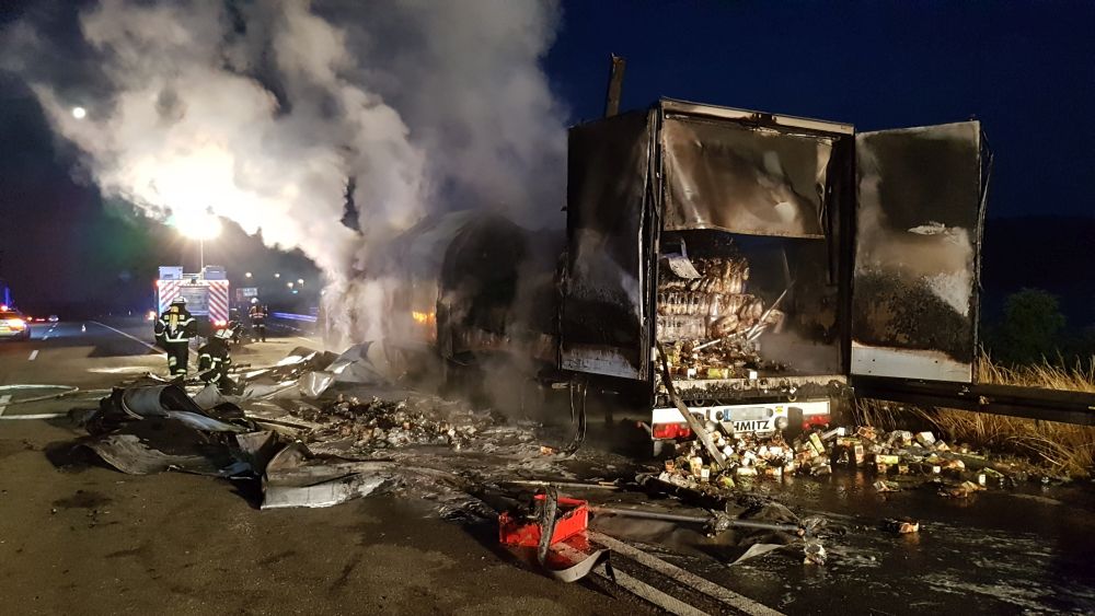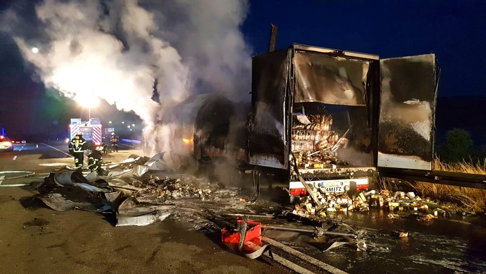 Hierzu kam er jedoch nicht mehr. Der Mann konnte den LKW gerade noch auf dem Standstreifen abstellen. Kurze Zeit später stand der Sattelauflieger bereits im Vollbrand. Während der Löscharbeiten durch die Feuerwehr Melsungen musste die Autobahn kurzzeitig komplett gesperrt werden. Wenig später konnte zumindest eine Fahrspur wieder für den Verkehr frei gegeben werden. Der Fahrer brachte sich rechtzeitig in Sicherheit und wurde glücklicherweise nicht verletzt. Trotz des reibungslosen Ablaufes bei den Löschmaßnahmen kommt es dennoch immer wieder zu Problemen mit der Wasserzufuhr auf der Autobahn. Aus diesem Grund wurde ein Tankfahrzeug der Feuerwehr Homberg nachalarmiert. Am LKW entstand ein Totalschaden der über 100.000 Euro liegen wird. Im Auflieger befanden sich PET Getränkepackungen mit verschiedenen Säften, die beim Brand ebenfalls komplett zerstört wurden. Die Löscharbeiten zogen sich bis in die frühen Morgenstunden hin. Was genau der Grund für den Brand sein könnte, steht aktuell noch nicht fest.